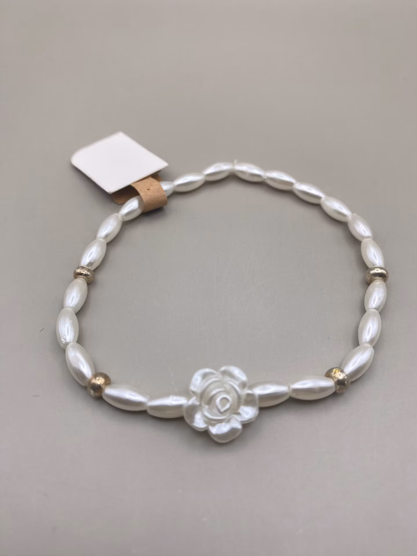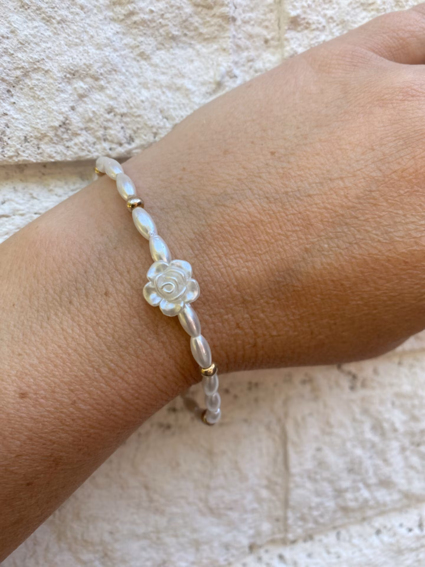 Armband i benvita avlånga pärlor, en söt vit ros i blickfånget, silverfärgade detaljer