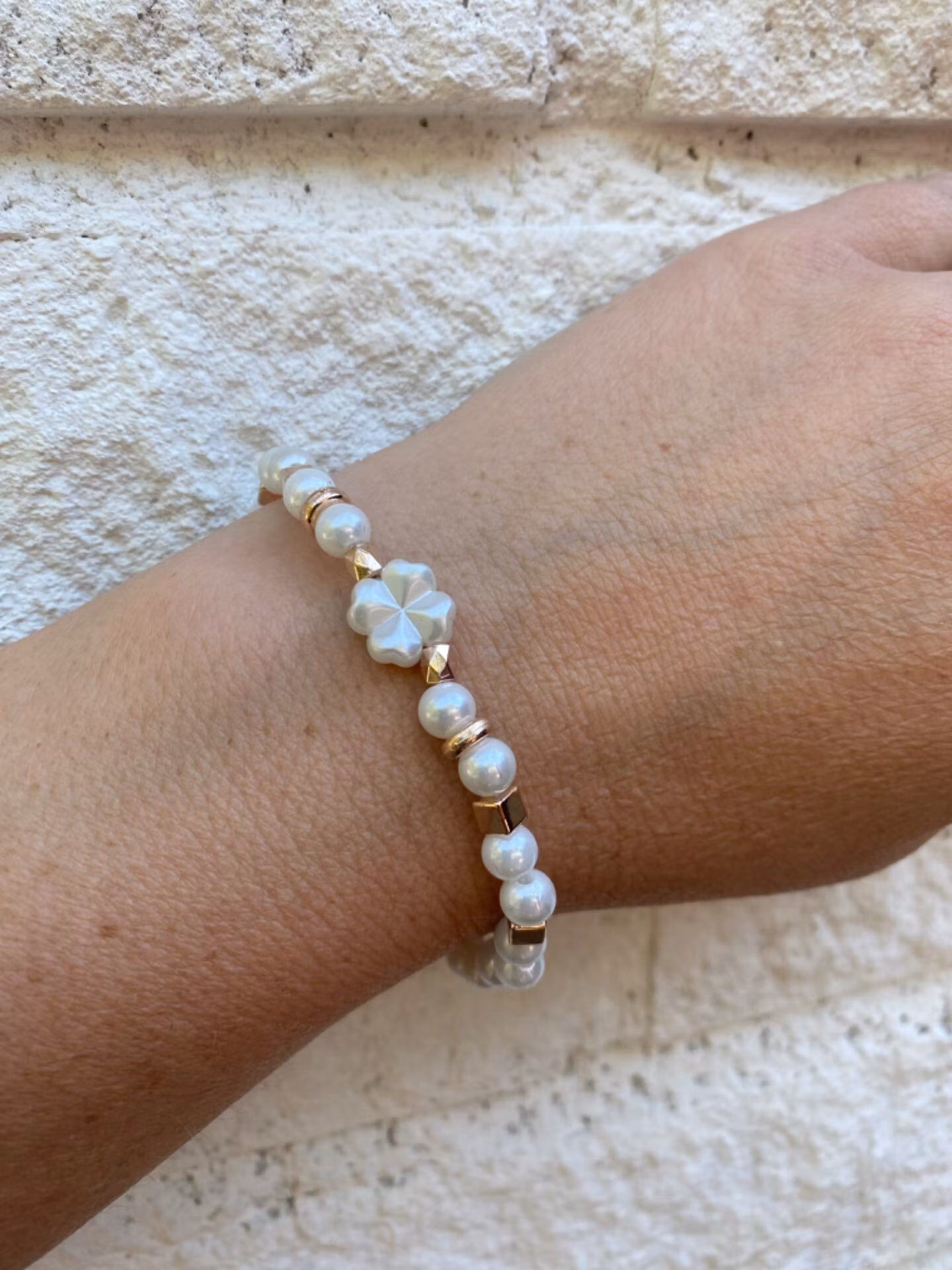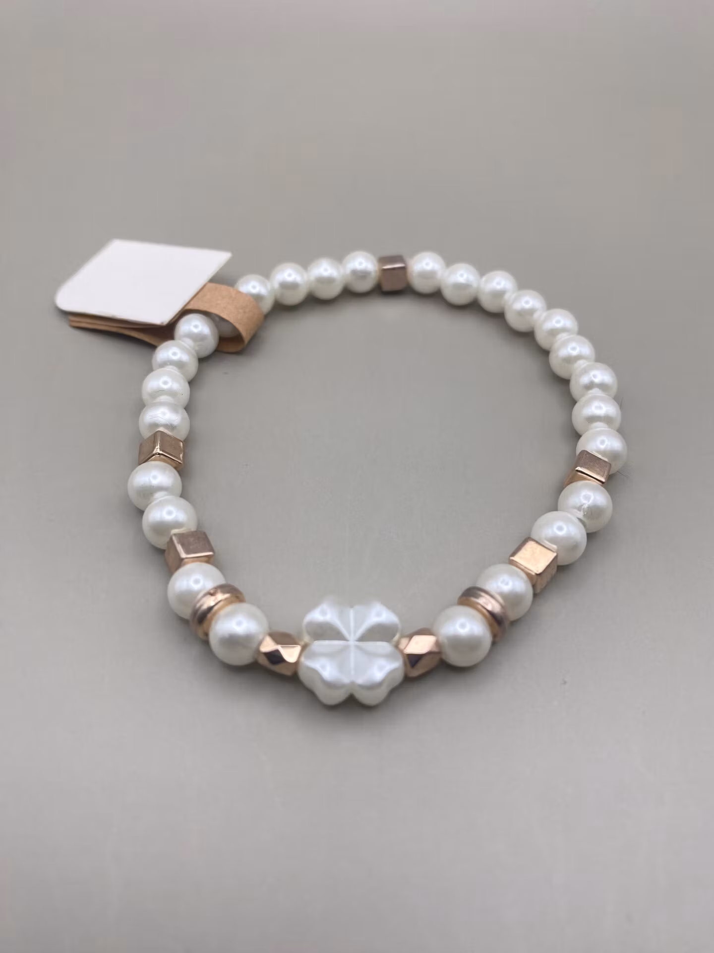 Armband i benvita pärlor varvat med roséfärgade detaljer, vit fyrklöver i blickfånget