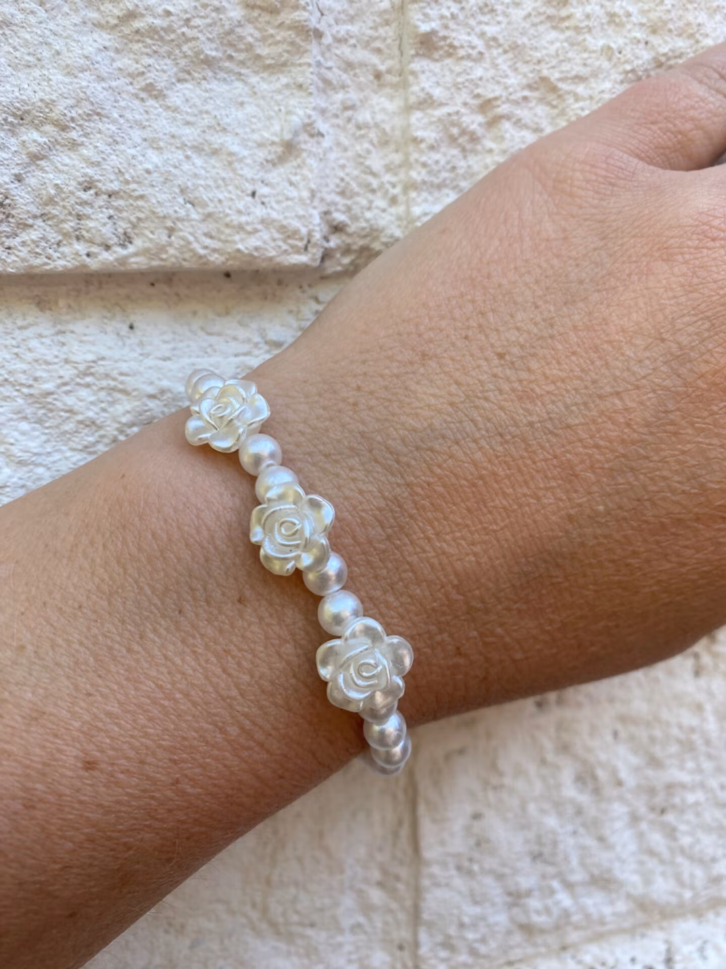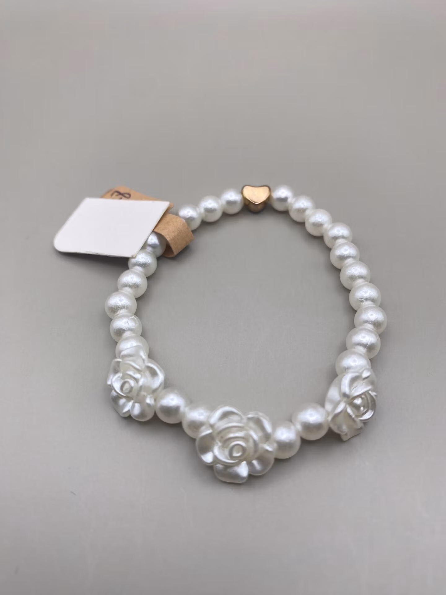 Armband i vita pärlor med tre vita rosor i blickfånget, guldfärgad hjärtformad pärla vid handleden