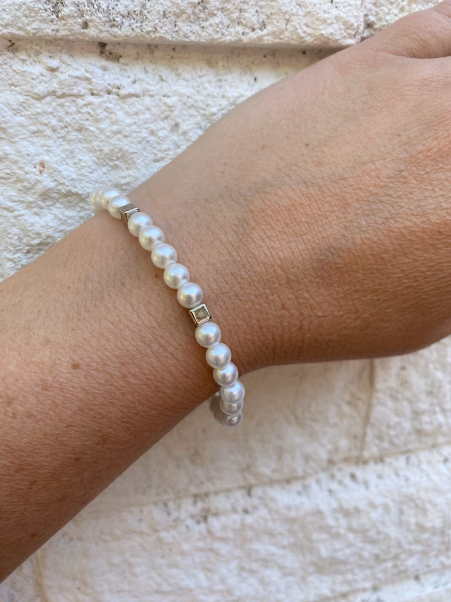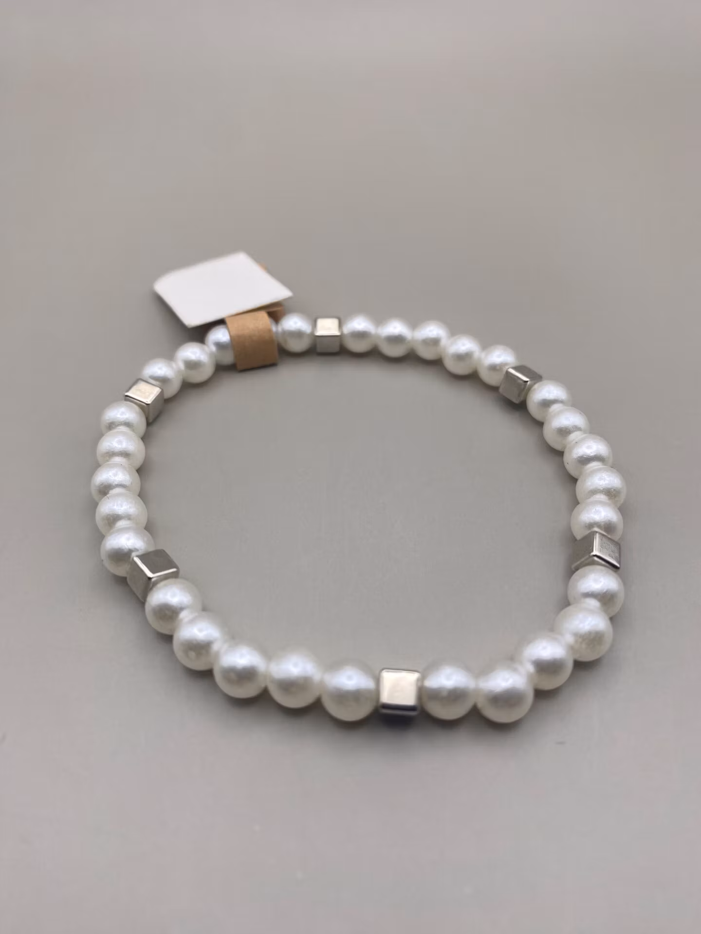 Armband i vita pärlor varvat med silverfärgade fyrkantiga pärlor.