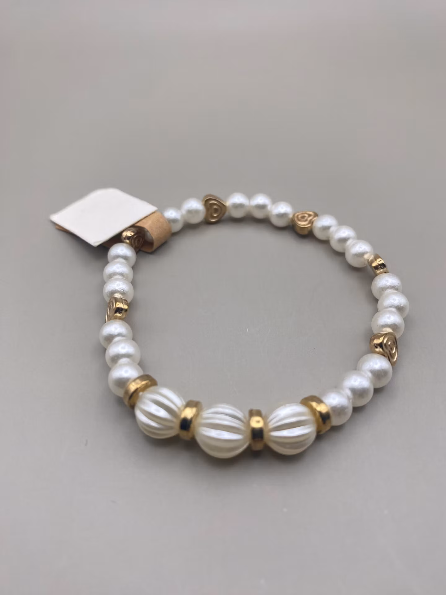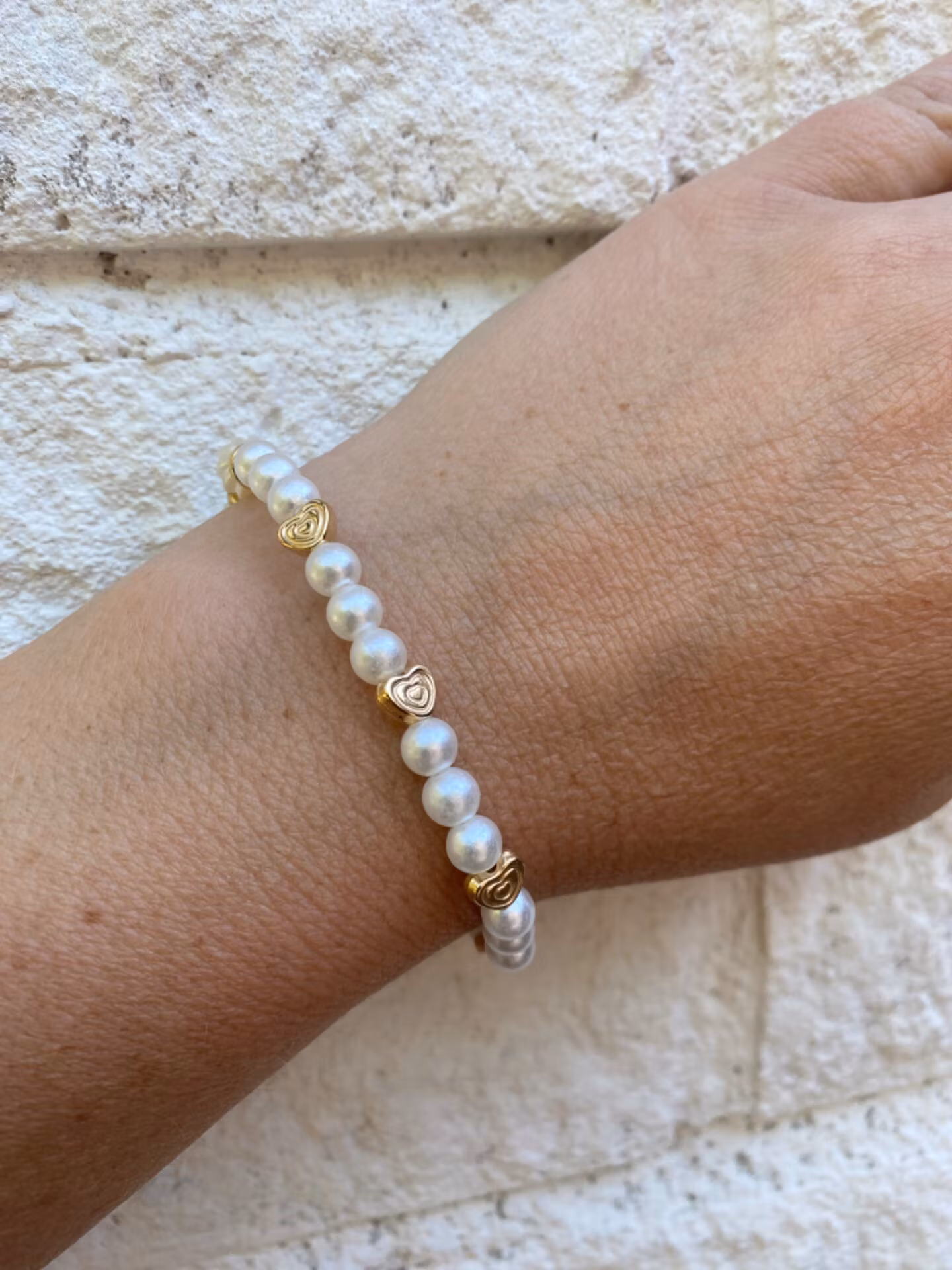 Armband i vita pärlor varvat med mönstrade guldfärgade hjärtan
