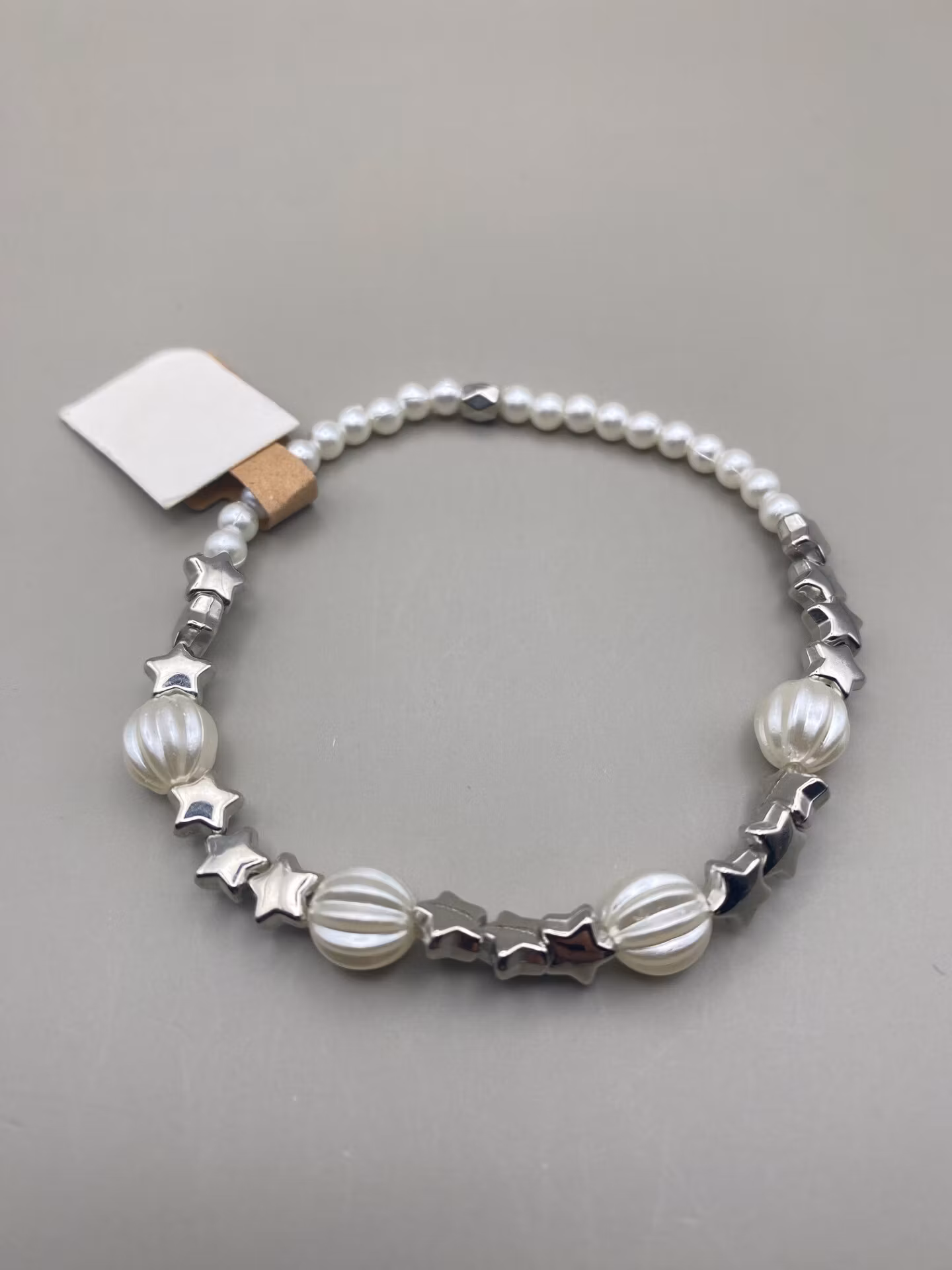 Armband i vita små pärlor varvat med större mönstrade vita pärlor samt silverfärgade stjärnorVisas produkten "Tillfälligt slut" efter att du lagt den i din kund