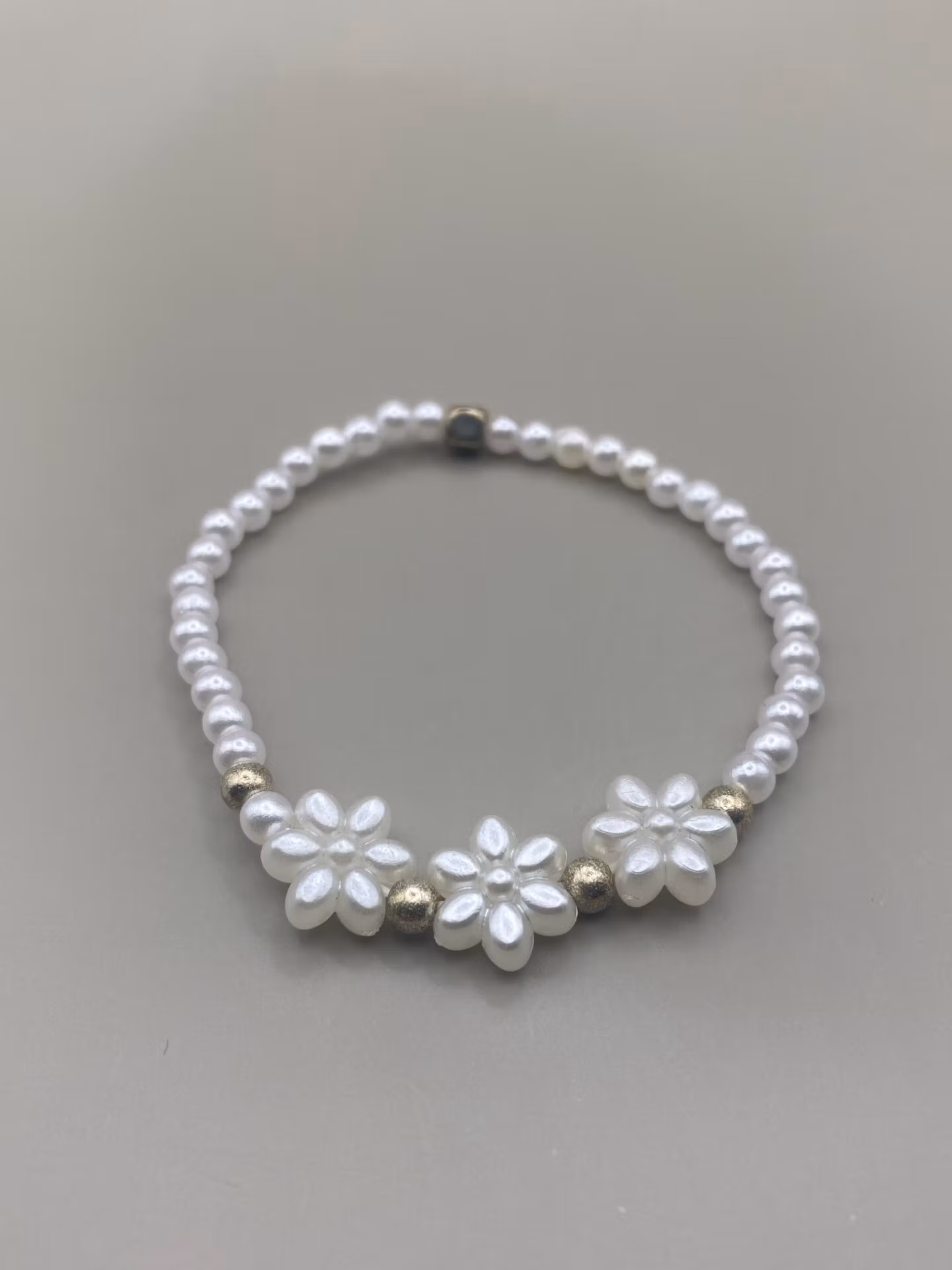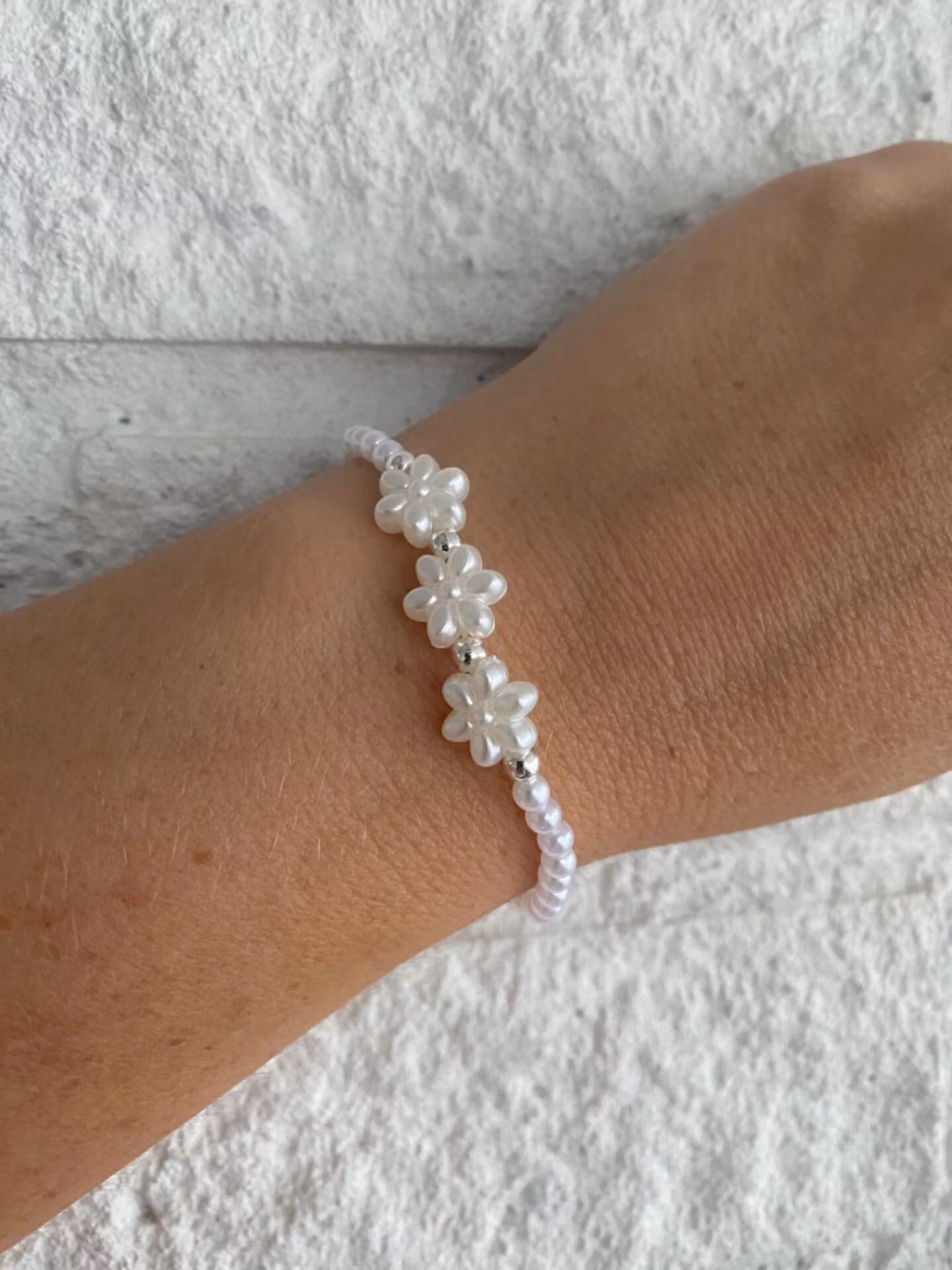 Enkelt armband av små vita pärlor, tre vita blommor och silverfärgade pärlor i blickfångetPärlor: 4mmVisas produkten "Tillfälligt slut" efter att du lagt den i