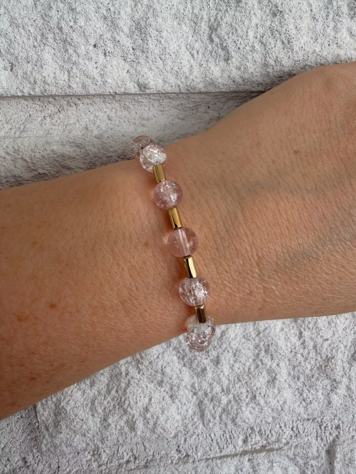 Vackert armband med runda mellerade ljusrosa pärlor varvat med guldfärgade distanser och min signaturpärla.Pärlor: 8mm, 6mmVisas produkten "Tillfälligt slut" ef