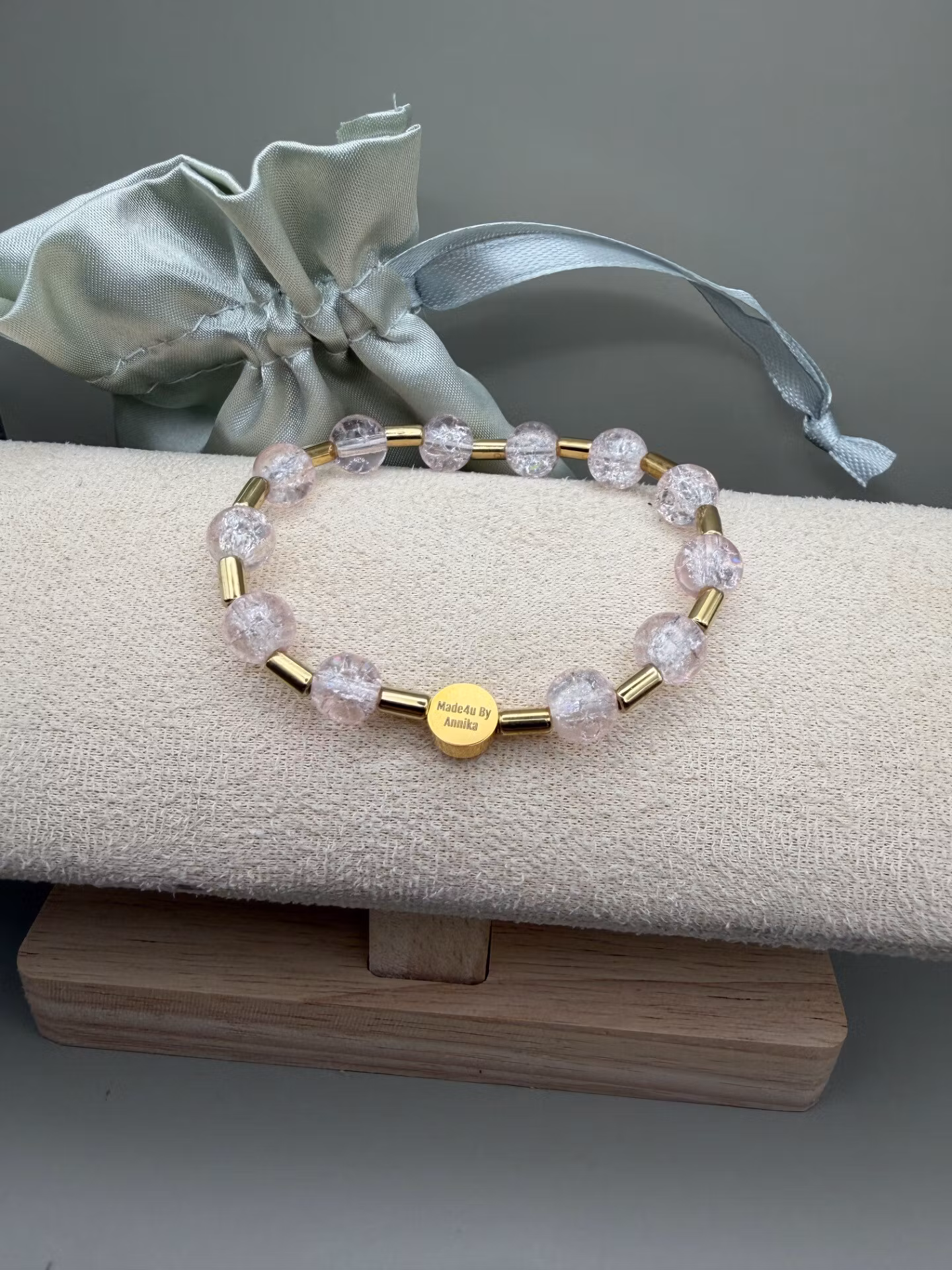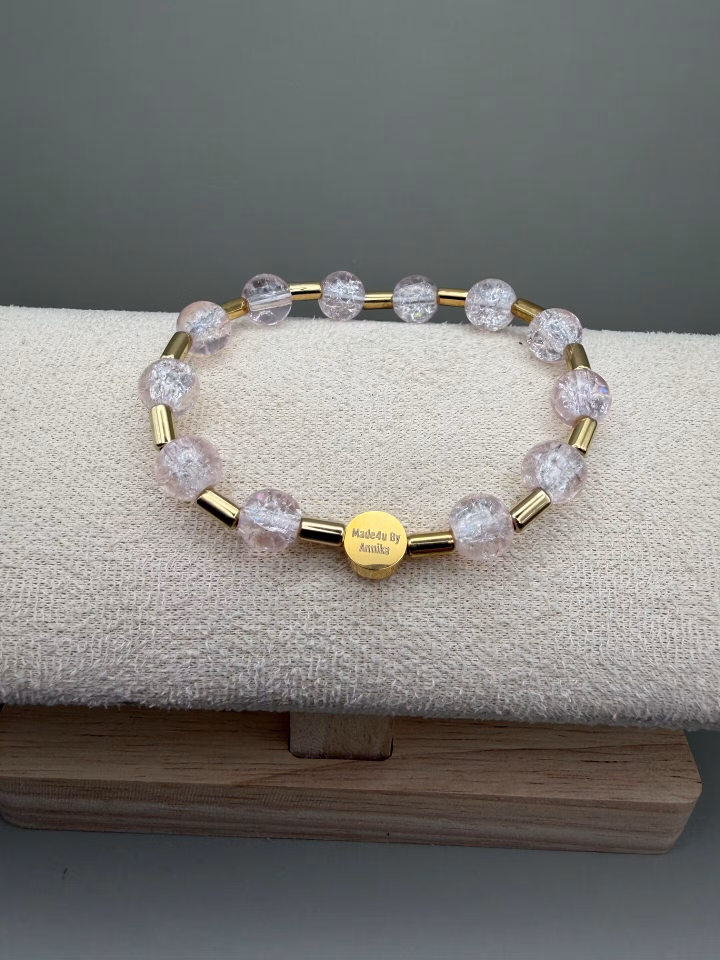 Vackert armband med runda mellerade ljusrosa pärlor varvat med guldfärgade distanser och min signaturpärla.