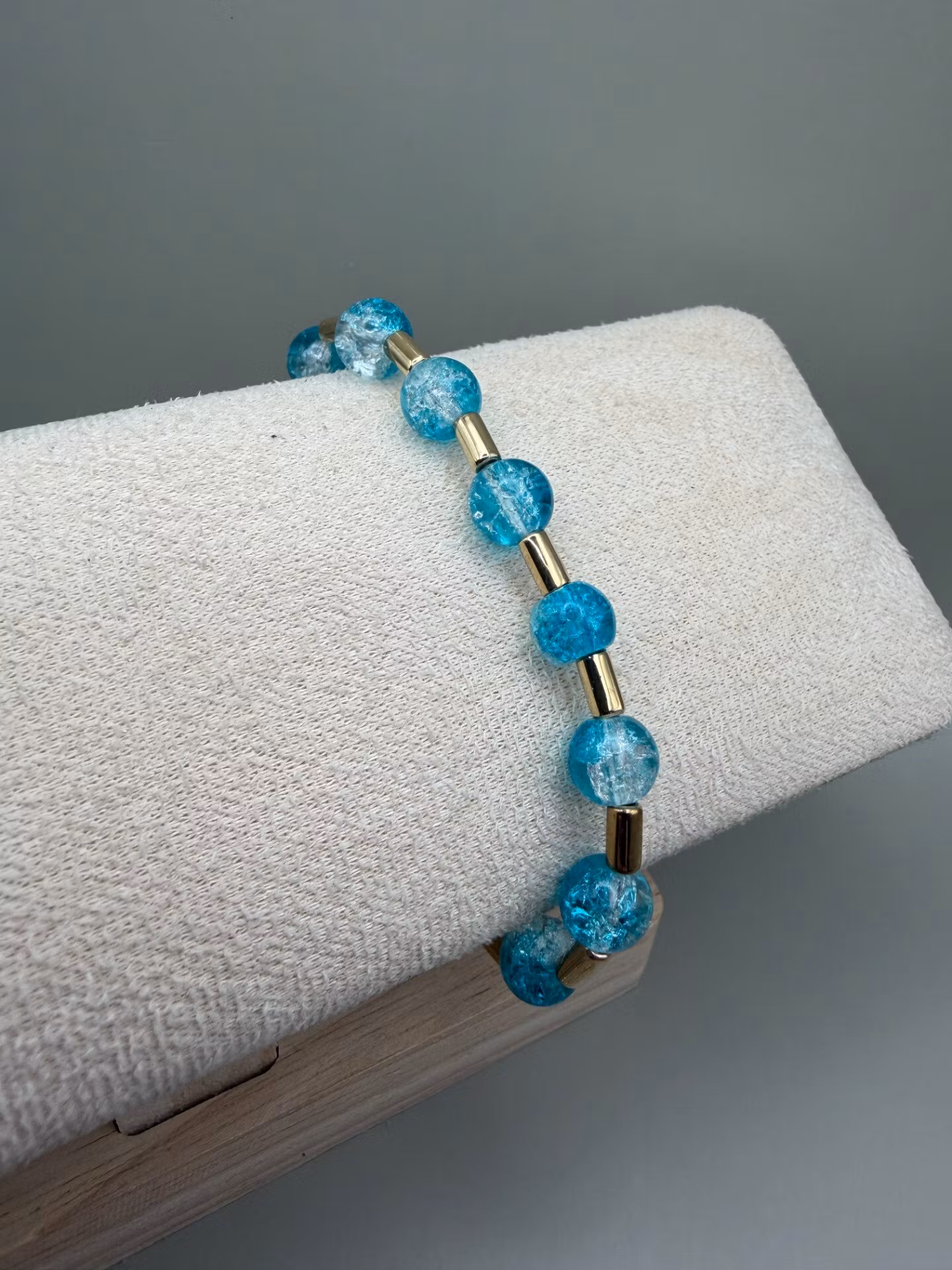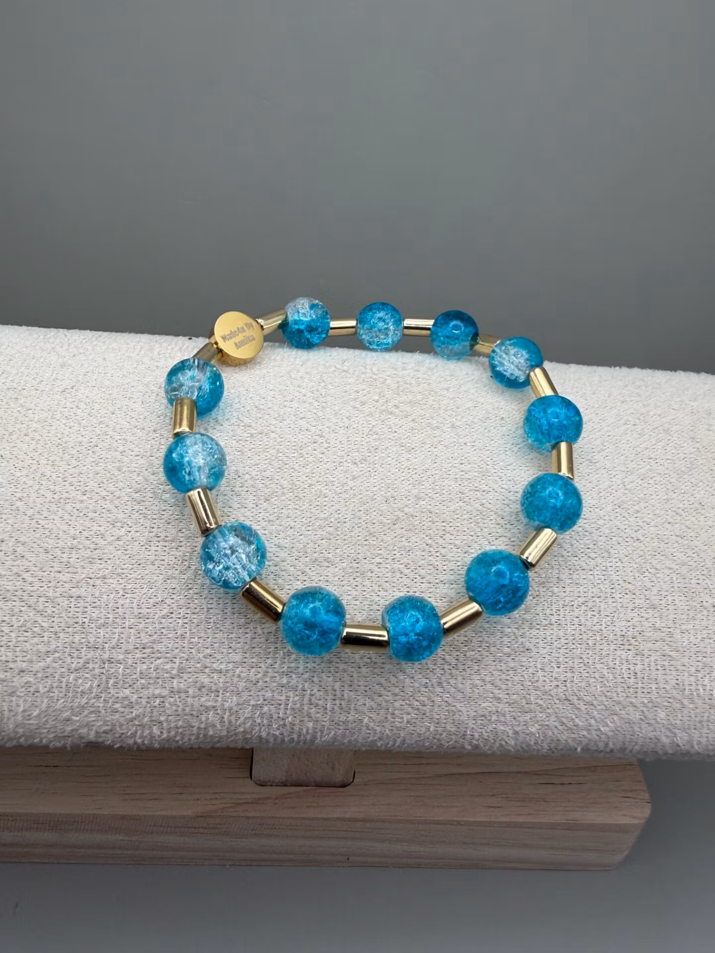 Vackert armband med runda mellerade turkosa pärlor varvat med guldfärgade distanser och min signaturpärla.Pärlor: 8mm, 6mmVisas produkten "Tillfälligt slut" eft