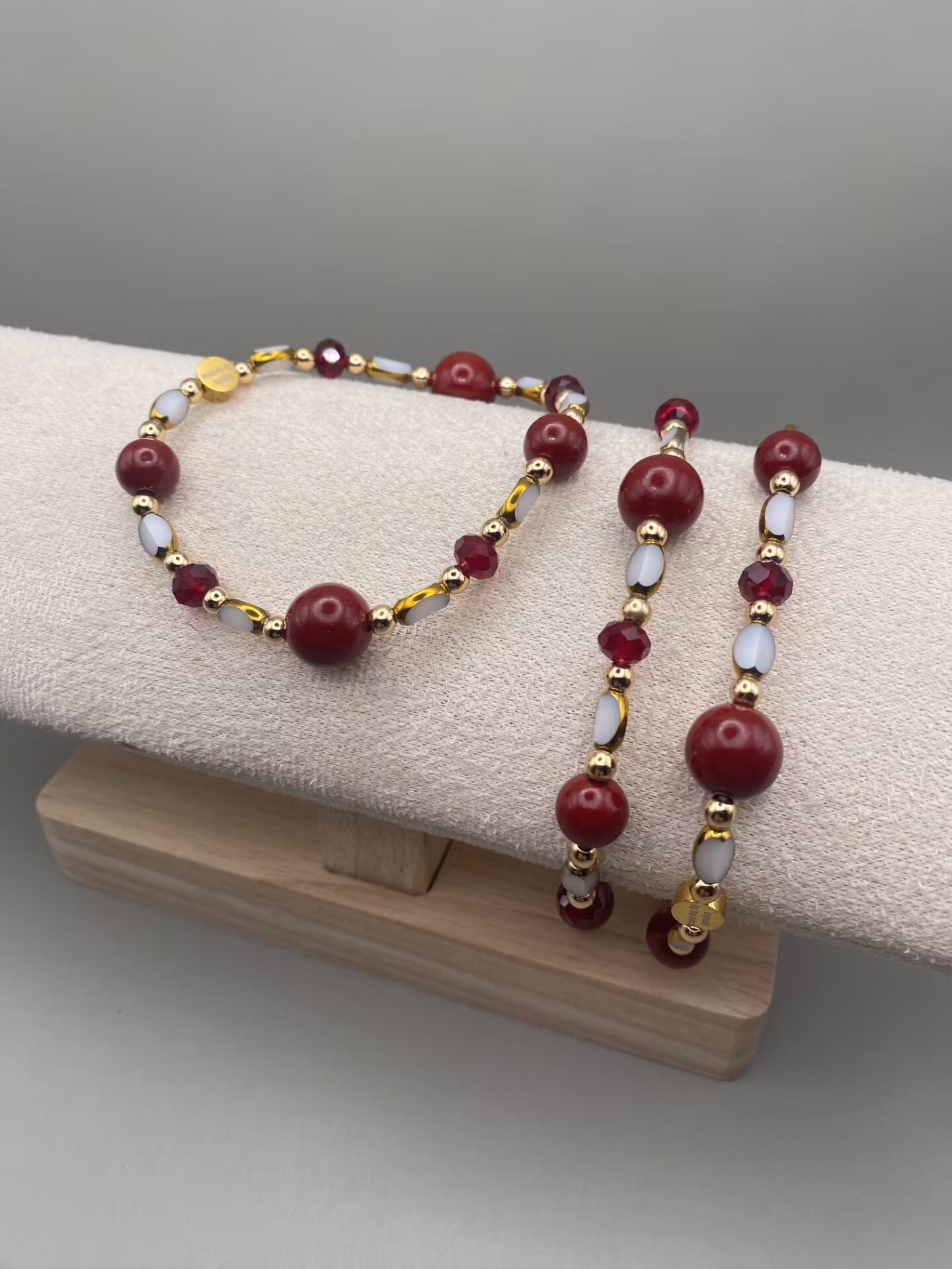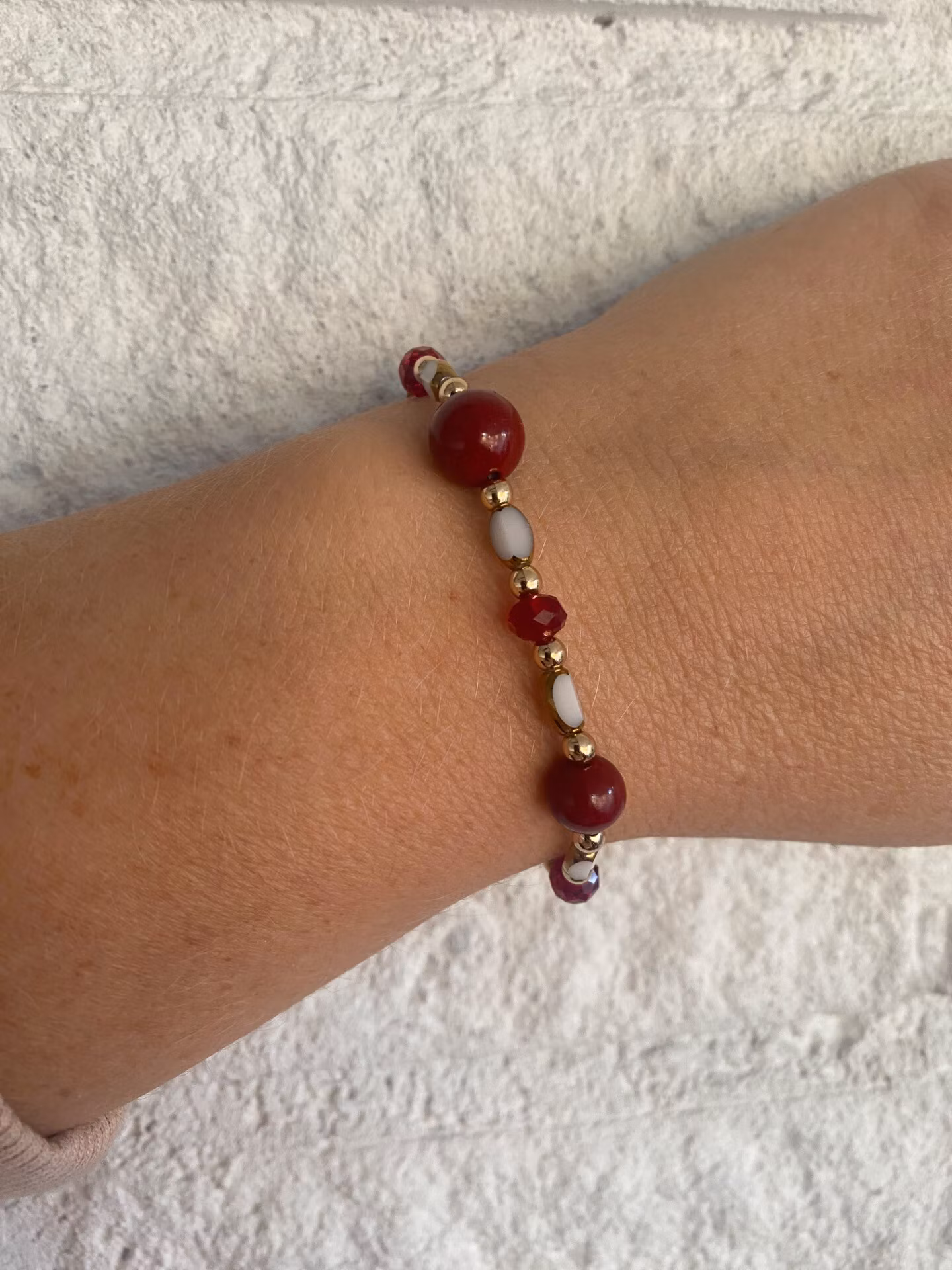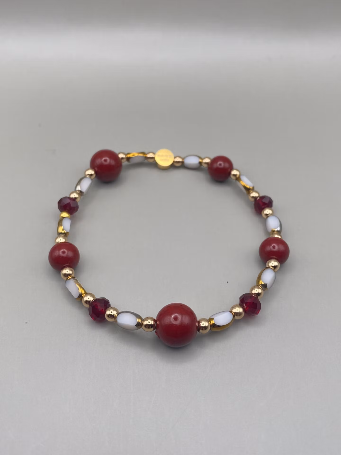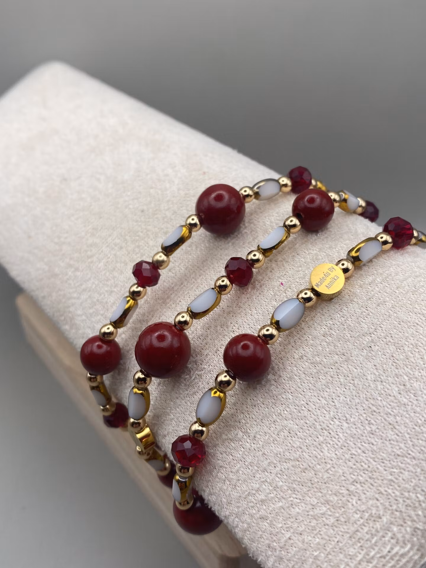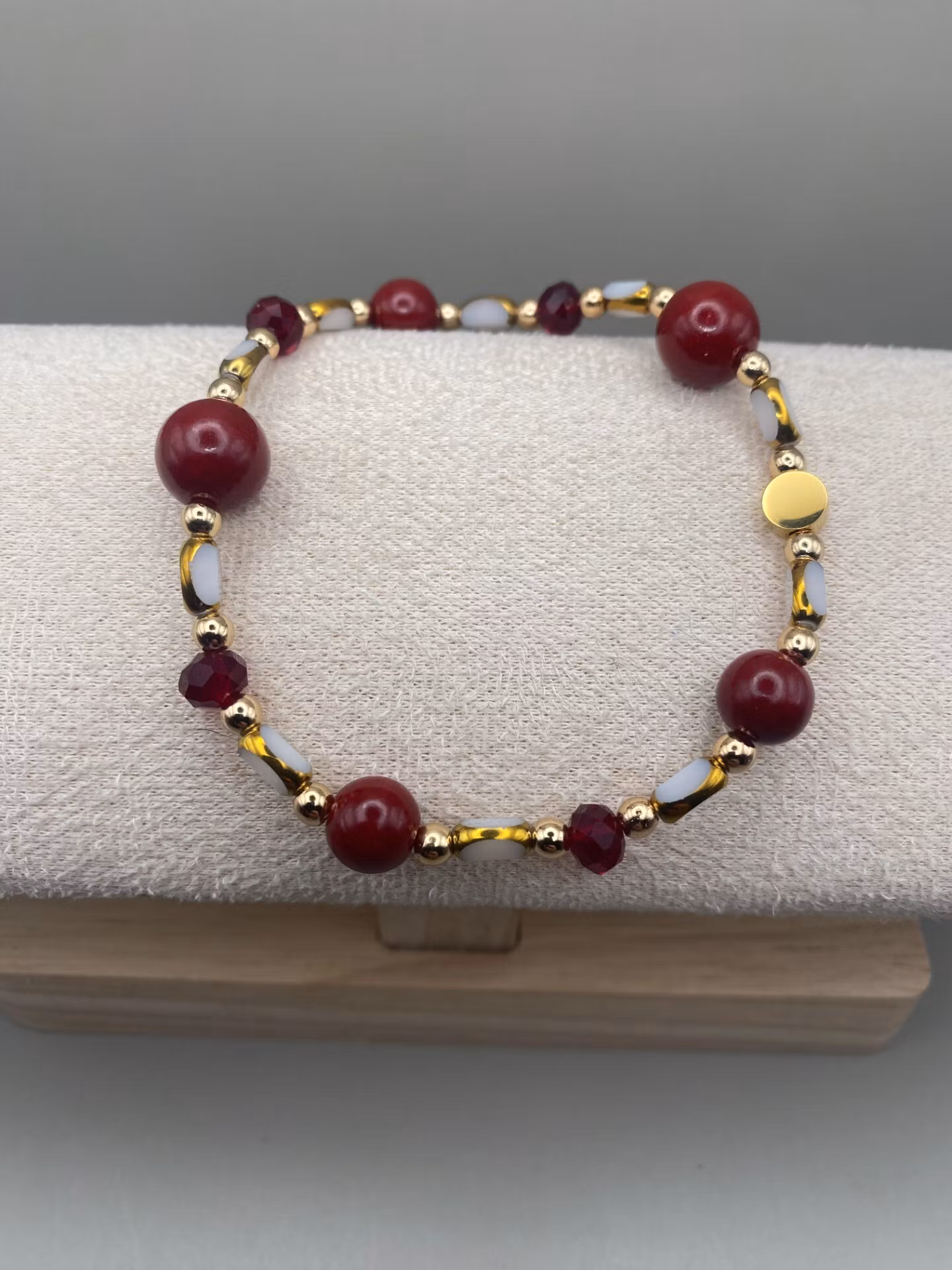 Vackert lekfullt moget armband med en vacker mix av vinröda runda pärlor, vita dekorativa pärlor med guldmellerad kant och små guldfärgade pärlor.