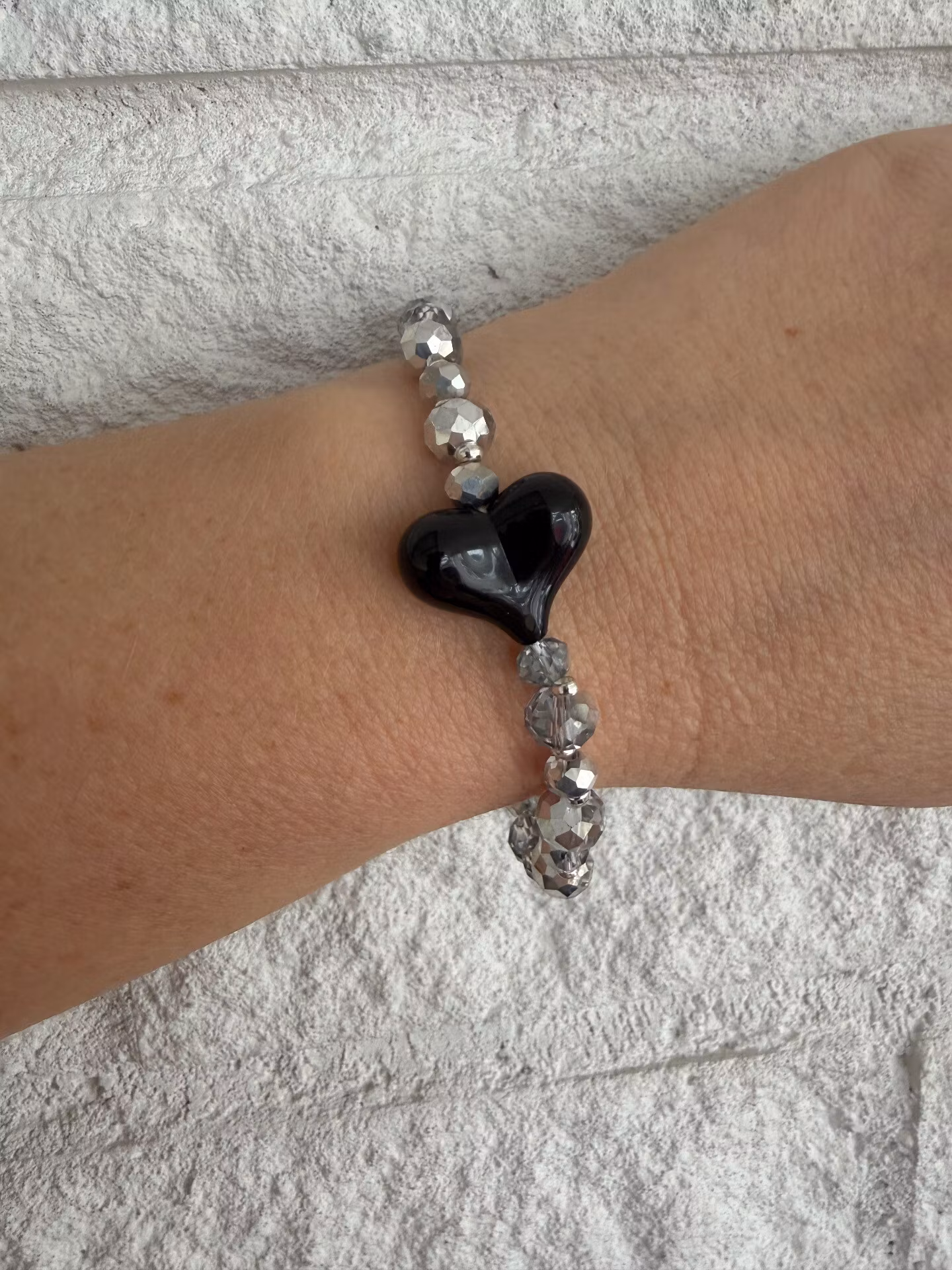 Armband i varvat stora och mellanstora facetterade silvergrå glaskristallpärlor och silverfärgade distanser och ett vackert svart hjärta som fångar blicken. Arm