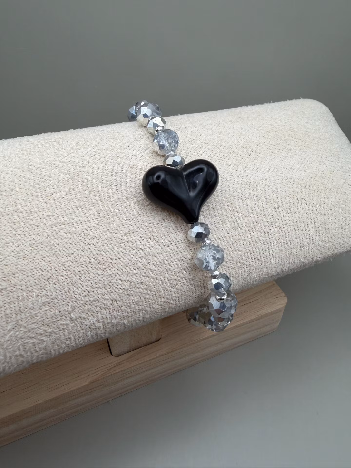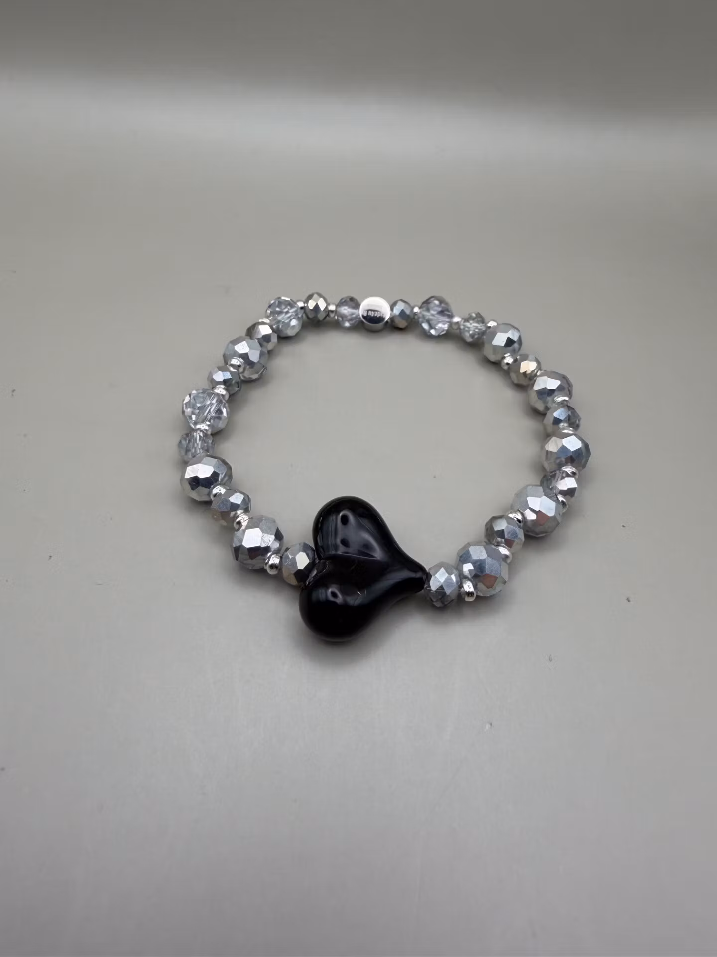 Armband i varvat stora och mellanstora facetterade silvergrå glaskristallpärlor och silverfärgade distanser och ett vackert svart hjärta som fångar blicken. Armbandet avsslutas med min signaturpärla.