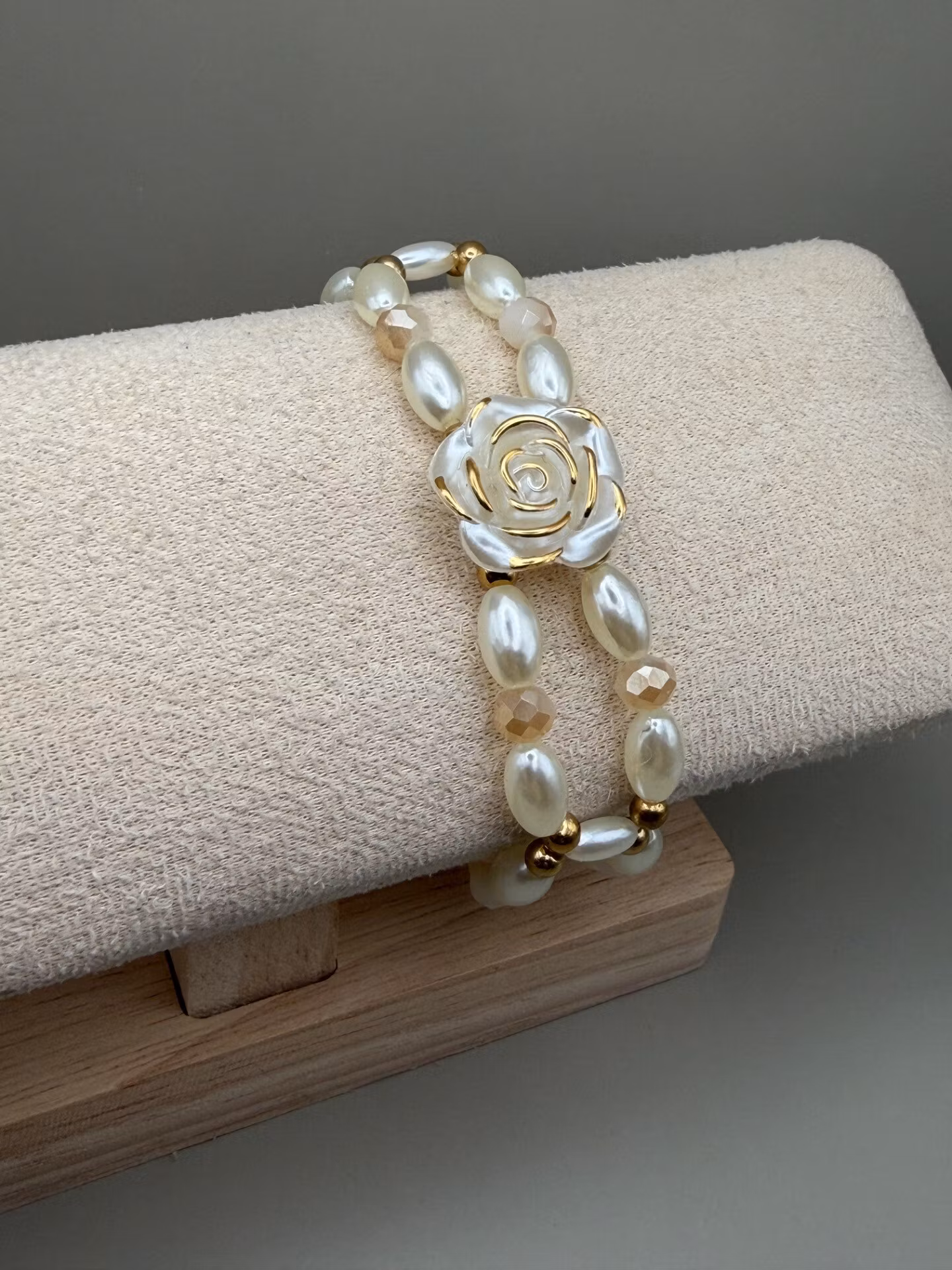 Lekfullt armband med benvita pärlor i olika former och storlekar varvat med guldfärgade distanser och beiga facetterade glaskristallpärlor. Vacker ros i blickfånget.