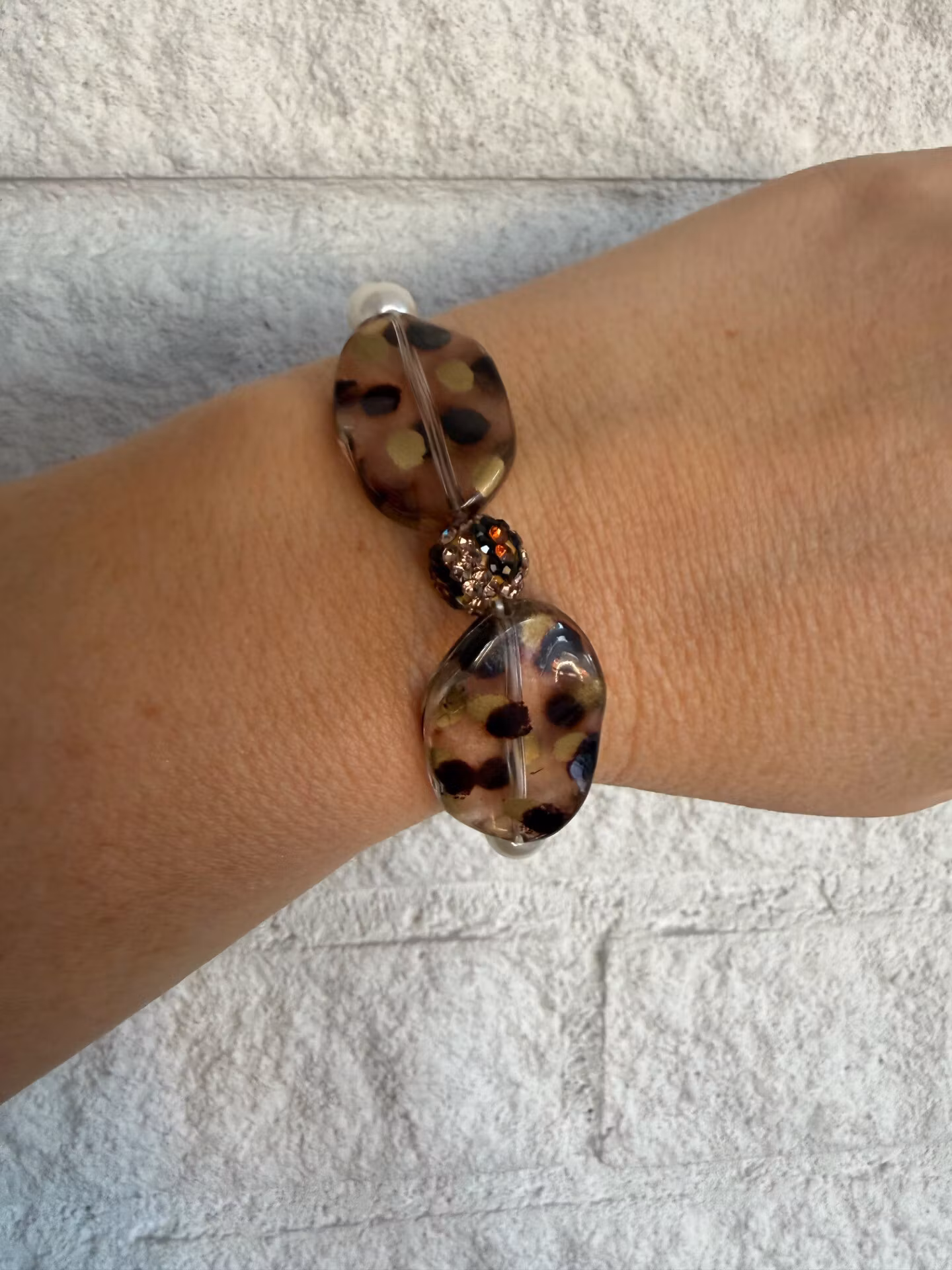 Lekfullt armband där två stora, oregelbundna leopardmönstrade pärlor tillsammans med en gnistrande strassboll står i centrum. Runt om sitter stora benvita pärlo