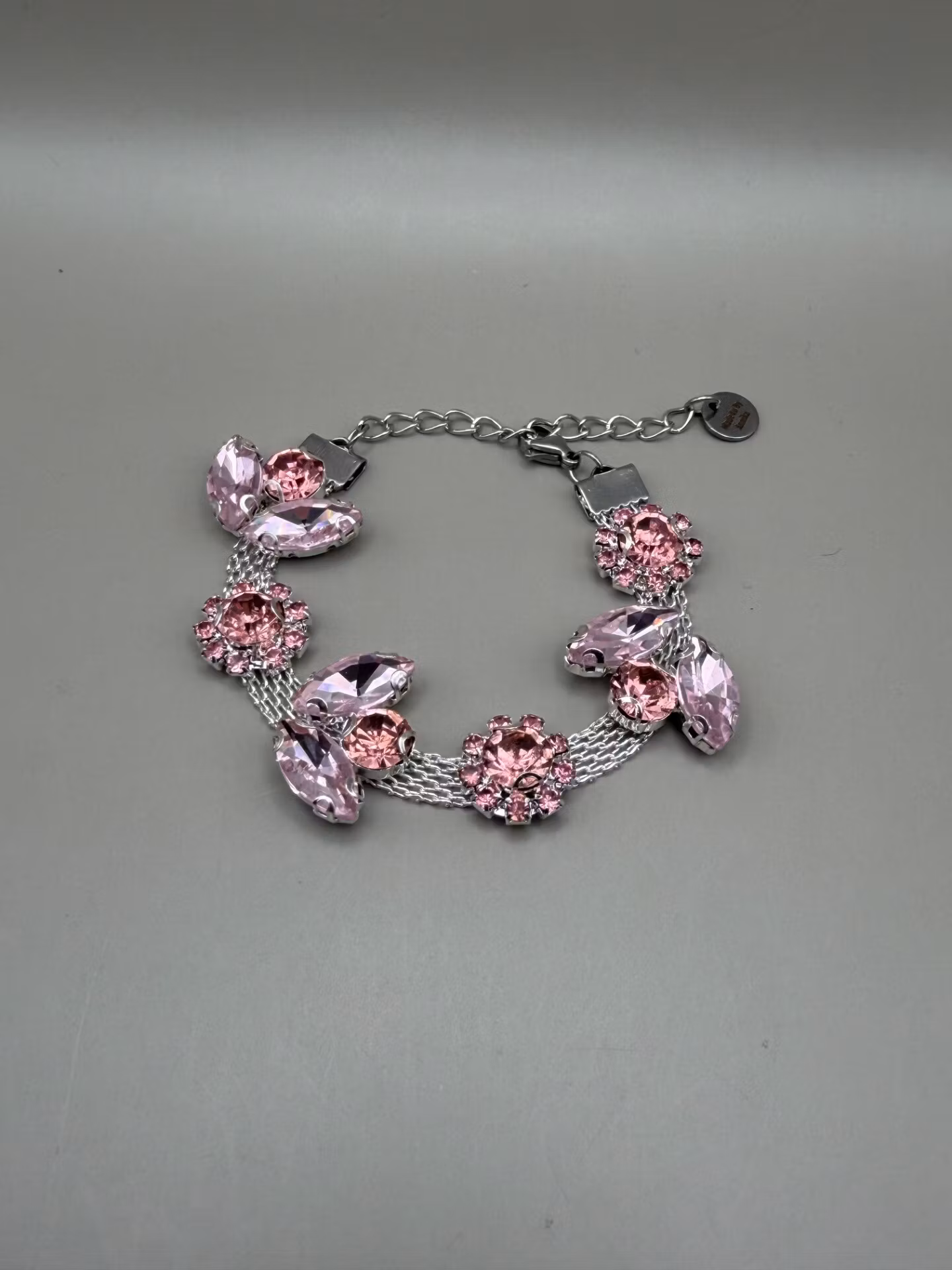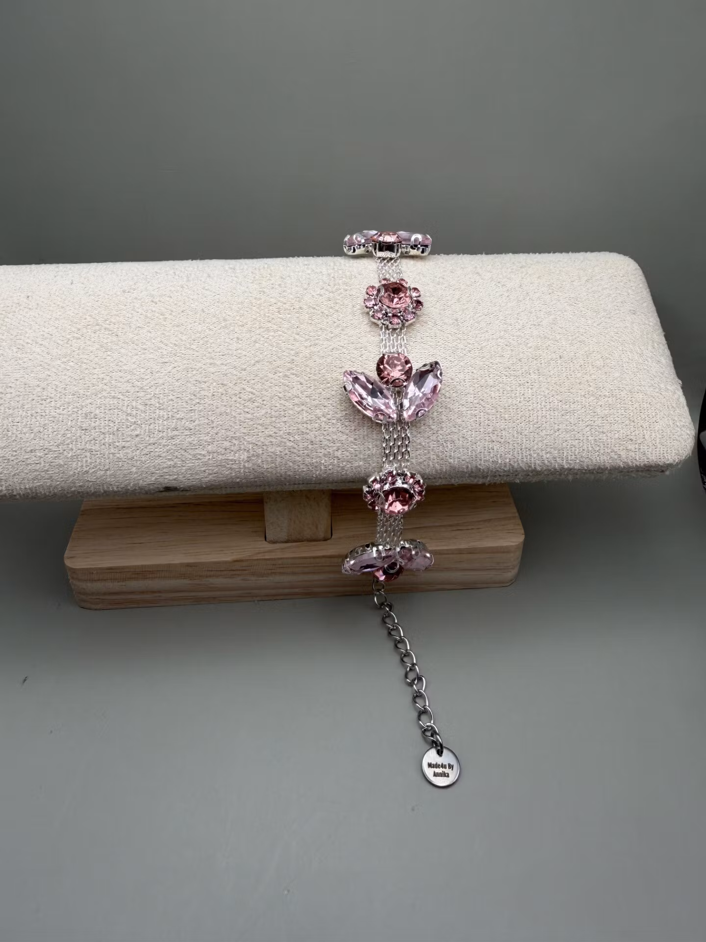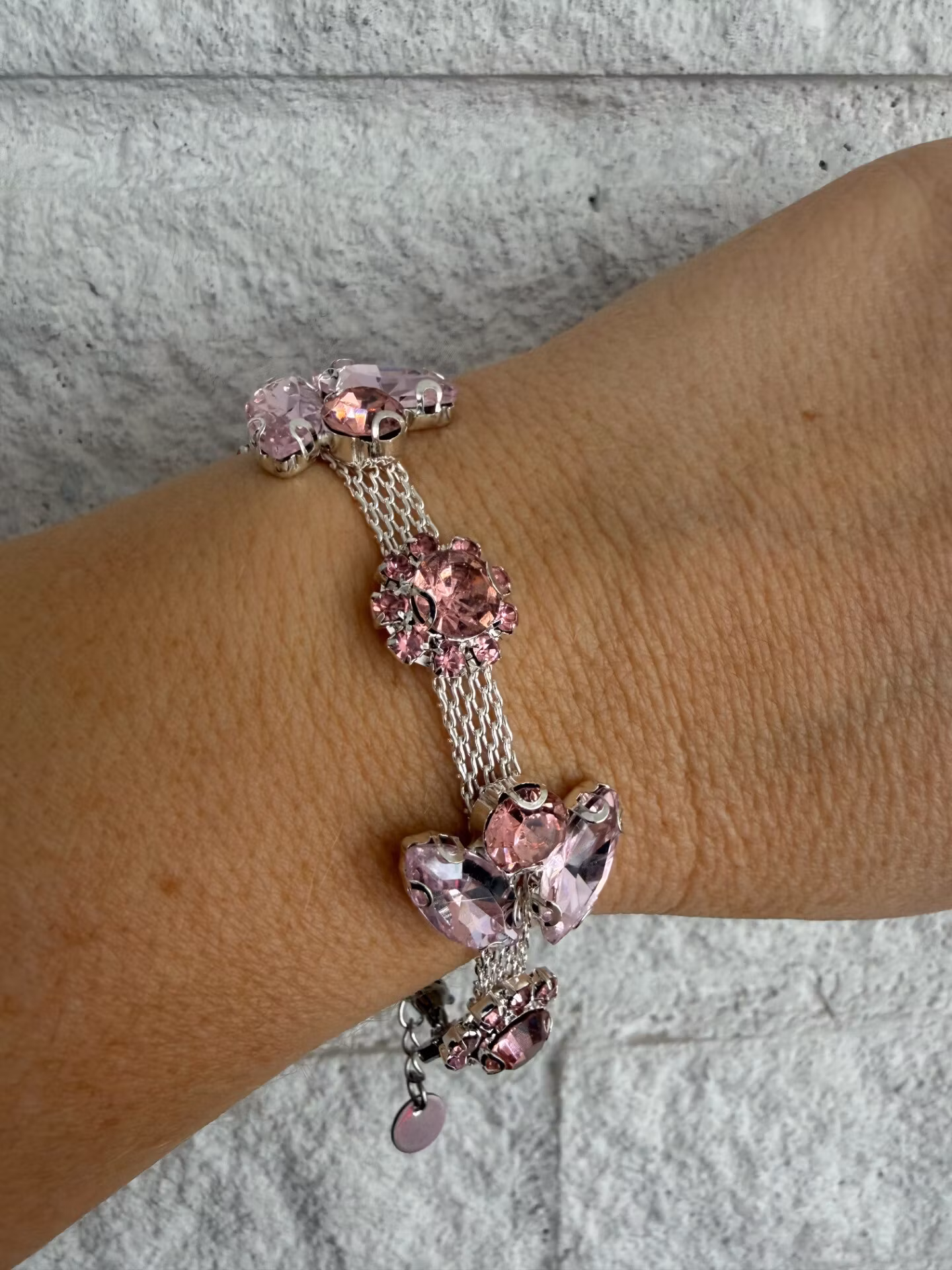 Ett elegant och somrigt armband med ljusrosa strass i ett vackert mönster på en silvrig bas. Ett stilrent smycke som ger en mjuk färgaccent och passar både till