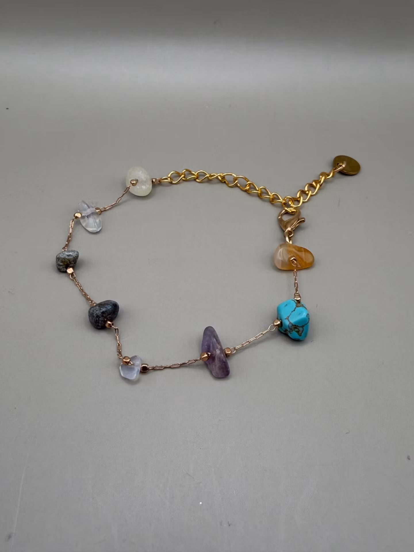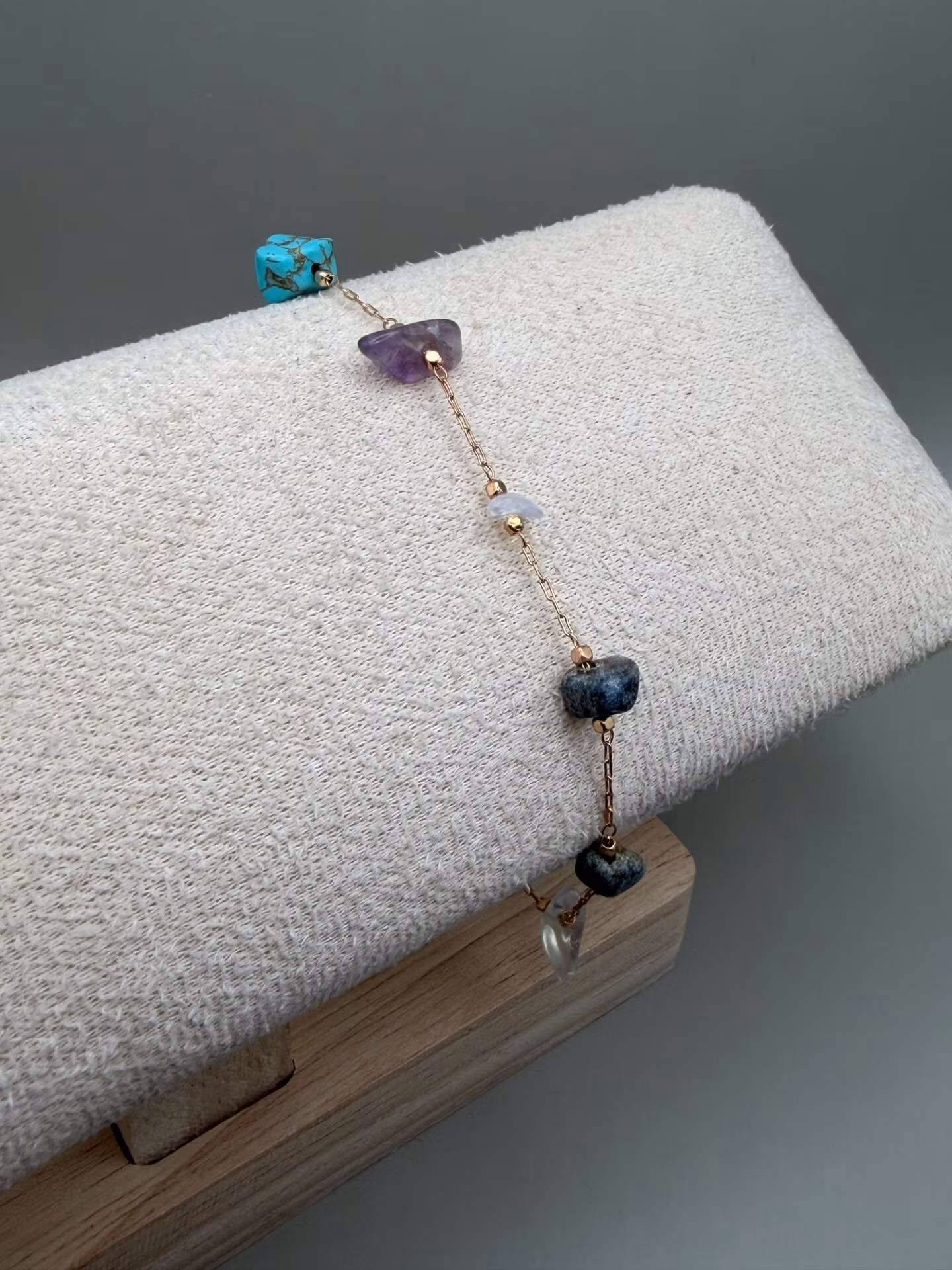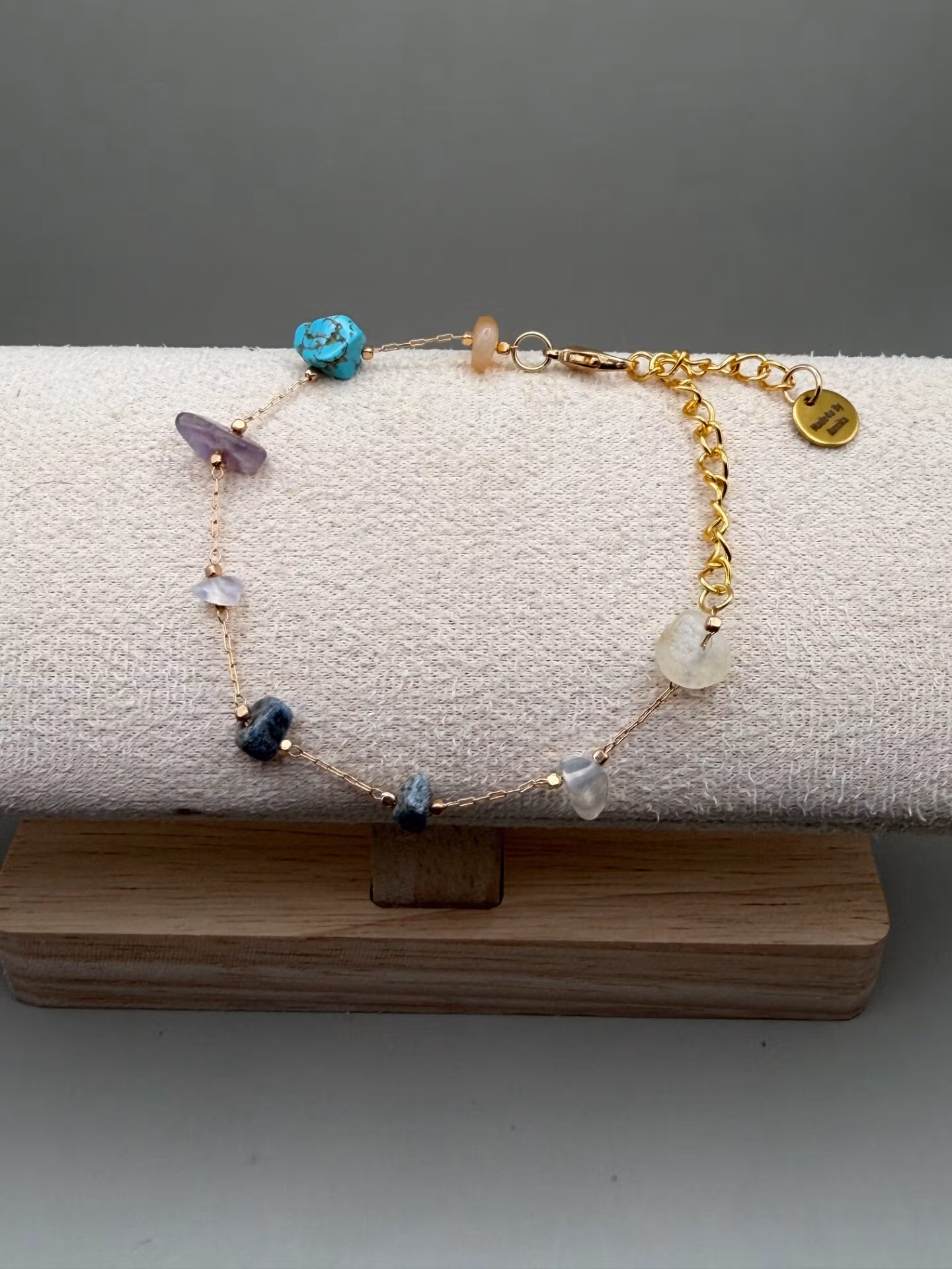 Ett lätt och somrigt armband med turkos och blandfärgade naturstenar och en tunn guldfärgad kedja i rostfritt stål. Enkelt, stilrent och perfekt för en mjuk färgaccent. Armbandet har spänne för justerbar passform.