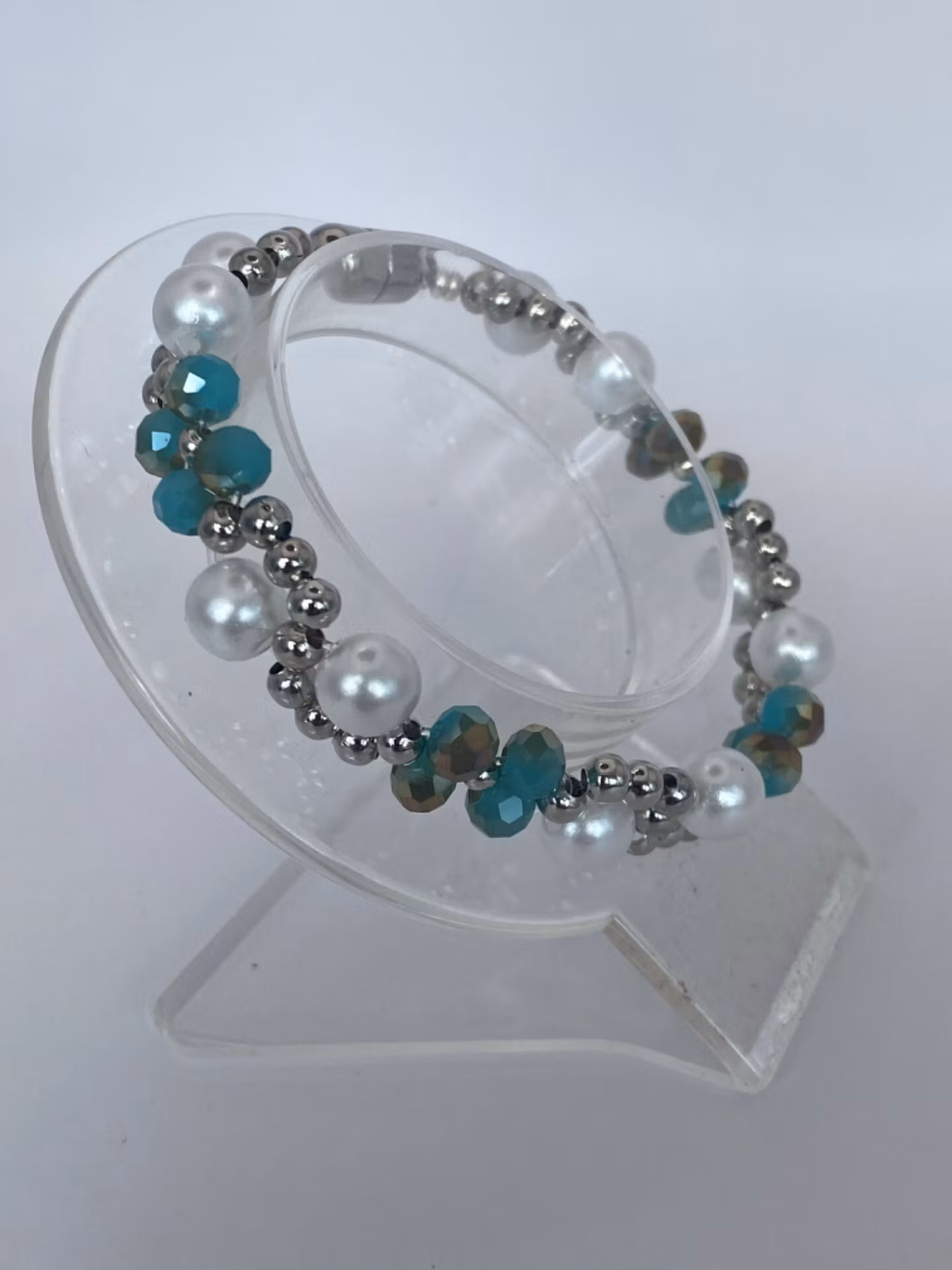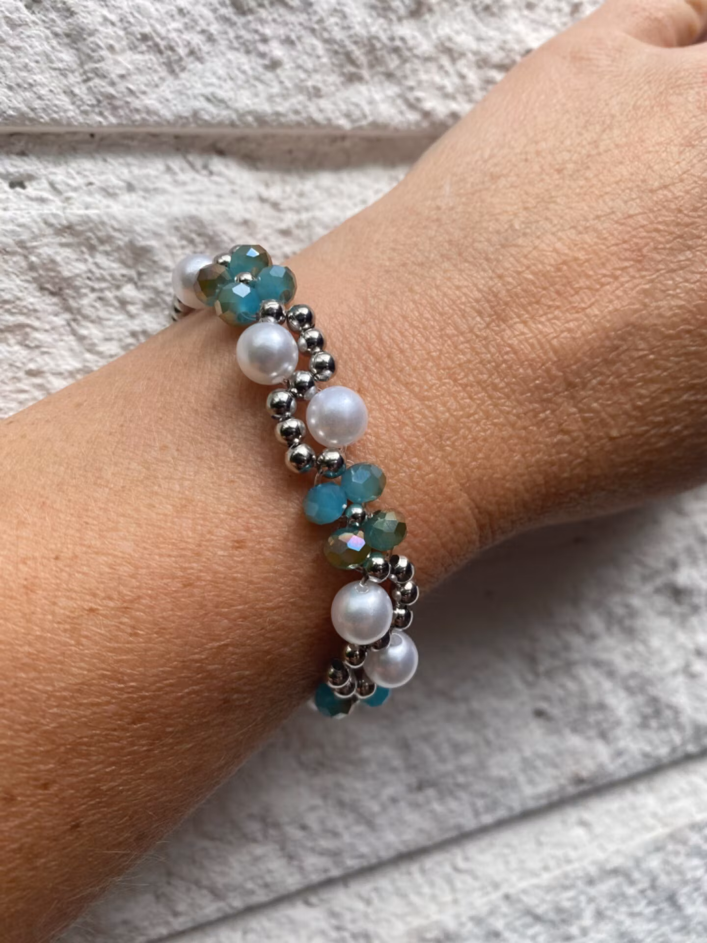 Armband i fint brett mönster av silverfärgade pärlor, turkosmellerade glaspärlor och vita vaxade pärlor. Till skillnad från mina go-to-armband har denna ett sil