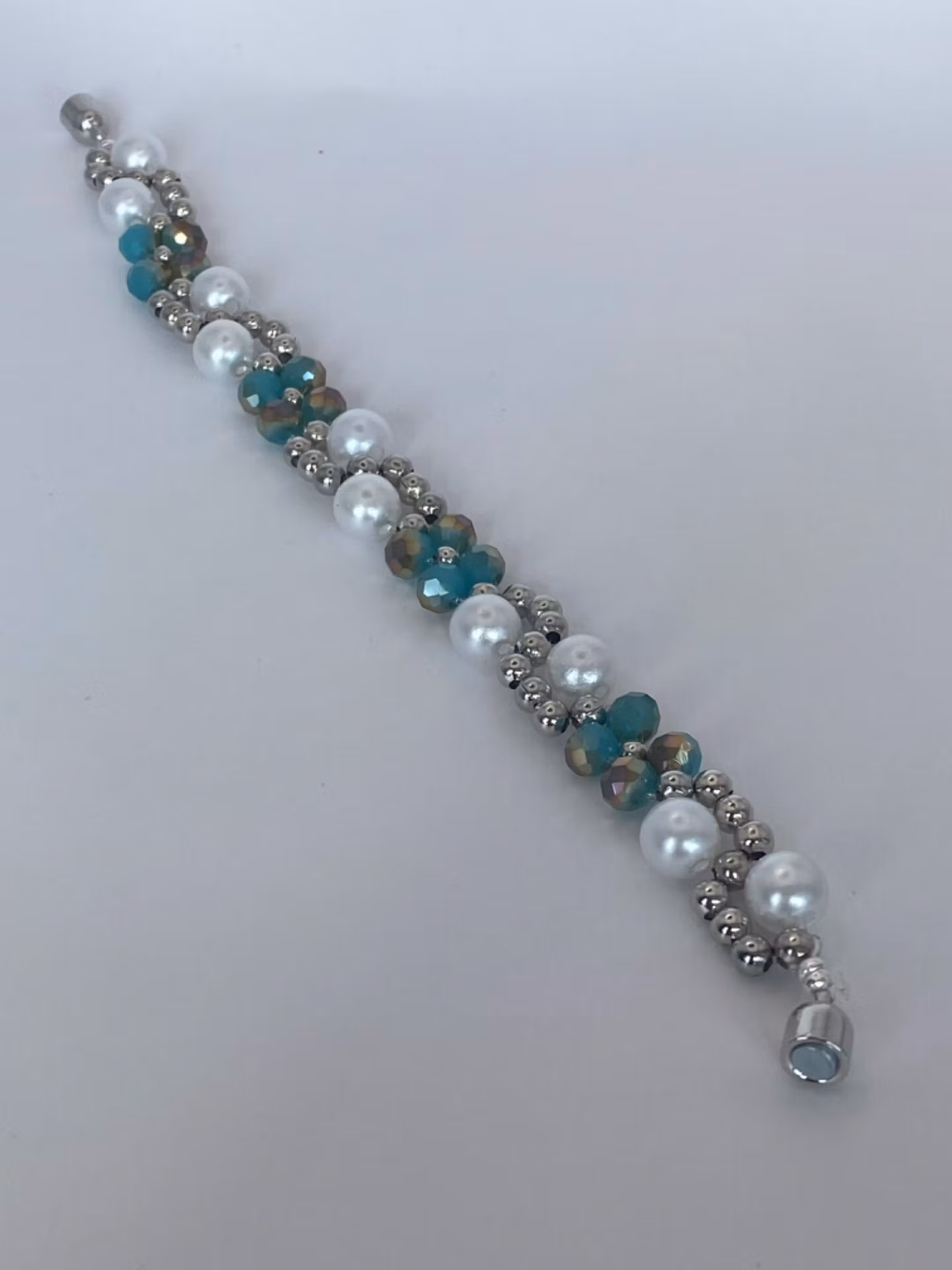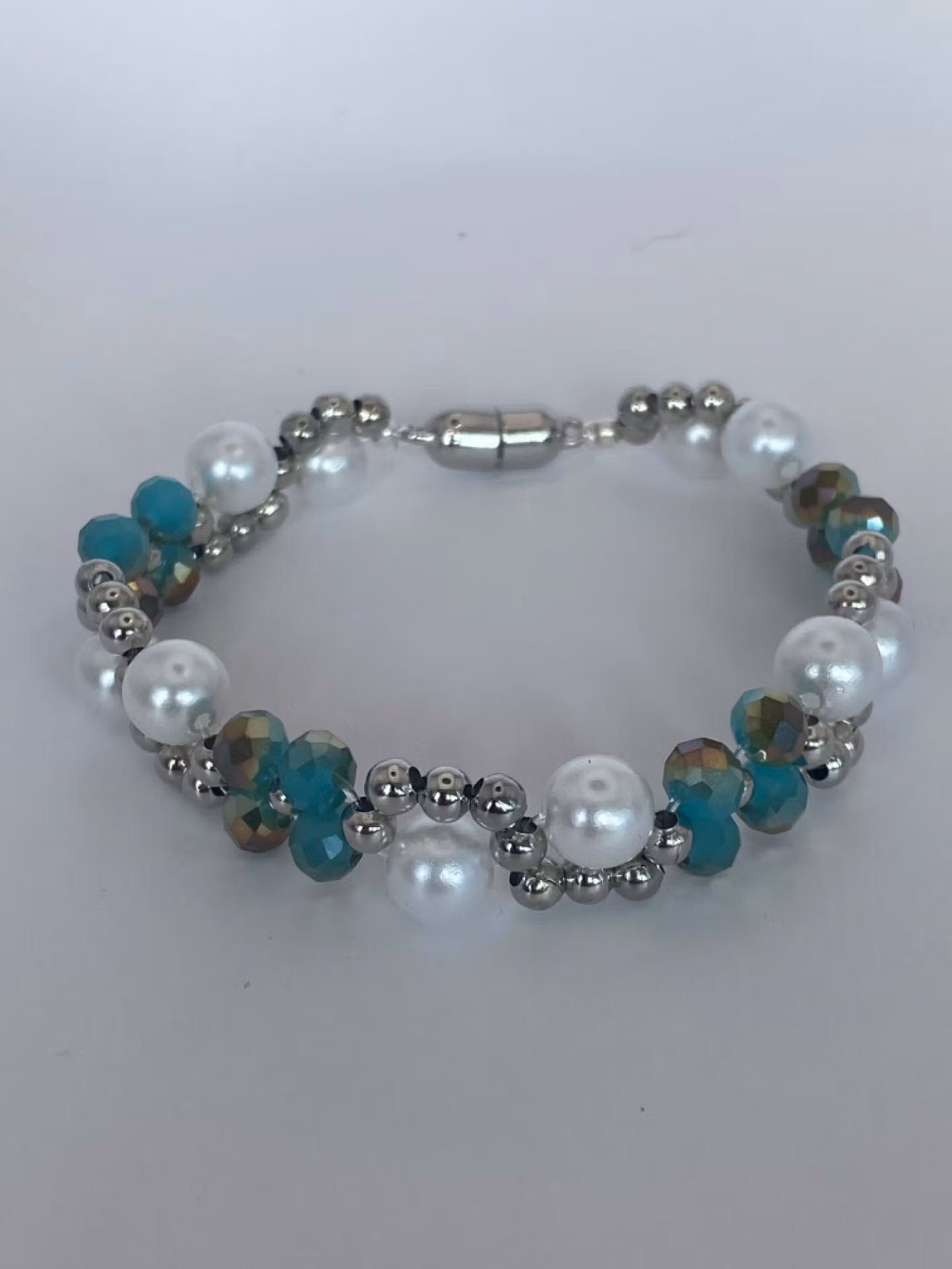 Armband i fint brett mönster av silverfärgade pärlor, turkosmellerade glaspärlor och vita vaxade pärlor. Till skillnad från mina go-to-armband har denna ett silverfärgat magnetiskt spänne.