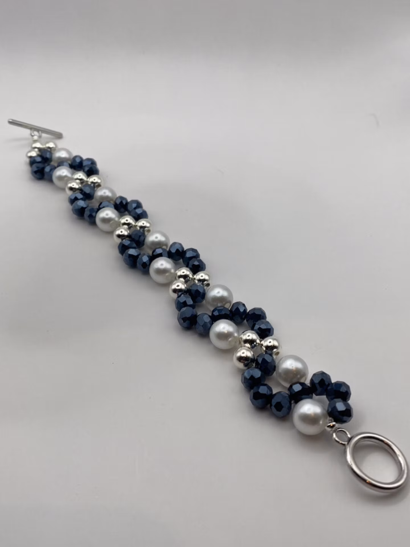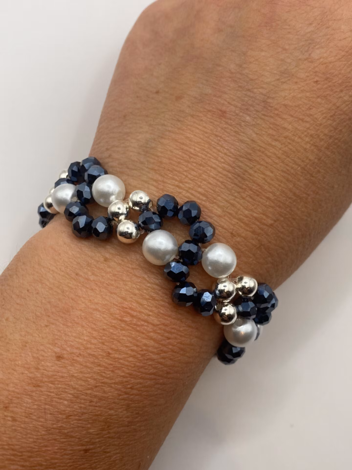 Armband i fint brett mönster av midnattsblå glaspärlor, silverfärgade pärlor och vita vaxade pärlor. Till skillnad från mina go-to-armband har denna ett silverf