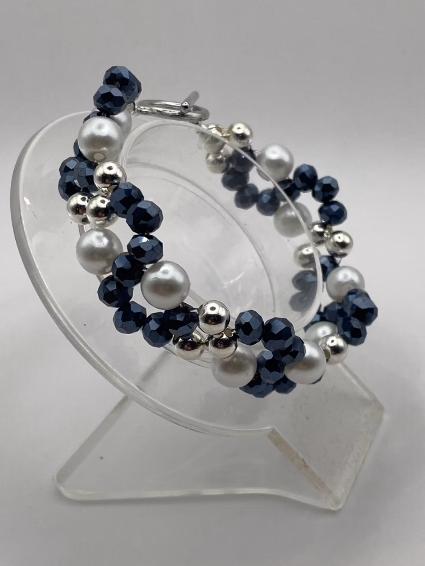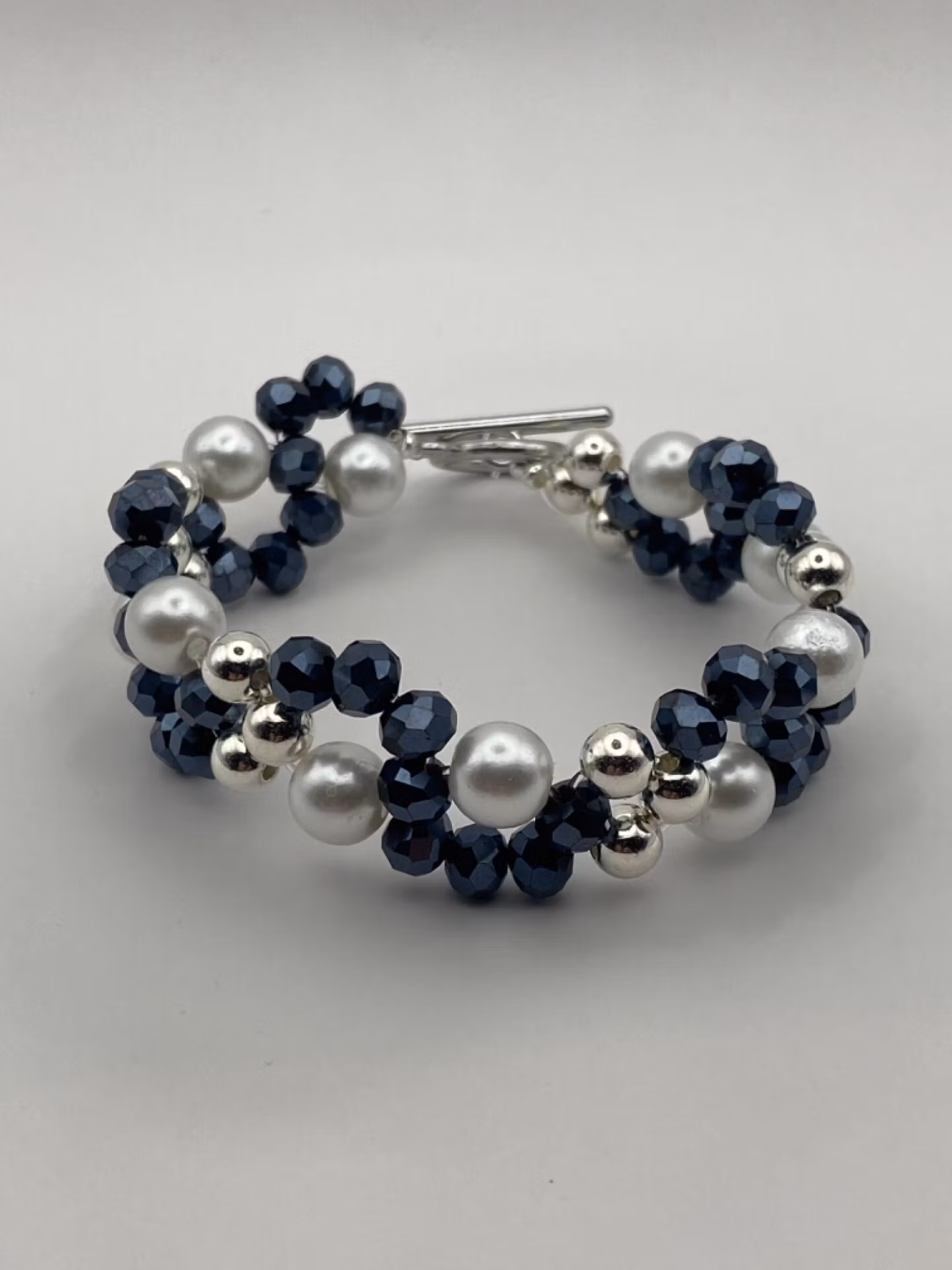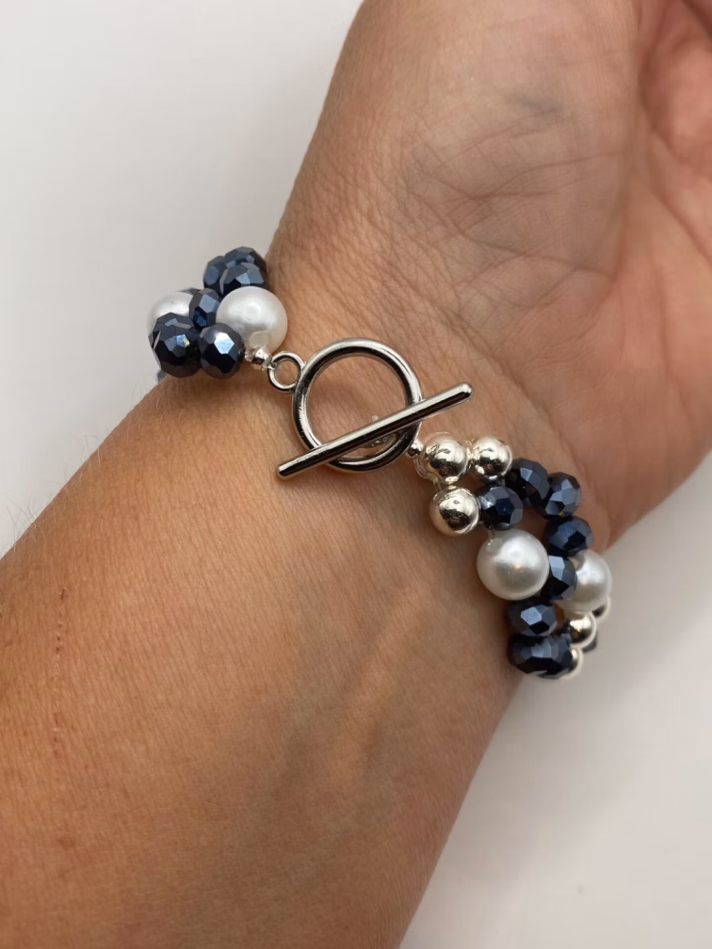 Armband i fint brett mönster av midnattsblå glaspärlor, silverfärgade pärlor och vita vaxade pärlor. Till skillnad från mina go-to-armband har denna ett silverfärgat spänne.