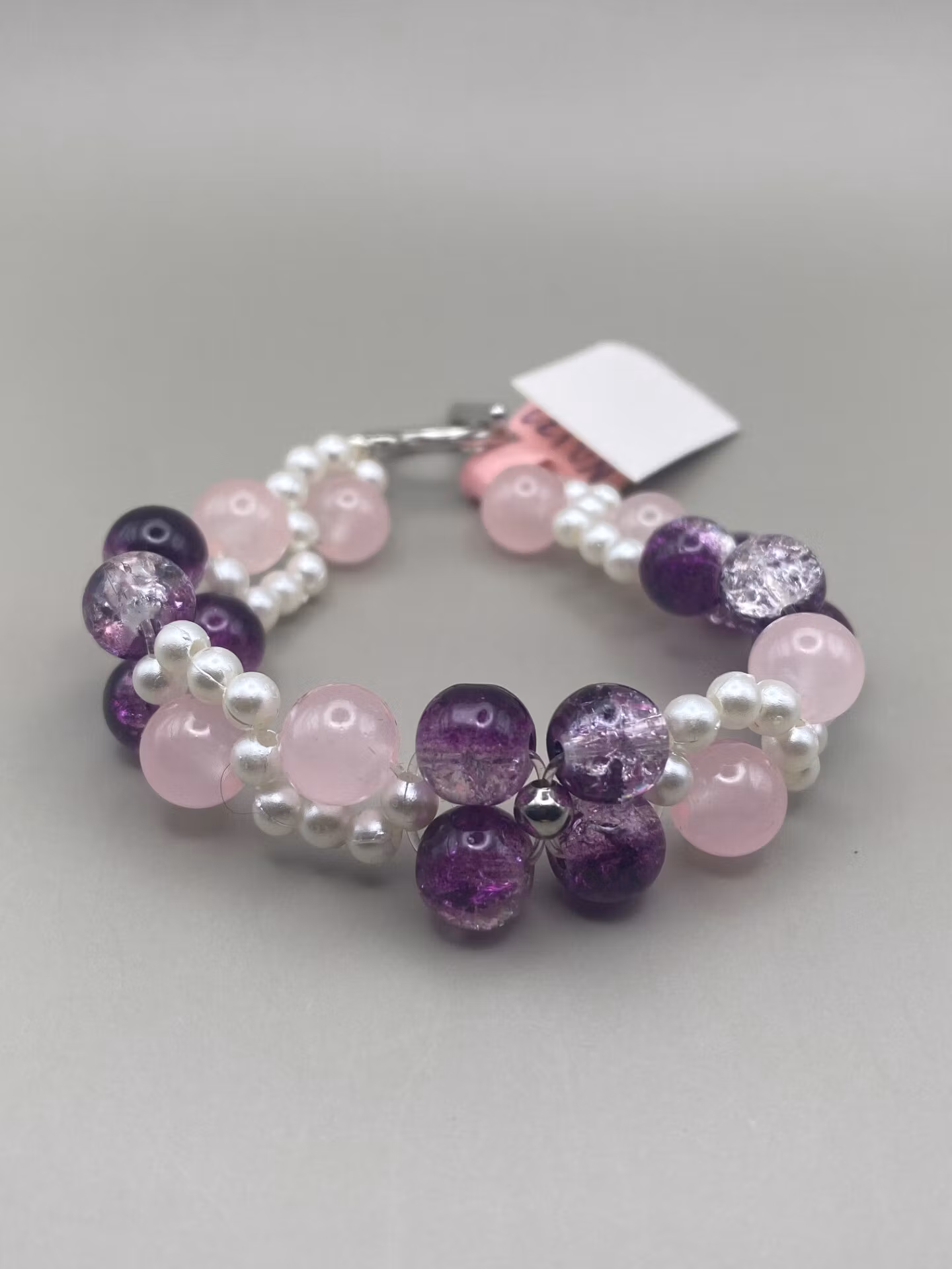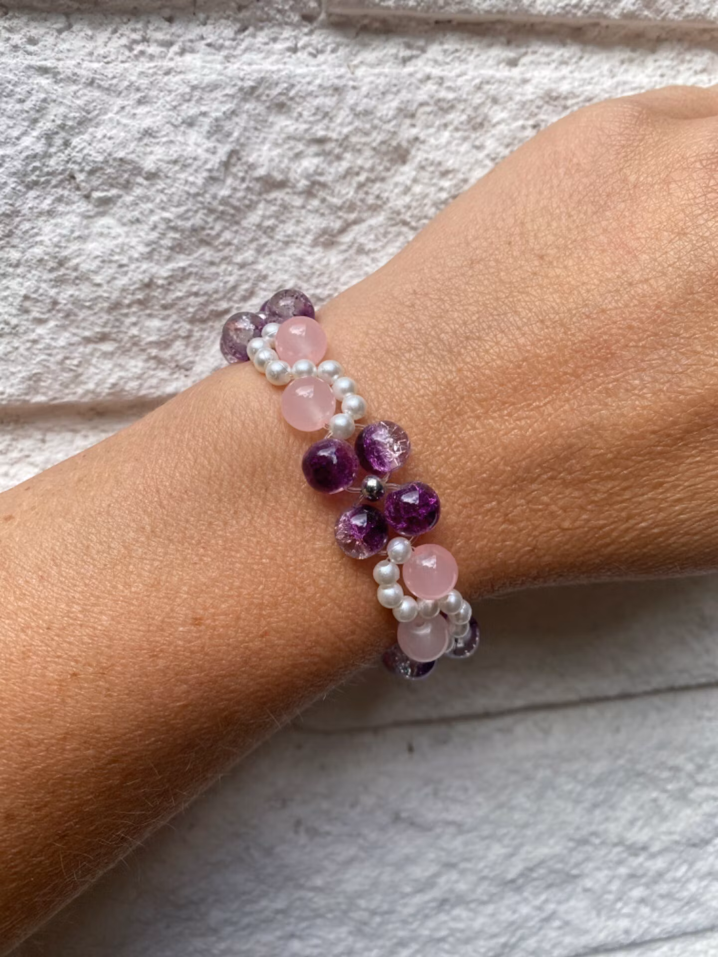 Armband i fint brett mönster av ljusrosa glaspärlor, vita vaxade pärlor och lila och silvermellerade glaspärlor. Till skillnad från mina go-to-armband har denna