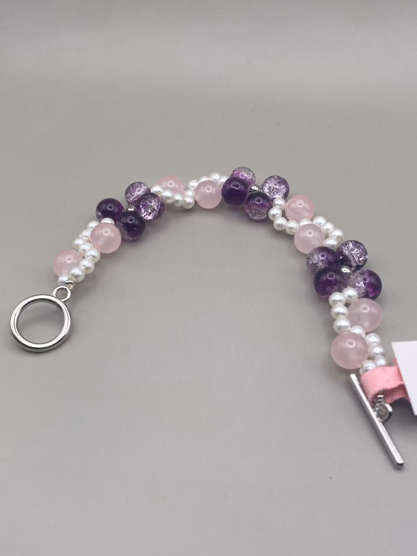 Armband i fint brett mönster av ljusrosa glaspärlor, vita vaxade pärlor och lila och silvermellerade glaspärlor. Till skillnad från mina go-to-armband har denna ett silverfärgat spänne.