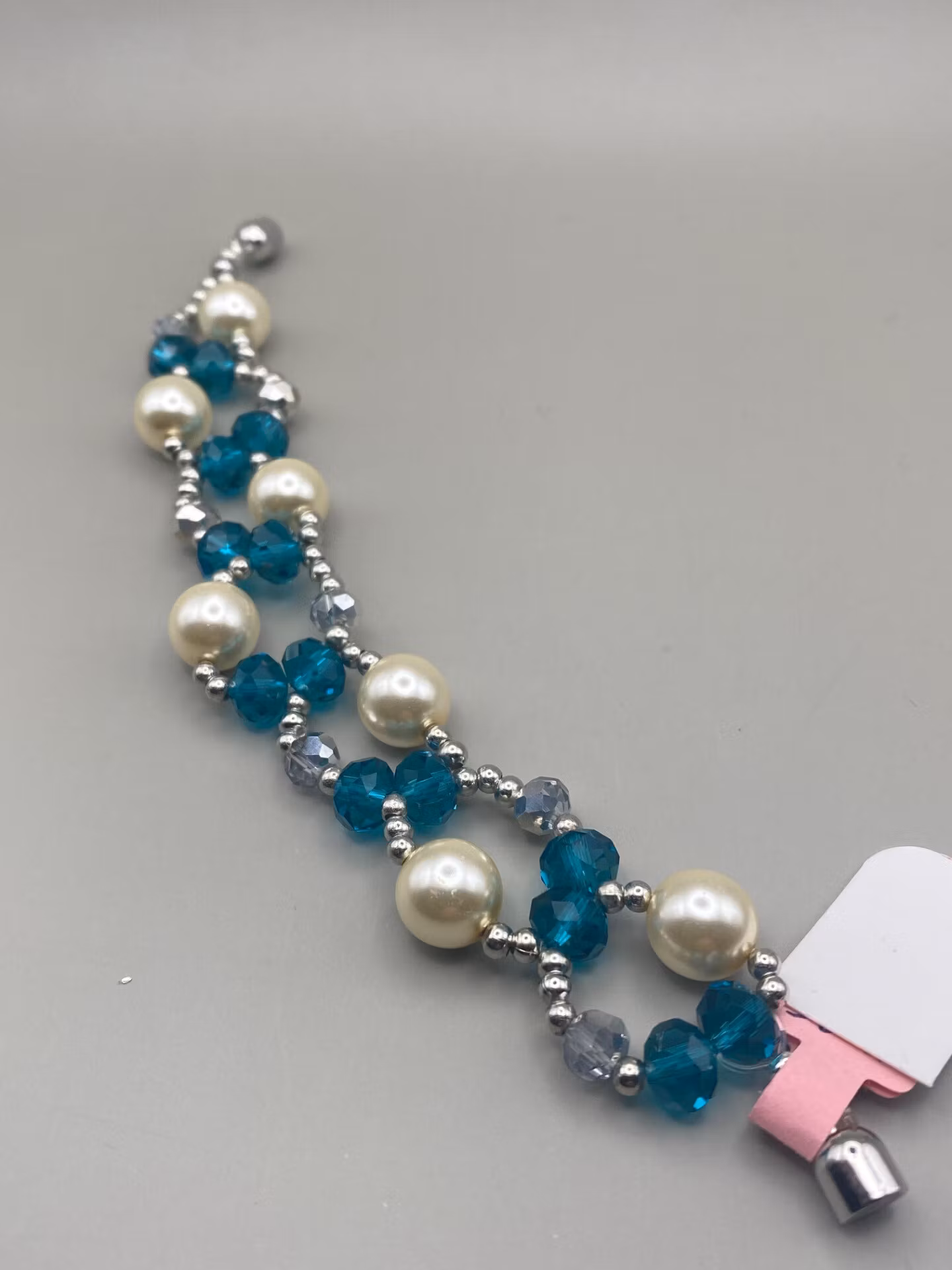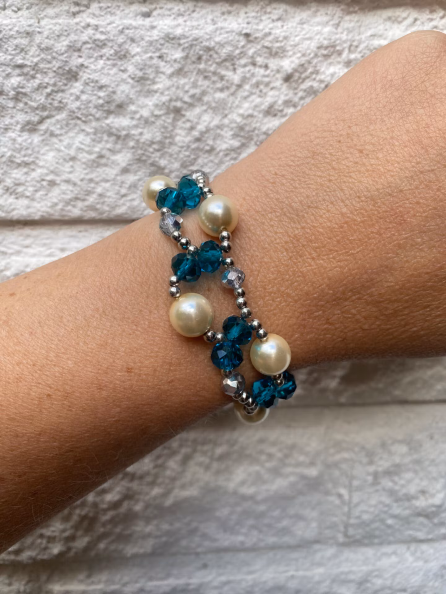 Armband i fint brett oregelbundet mönster av petrolblå/stålblå glaspärlor, beiga vaxade blanka pärlor, silverfärgade glaspärlor samt samt silverfärgade små pärl