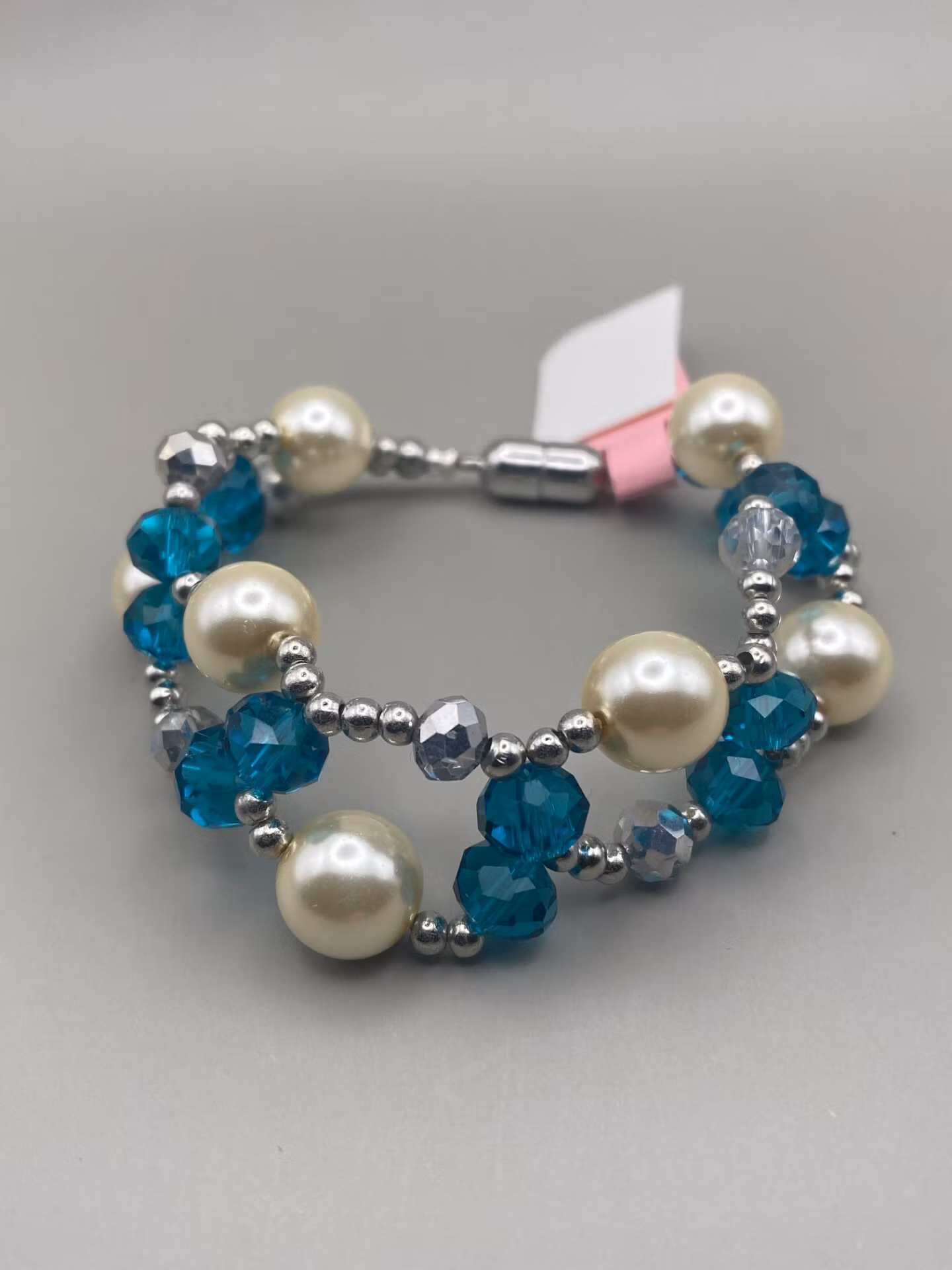 Armband i fint brett oregelbundet mönster av petrolblå/stålblå glaspärlor, beiga vaxade blanka pärlor, silverfärgade glaspärlor samt samt silverfärgade små pärlor. Till skillnad från mina go-to-armband har denna ett silverfärgat magnetiskt spänne.
