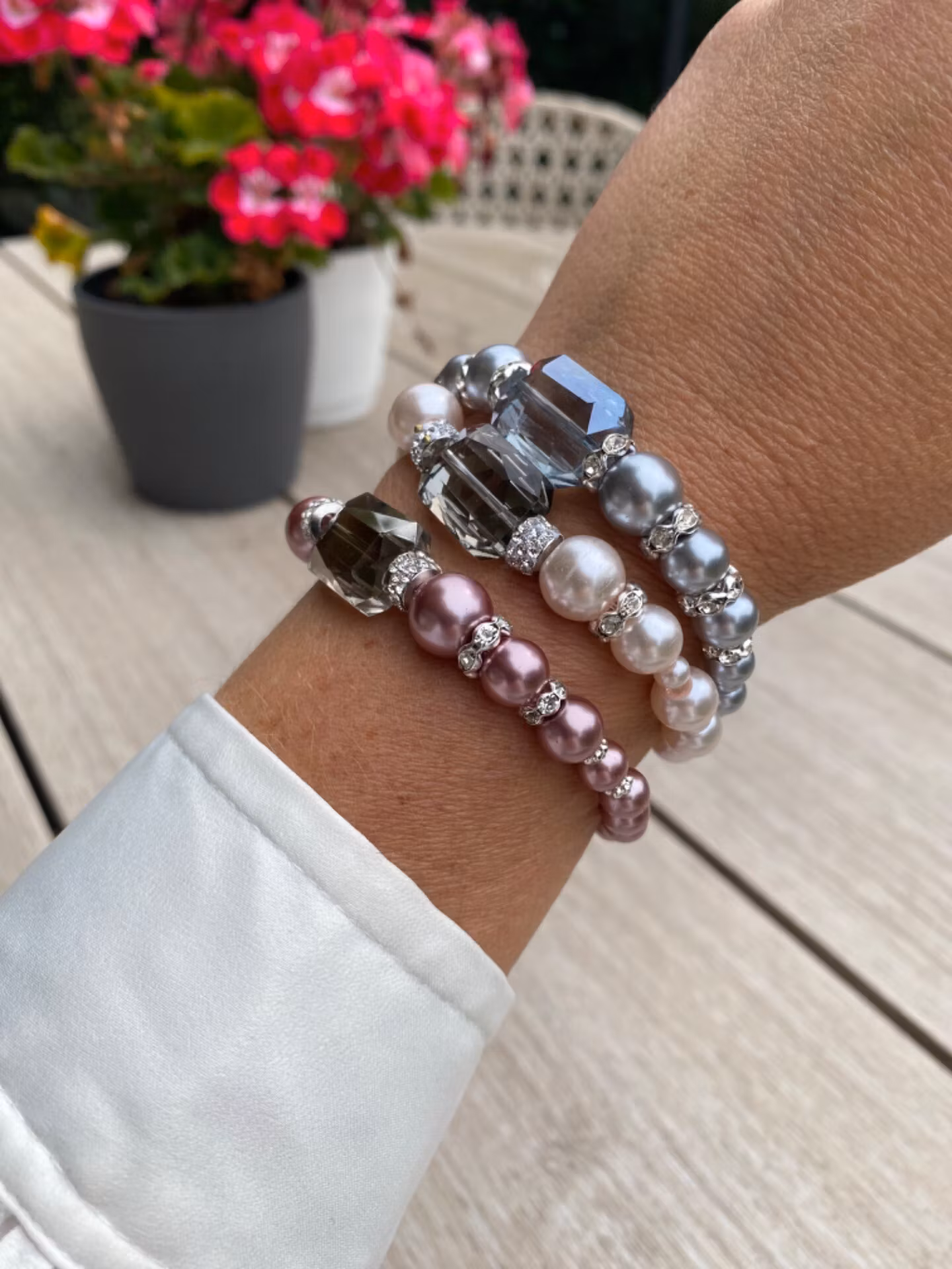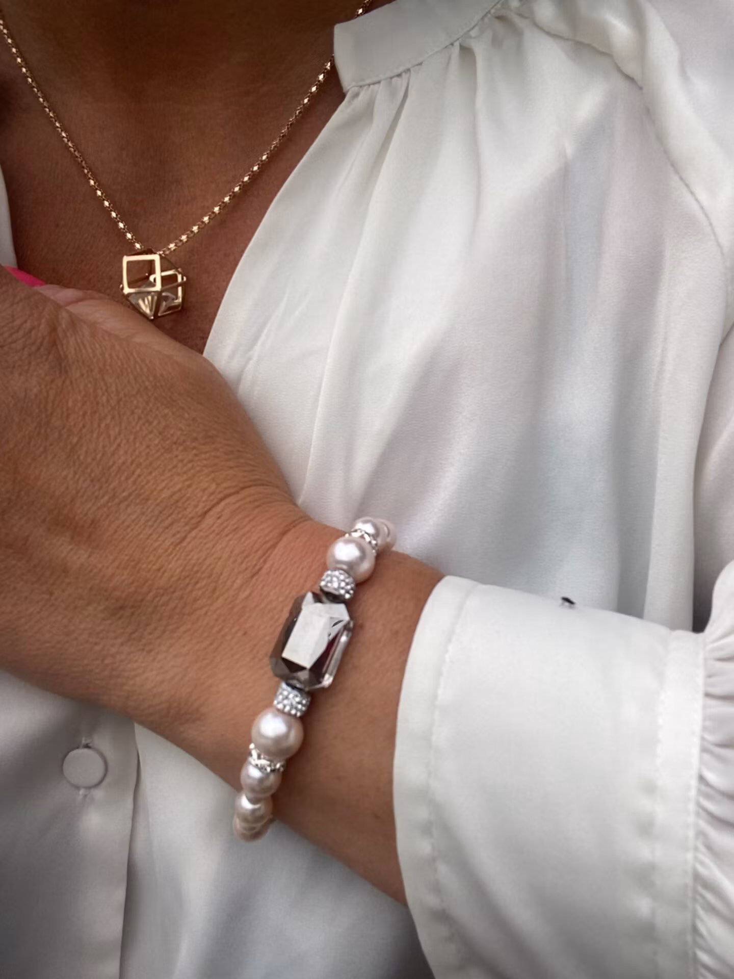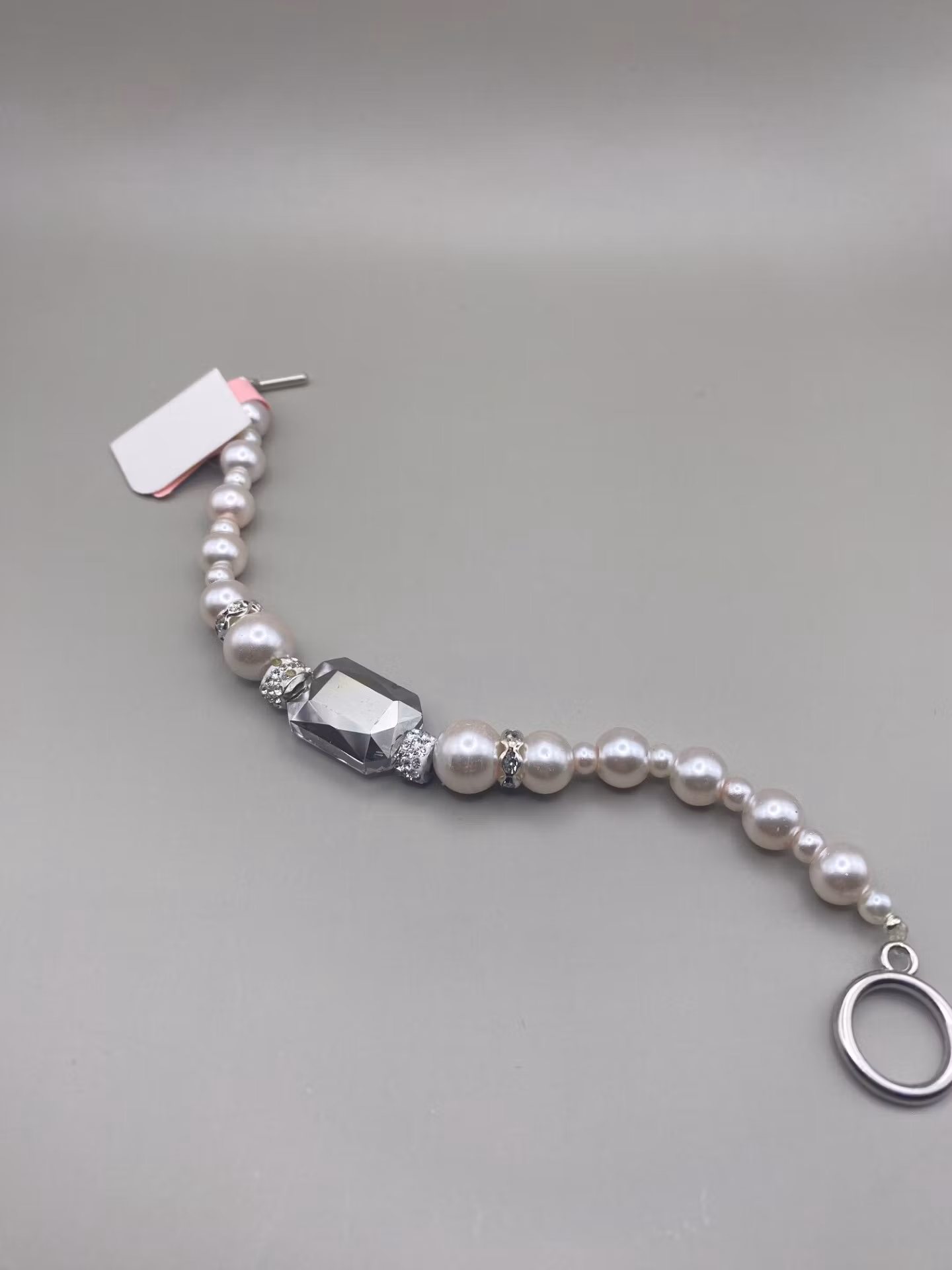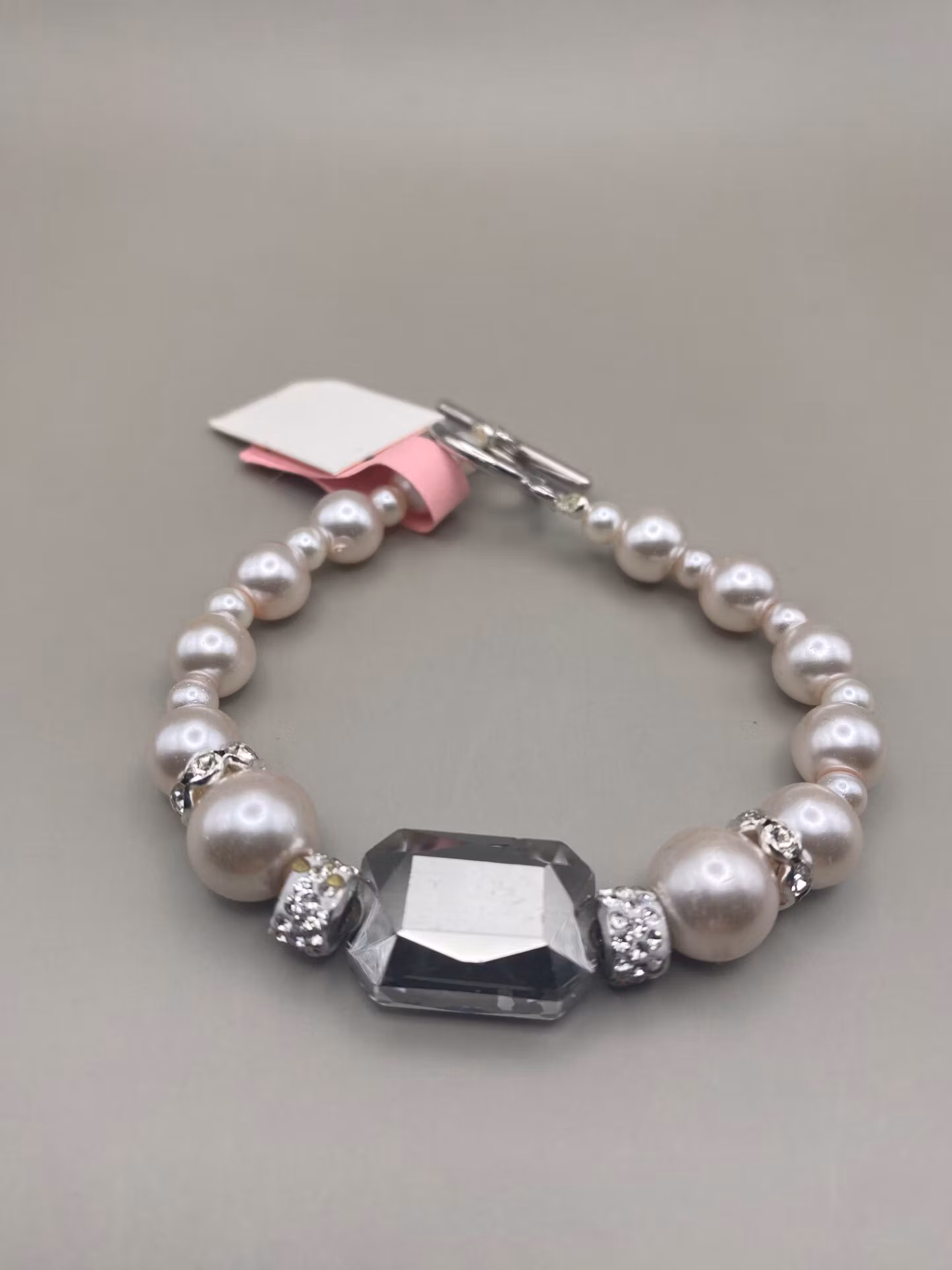Superfint glänsande armband i ljusrosa vaxade pärlor varvat med silverfärgad strass och stor svagt ljusgrå glassten i blickfånget. Spänne i silvergrå färg.