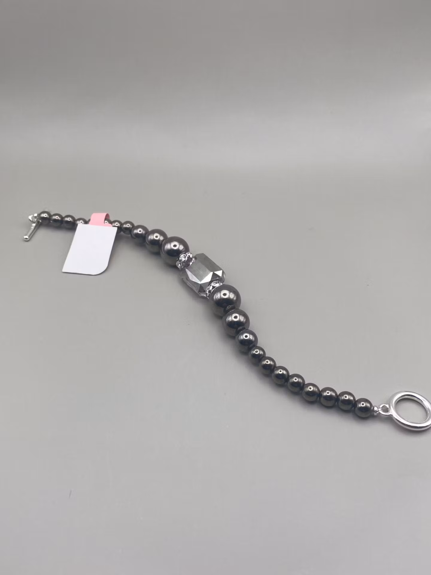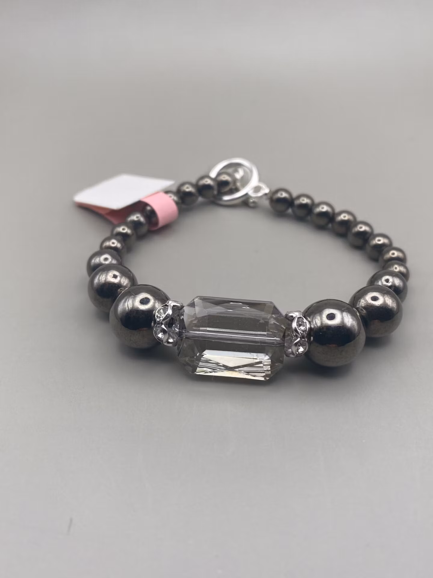 Superfint glänsande armband i metallsvarta blanka pärlor varvat med silverfärgad strass och stor svagt ljusgrå glassten i blickfånget. Spänne i silvergrå färg.