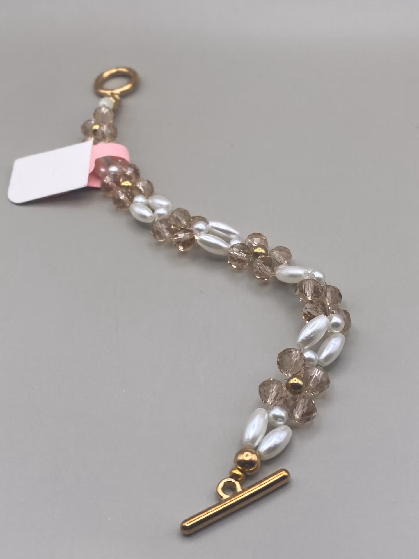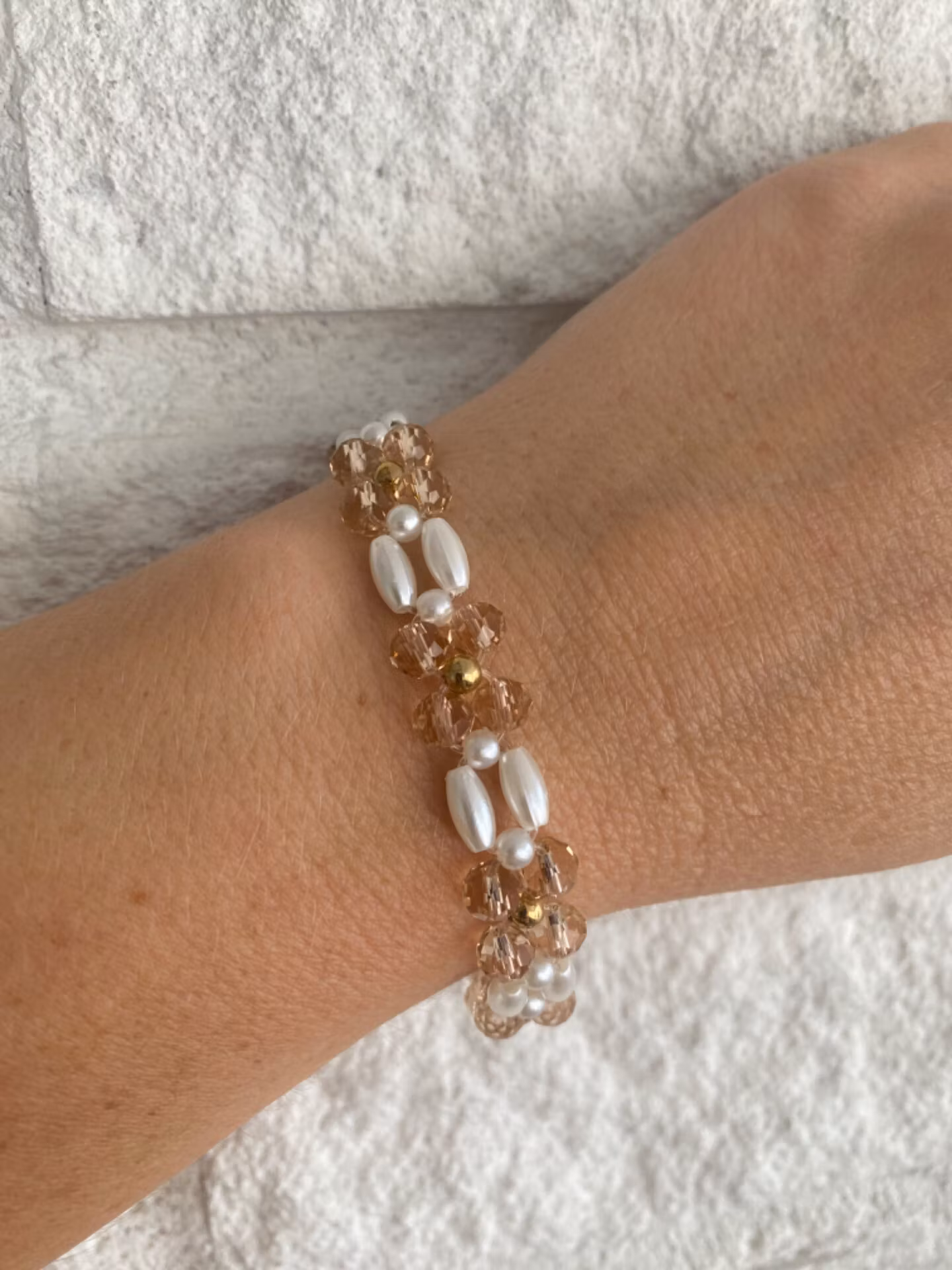 Väldigt vackert armand i fint mönster av benvita avlånga pärlor, små benvita pärlor och champagnefärgade glaspärlor och guldfärgade pärlor som utgör mönster av