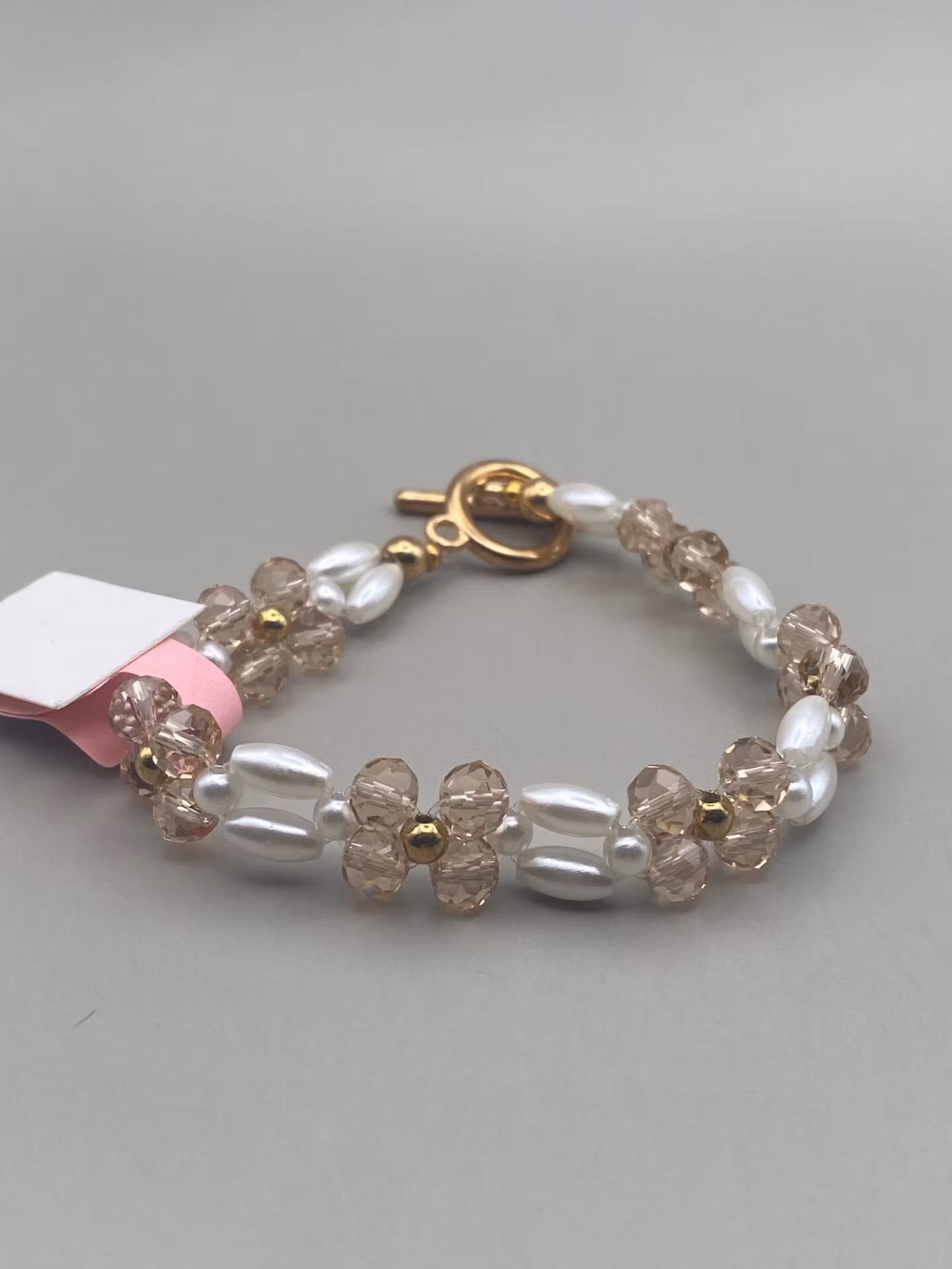 Väldigt vackert armand i fint mönster av benvita avlånga pärlor, små benvita pärlor och champagnefärgade glaspärlor och guldfärgade pärlor som utgör mönster av blomma. Guldfärgat spänne