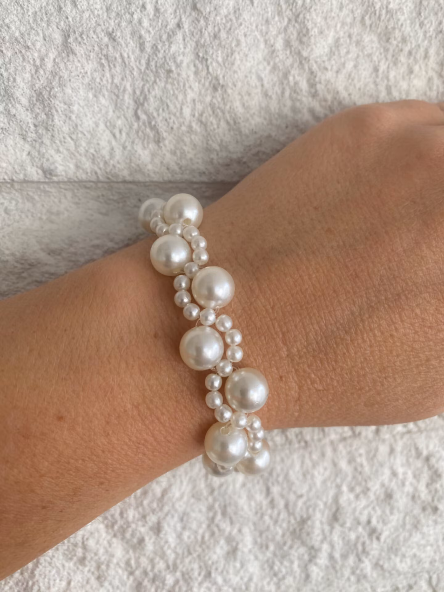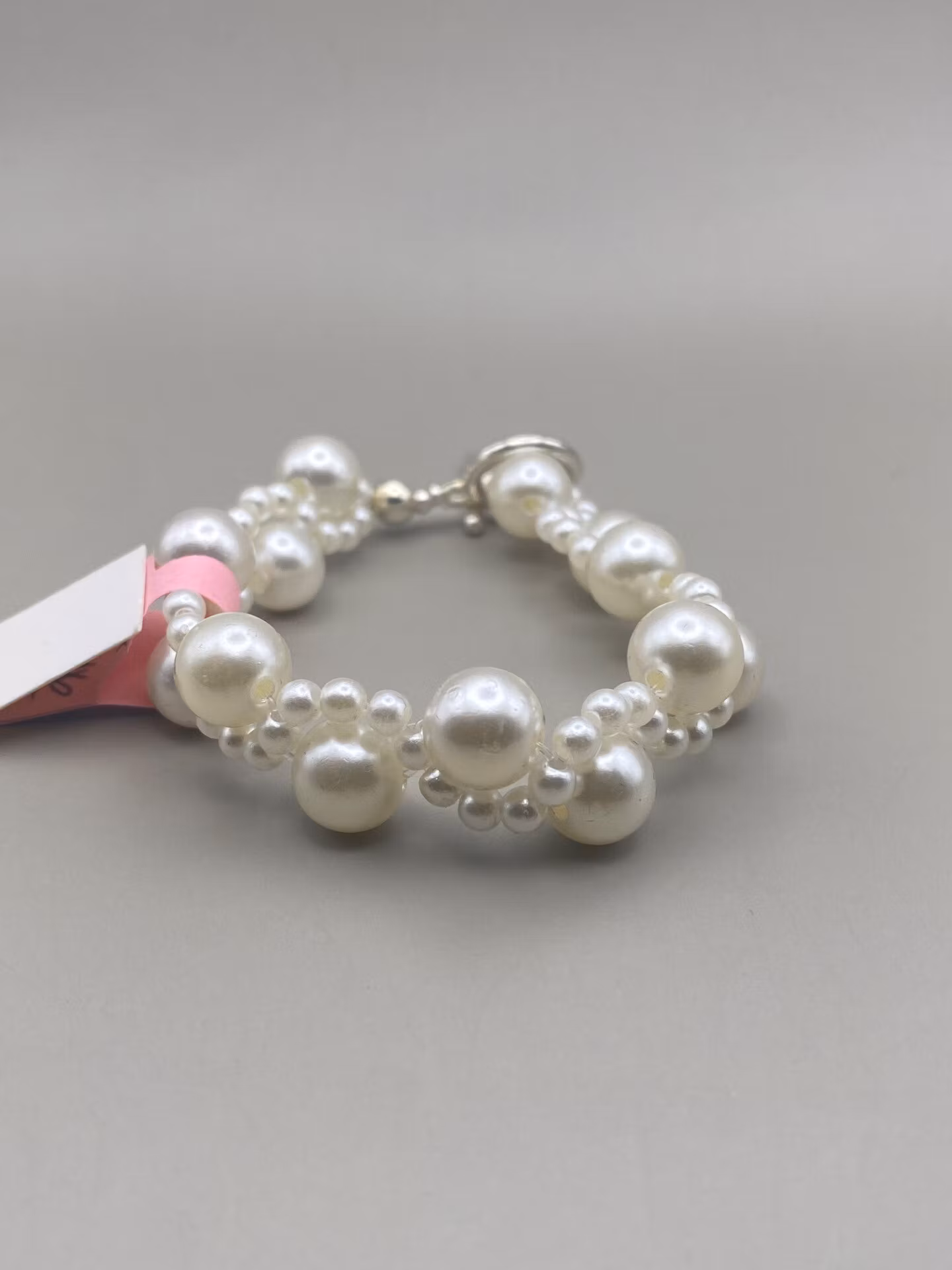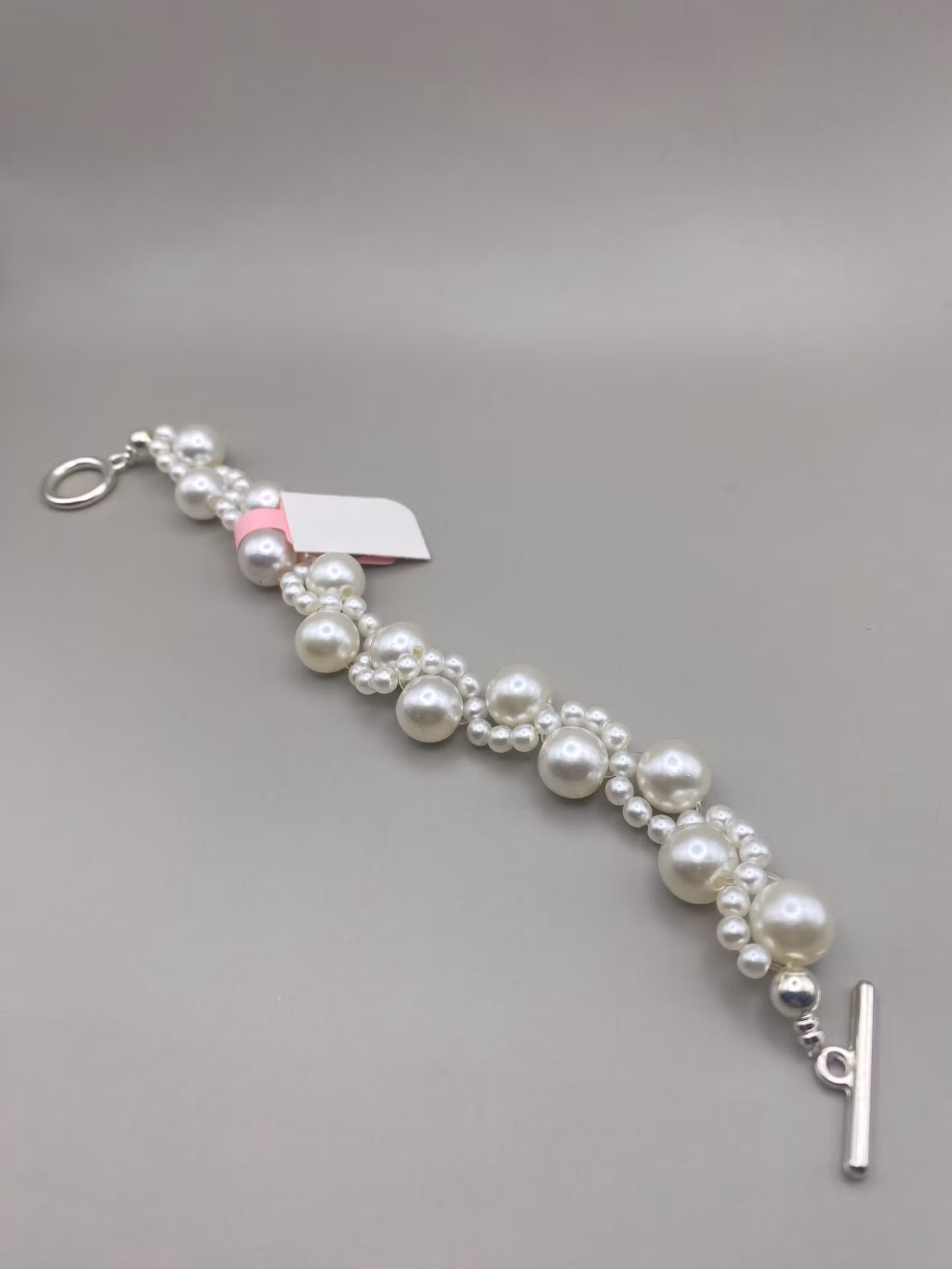 Väldigt vackert armand i fint mönster av benvita stora och små pärlor. Silverfärgat spänne.