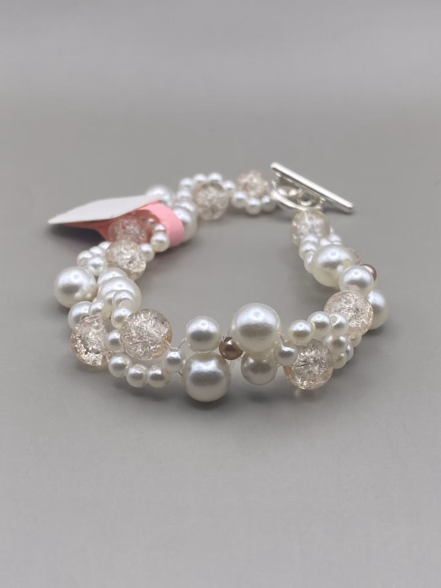 Väldigt vackert armand i fint mönster av benvita stora och små pärlor samt stora beige”bubbliga” glaspärlor samt silverfärgat spänne.