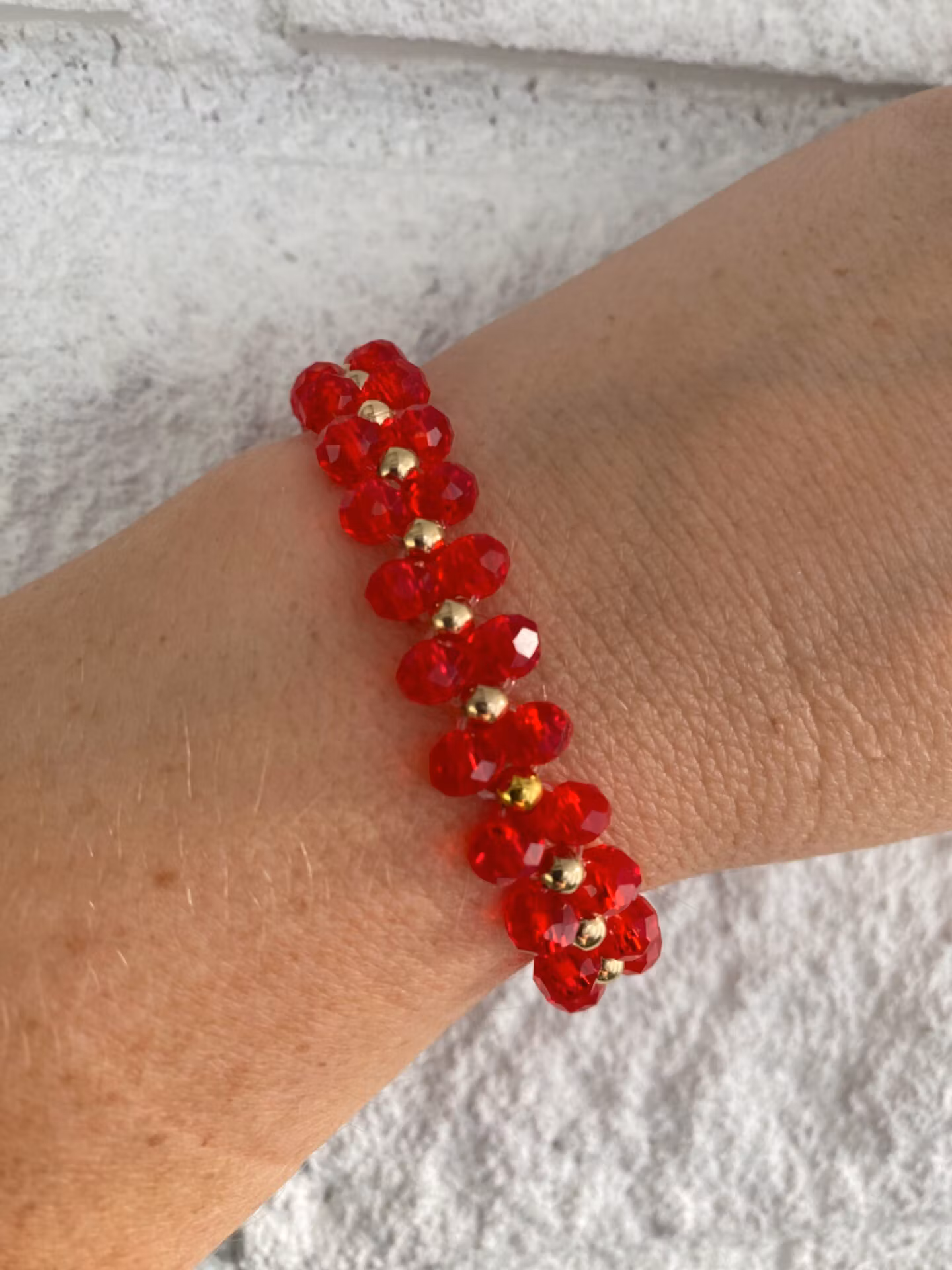 Väldigt stiligt armband i varvat brett mönster av mellanstora röda fasetterade genomskinliga glaspärlor, guldfärgade mindre pärlorsamt samt guldfärgat spännePär