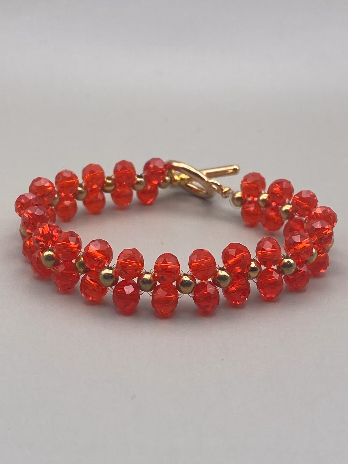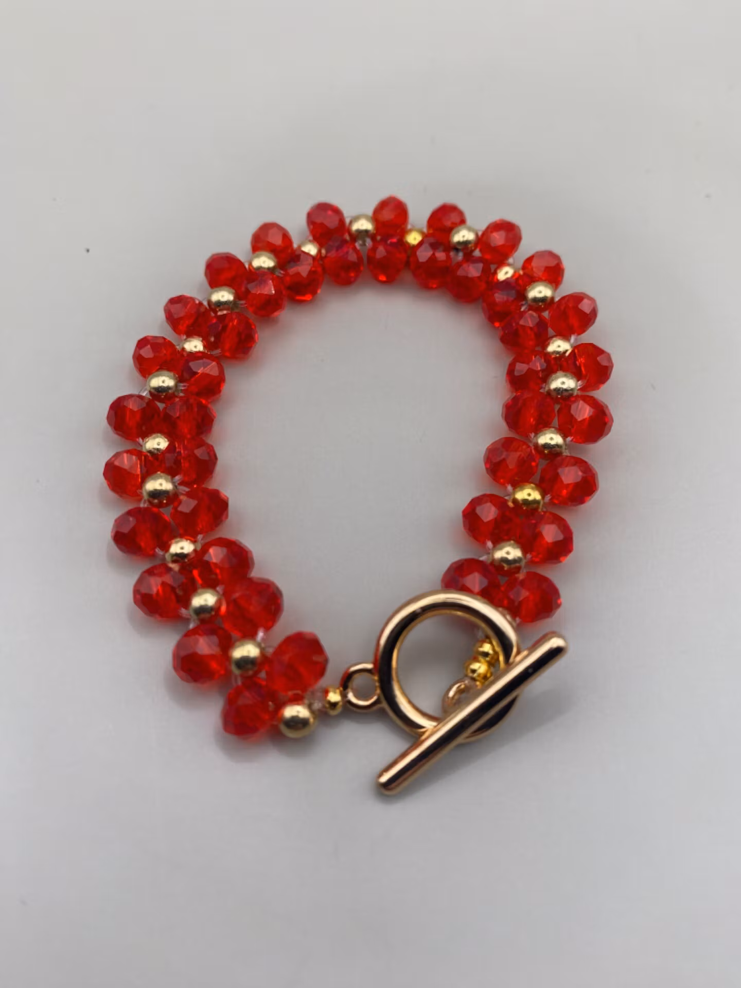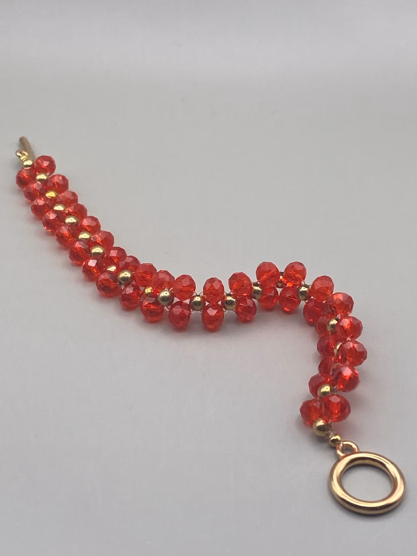 Väldigt stiligt armband i varvat brett mönster av mellanstora röda fasetterade genomskinliga glaspärlor, guldfärgade mindre pärlorsamt samt guldfärgat spänne