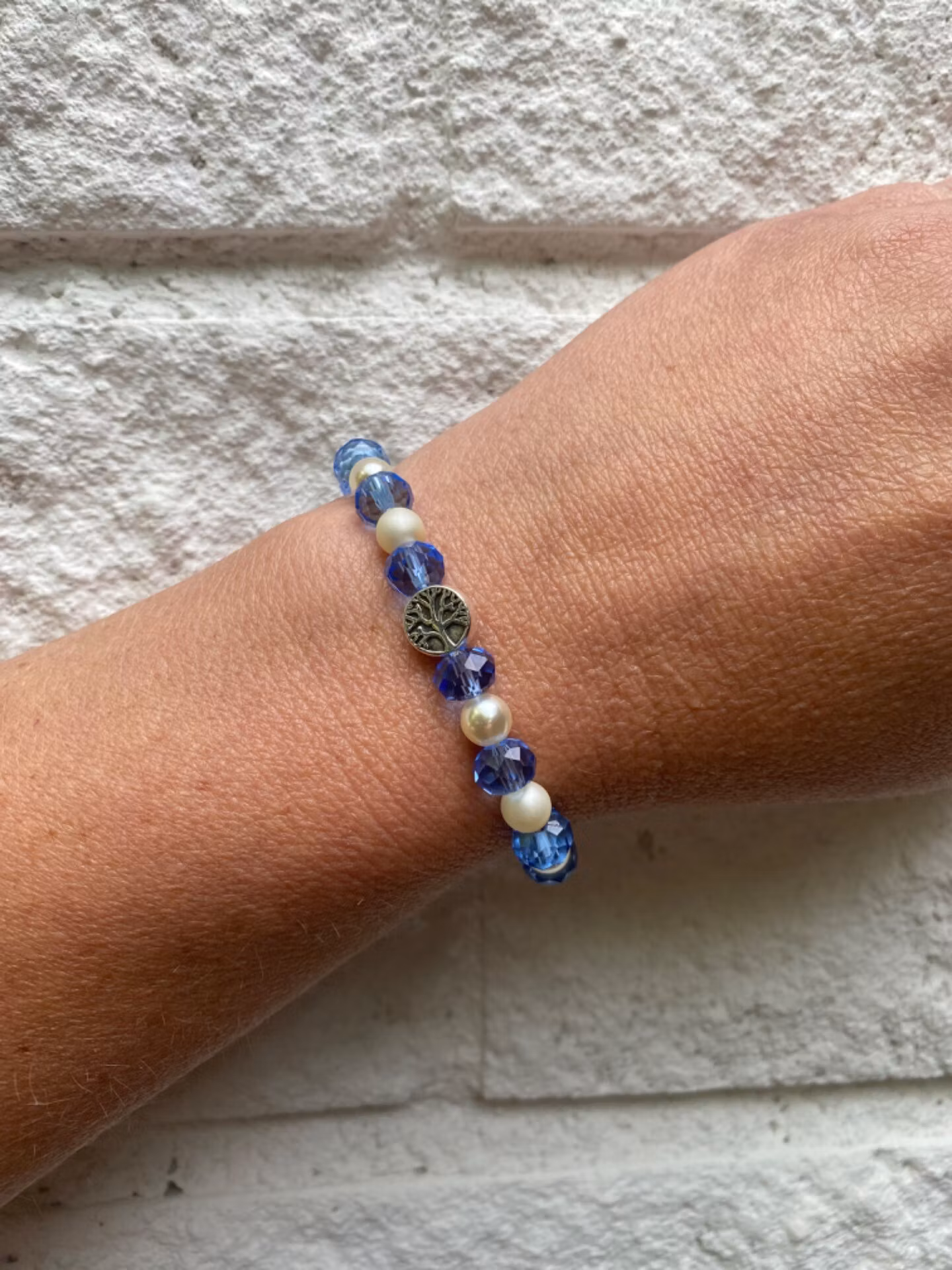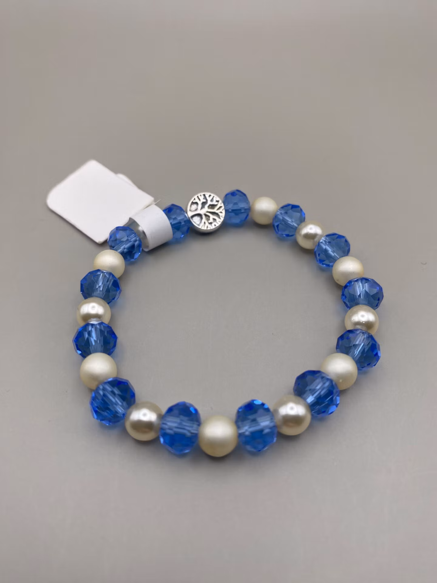 Armband i blå glaspärlor varvat med beiga matta och glansiga pärlor, silverfärgad detalj i blickfånget