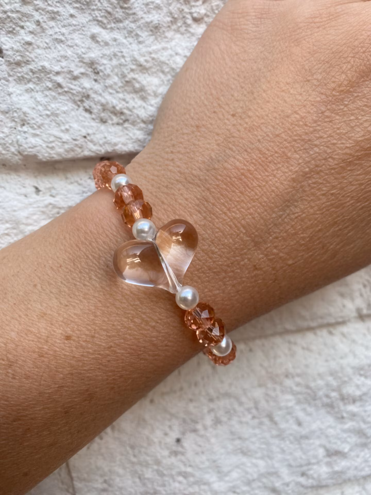 Armband i orange-rosa glaspärlor varvat med vita pärlor och genomskinligt stort hjärta i blickfånget
