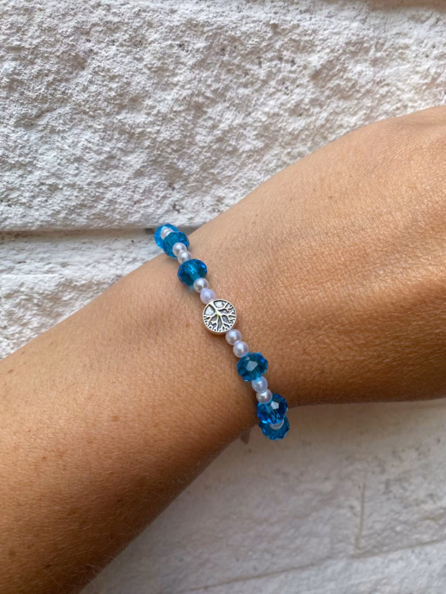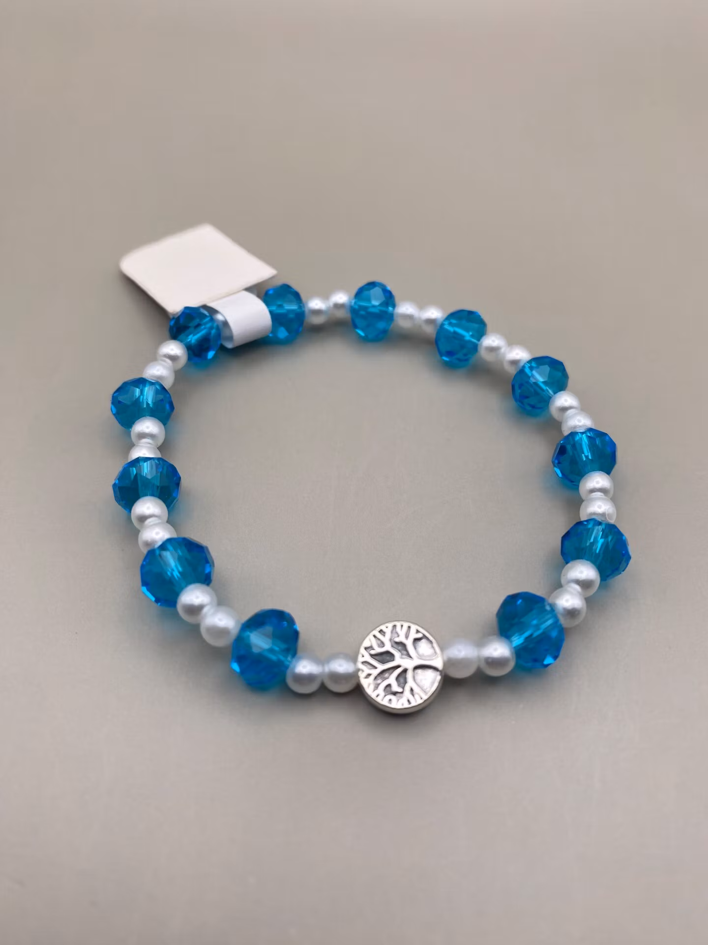 Armband i turkosblå glaspärlor varvat med små vita pärlor och silverfärgad detalj