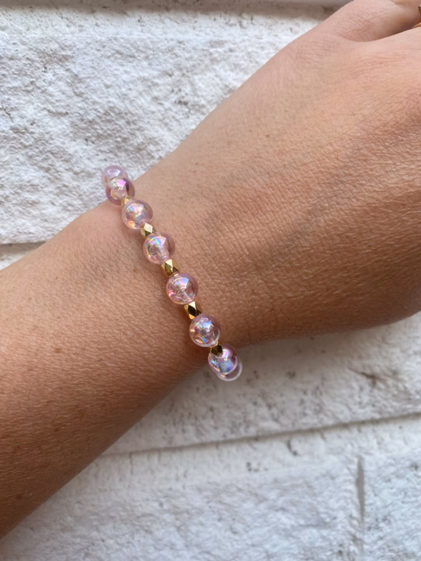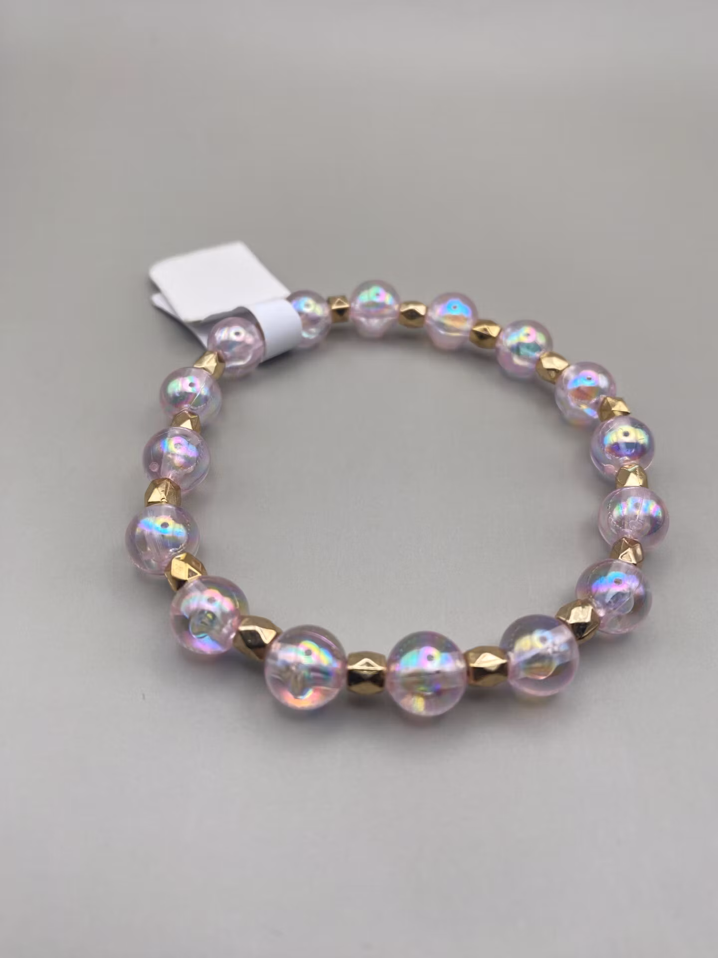 Armband i skimrande hologramiska runda pärlor varvat med gulfärgade kantiga pärlorPärlor 8mmVisas produkten "Tillfälligt slut" efter att du lagt den i din kundk