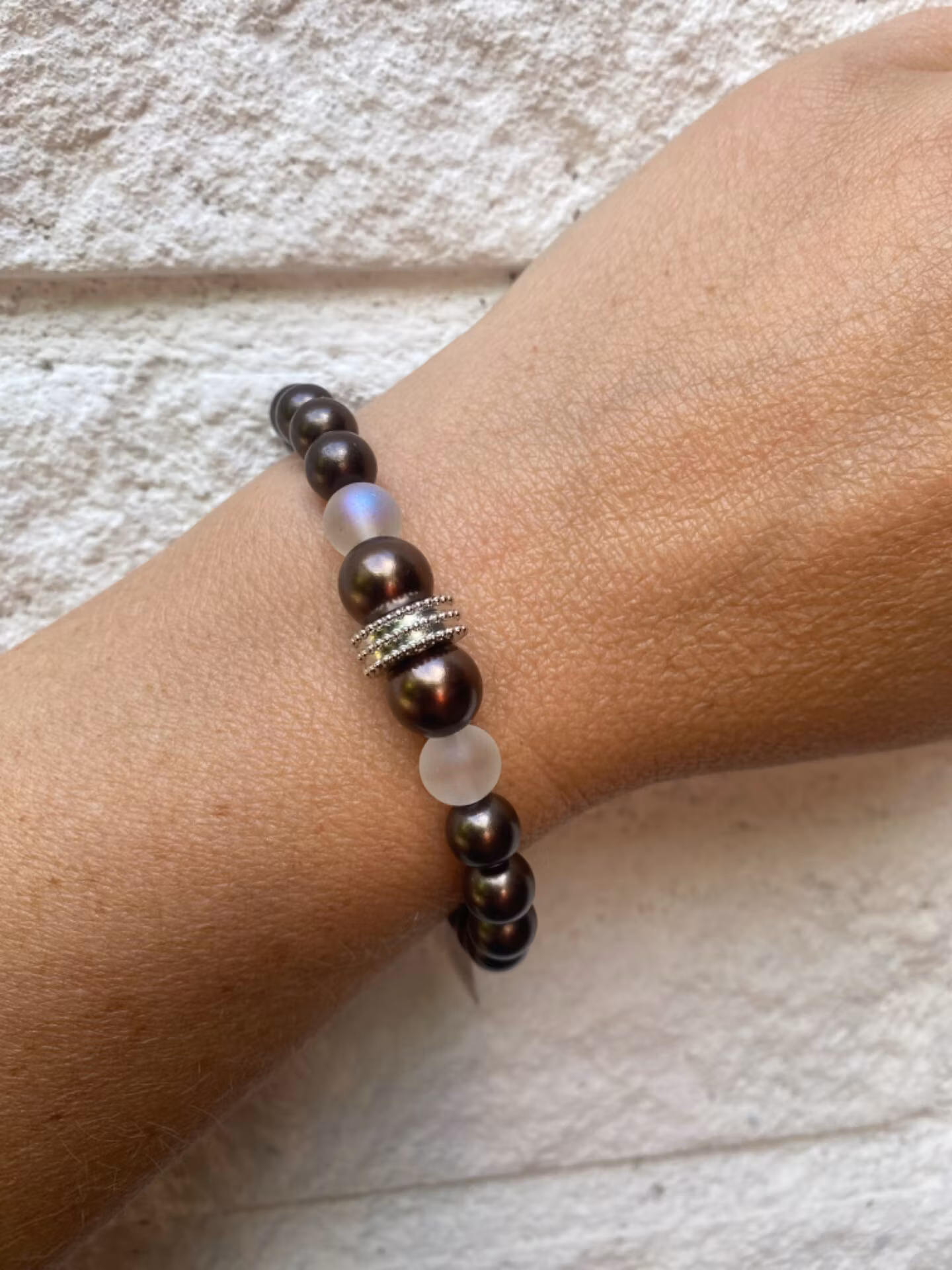 Armband i större mörkbruna pärlor, frostade pärlor och silverfärgad detalj i blickfångetPärlor 8mm, 10mmVisas produkten "Tillfälligt slut" efter att du lagt den