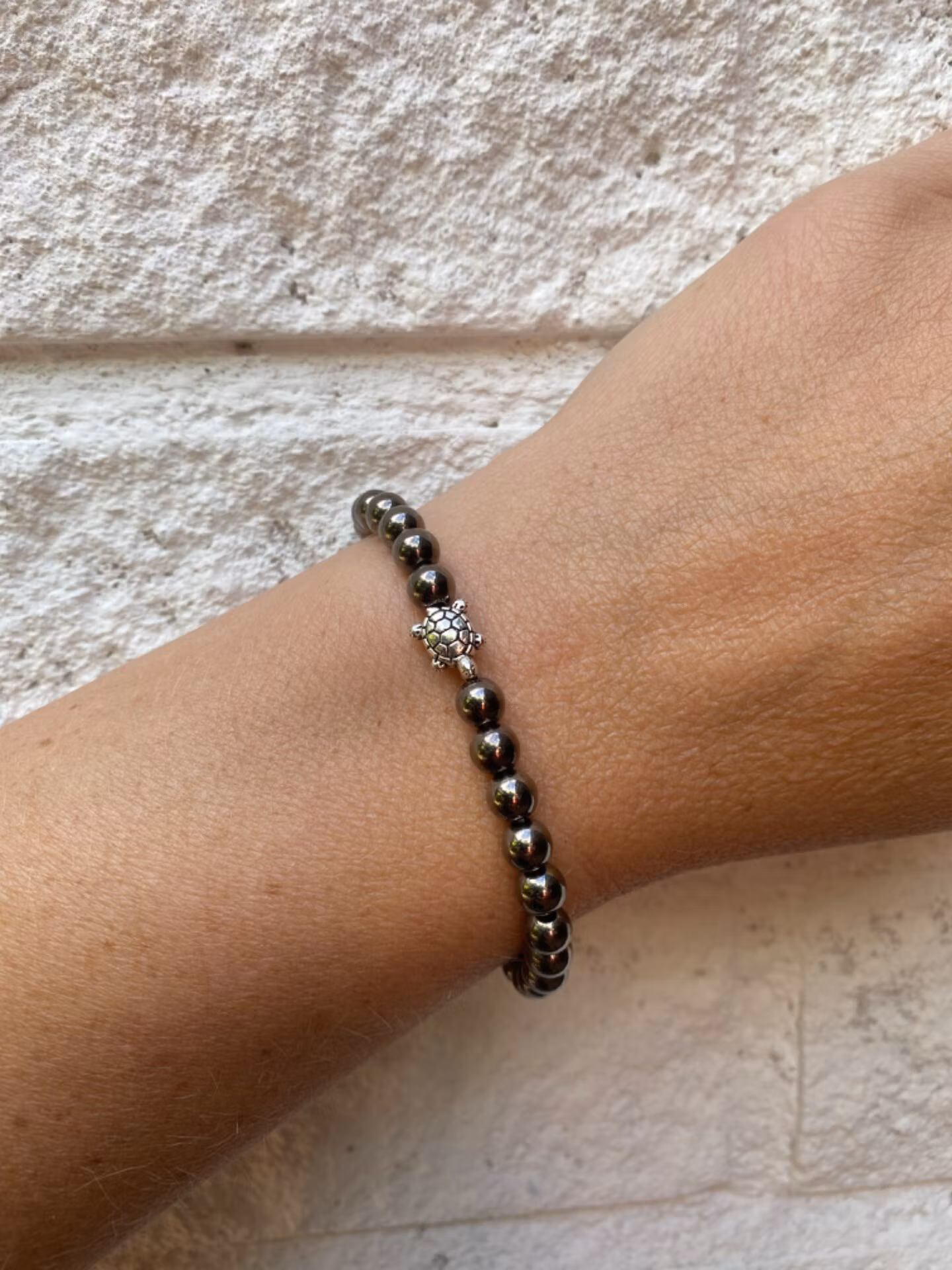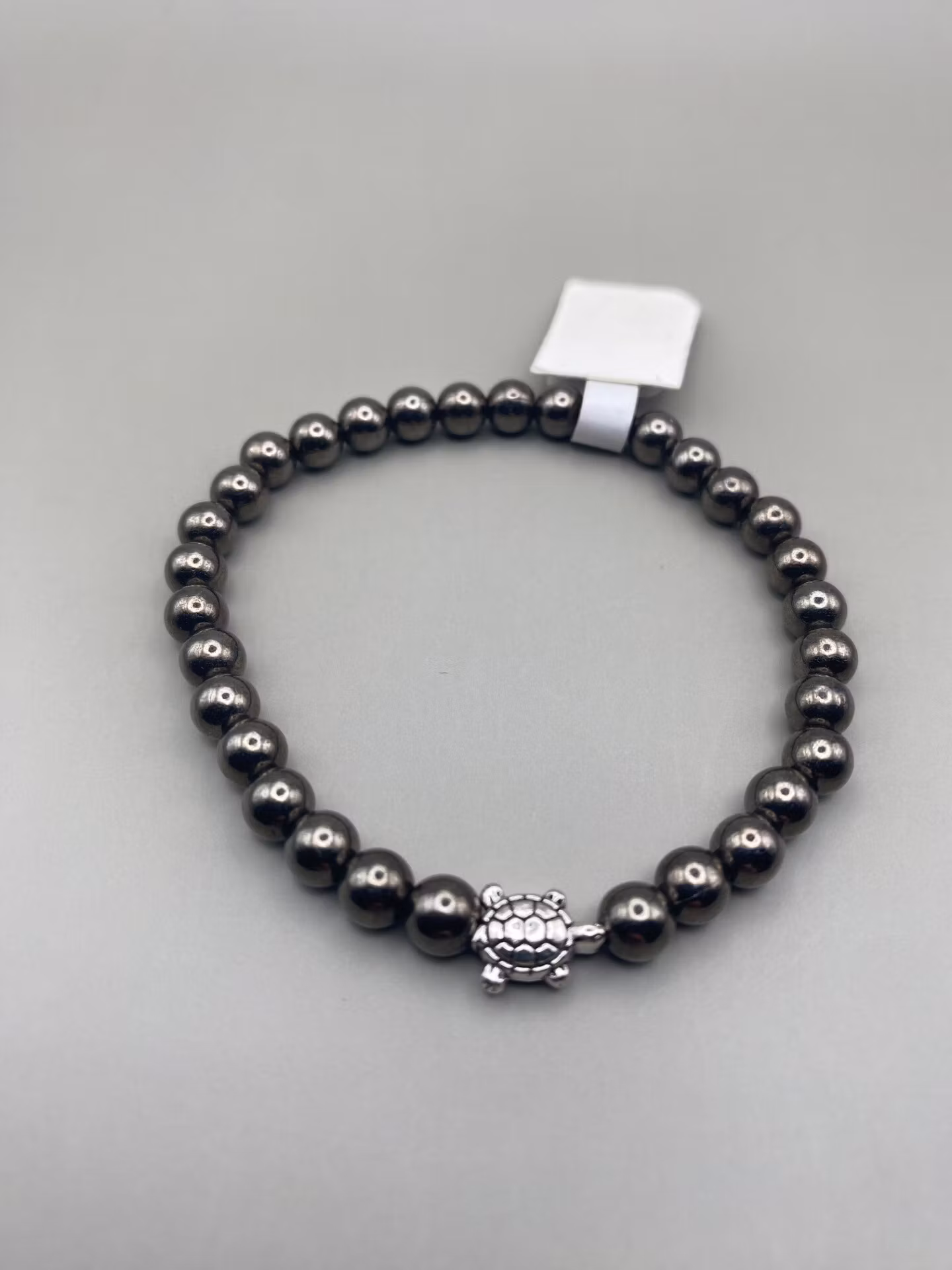 Armband i mindre svartmetallgråfärgade pärlor, liten silverfärgad sköldpadda i blickfångetPärlor 6mmVisas produkten "Tillfälligt slut" efter att du lagt den i d