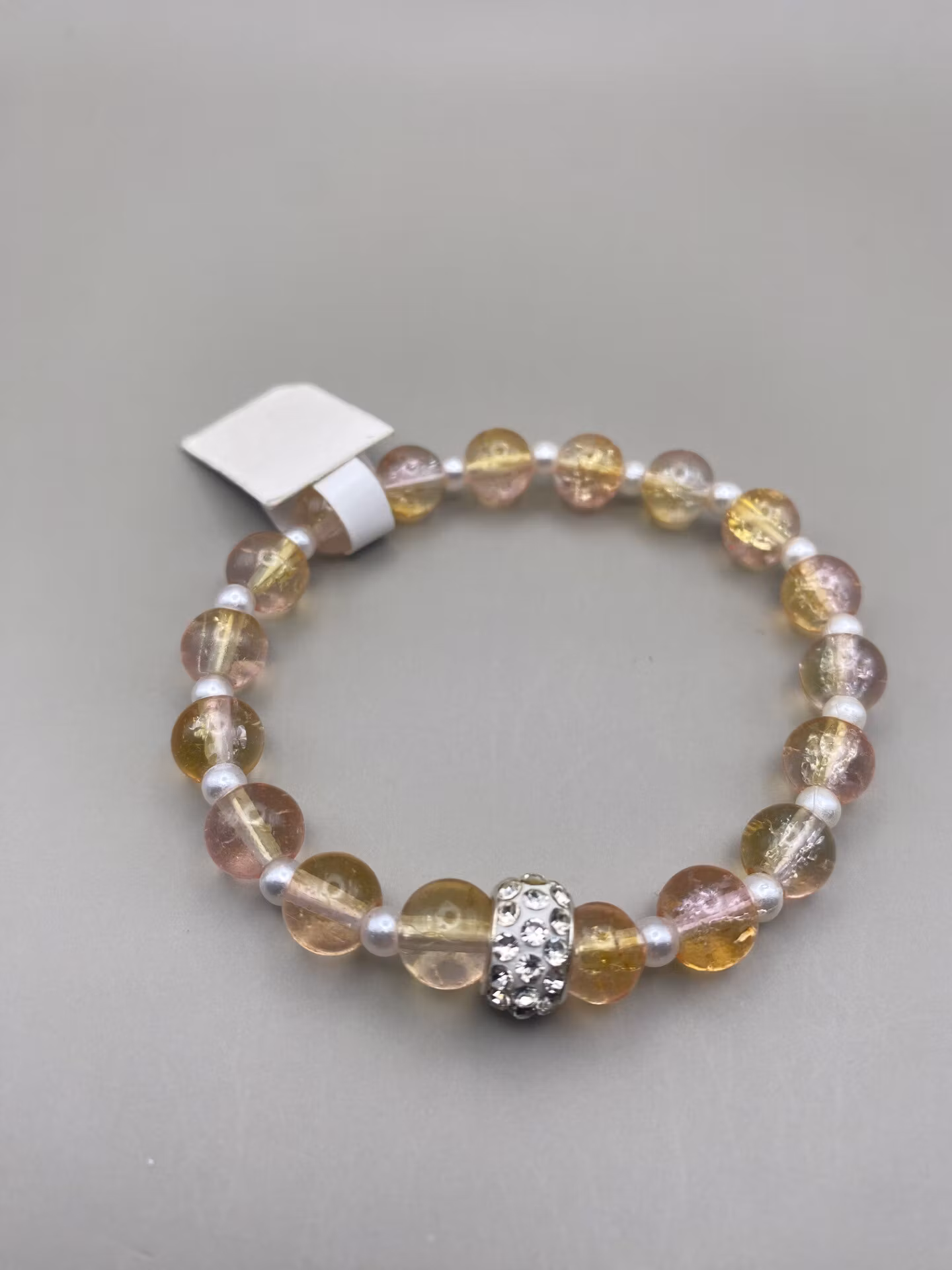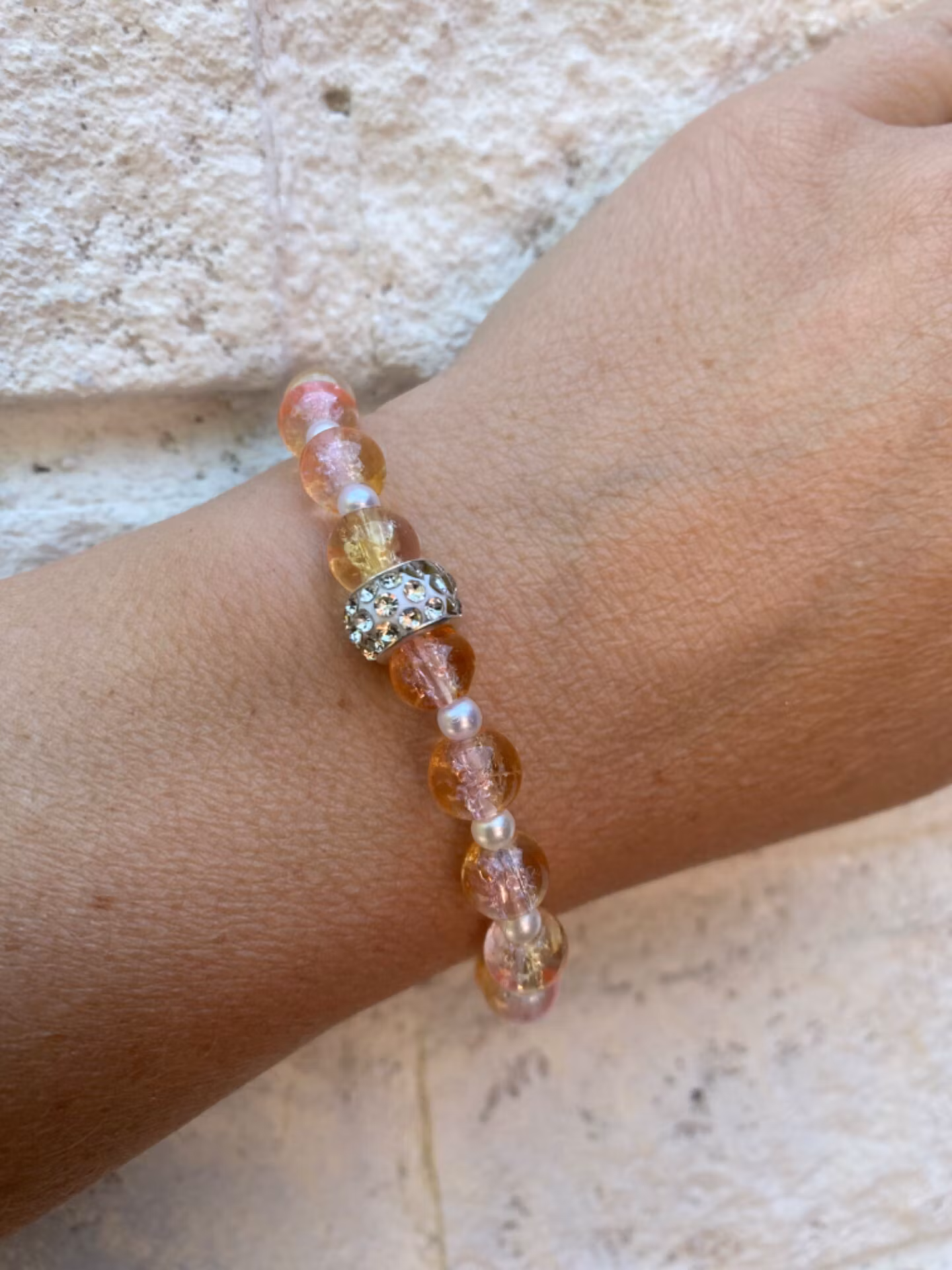 Armband i härligt aprikosa glaspärlor varvat med små vita vaxade pärlor, vit strassdetalj i blickfånget