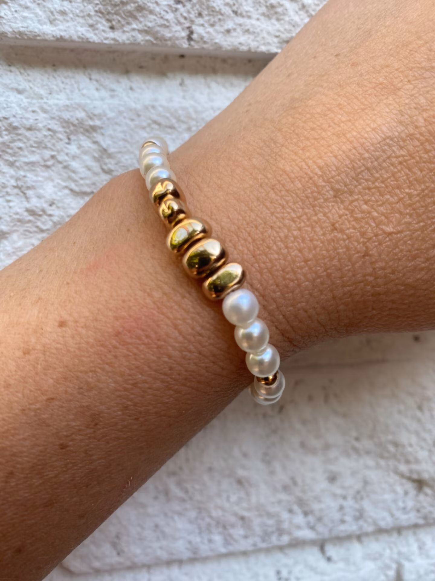 Armband i benvita pärlor varvat med guldfärgade pärlor, större ojämna guldfärgade pärlor i blickfånget