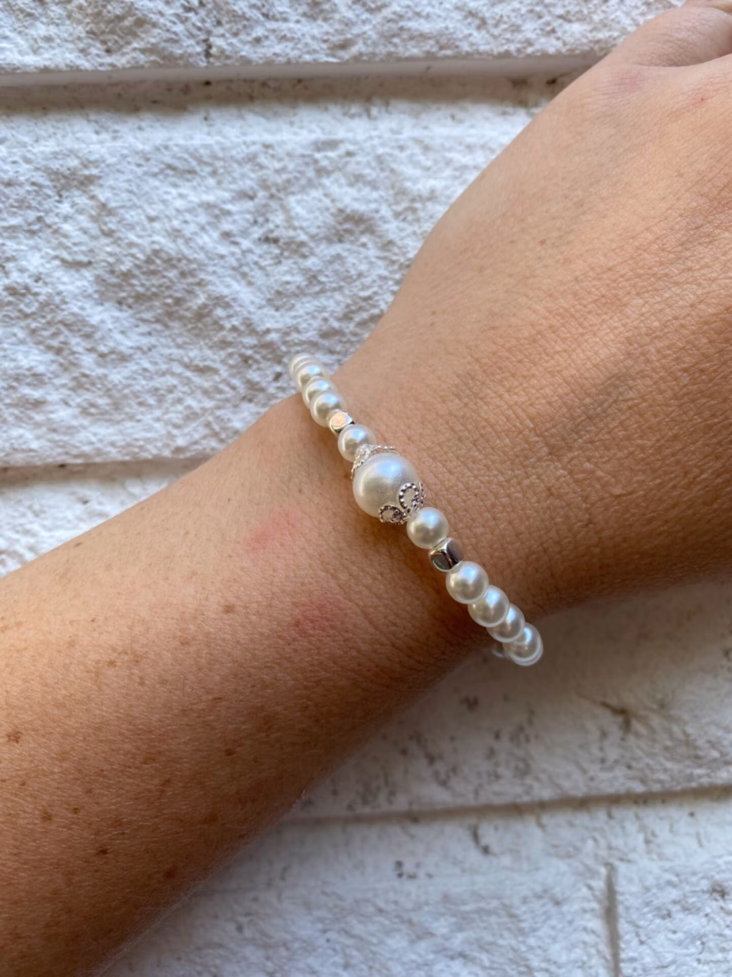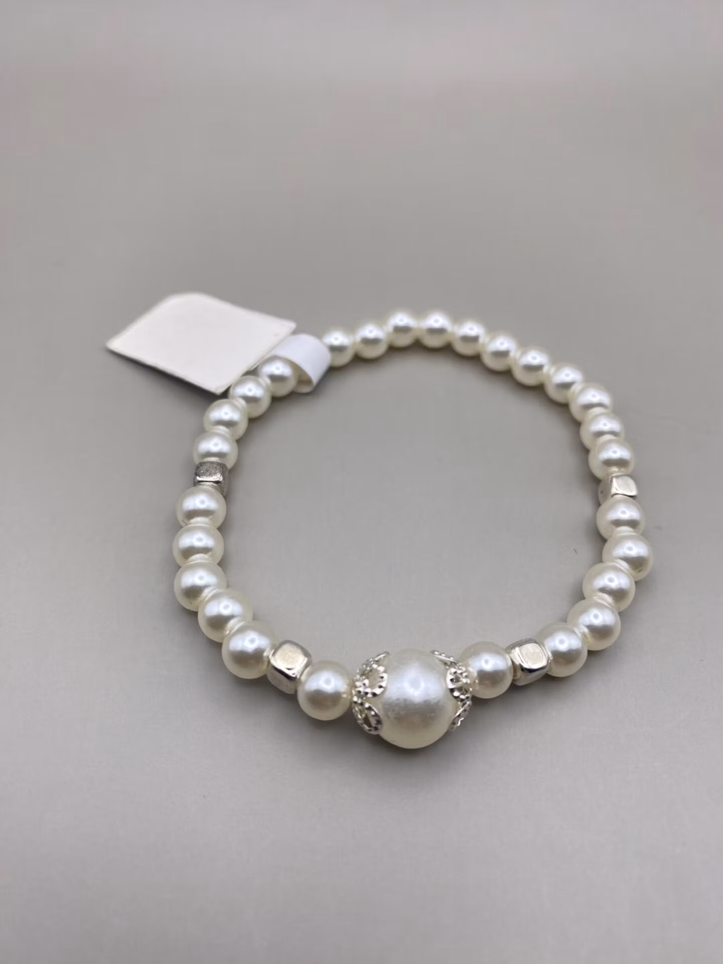 Armband i benvita pärlor, fyrkantiga silverfärgade pärlor samt större vit pärla i blickfånget med silverfärgad detalj.