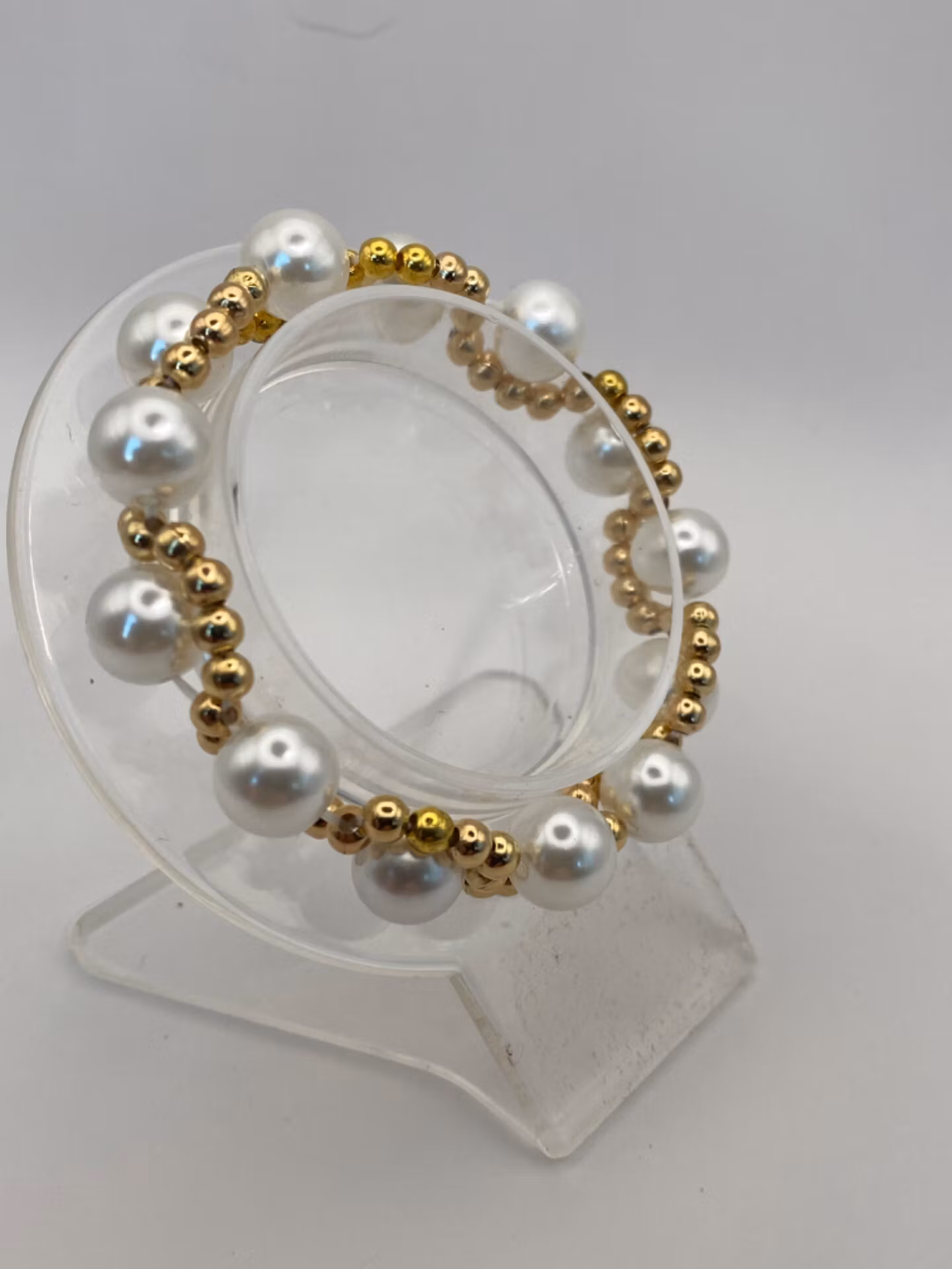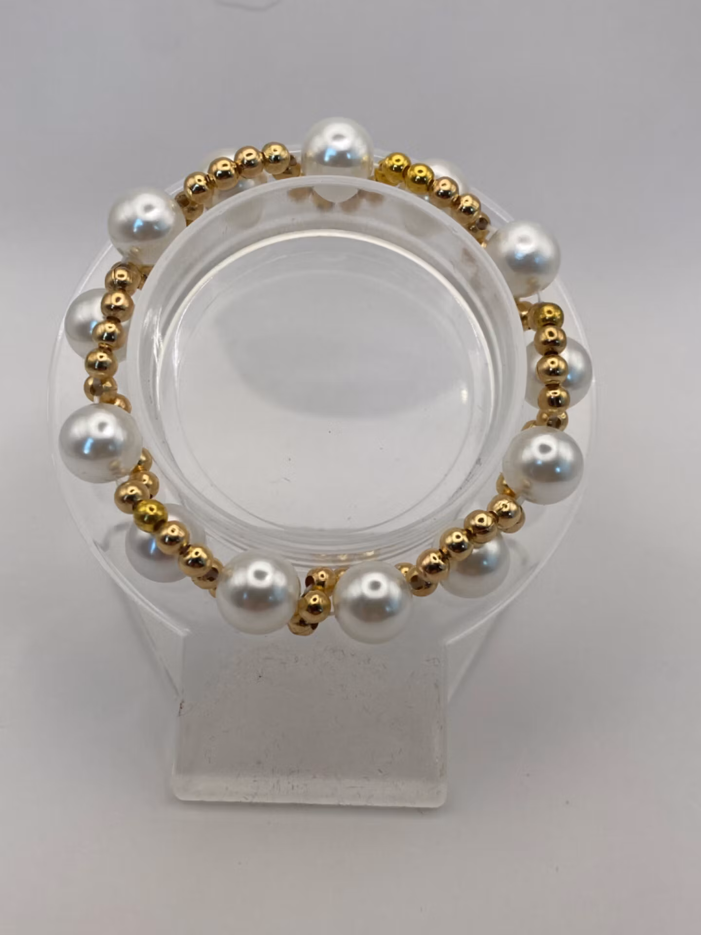 Armband i vackert mönster av stora kritvita pärlor och små guldfärgade pärlor