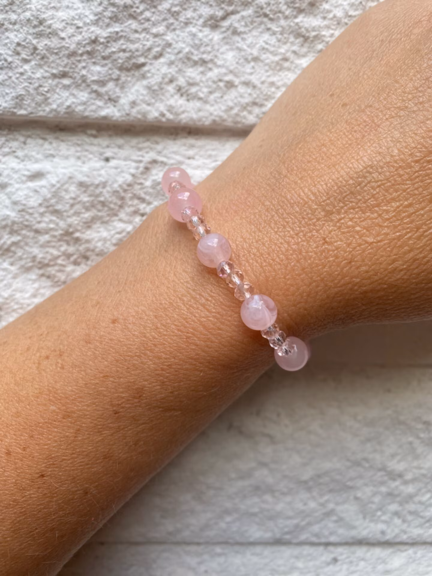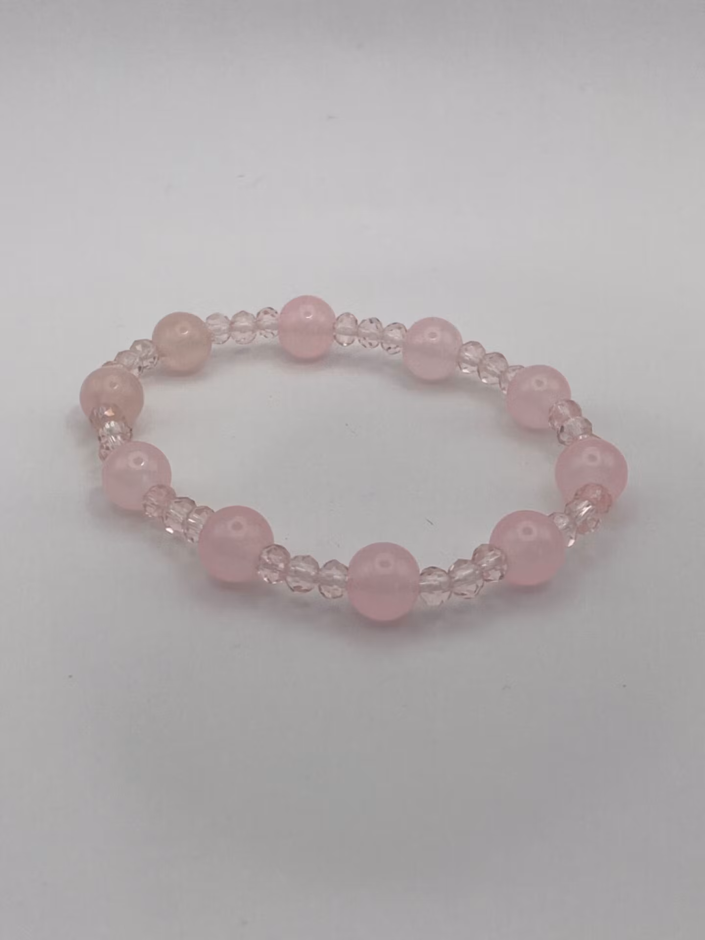Elegant armband av ljusrosa dimmiga glaspärlor varvat med små ljusrosa glaspärlor.
