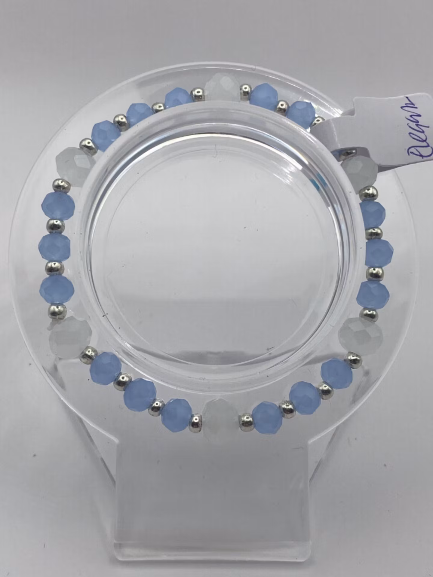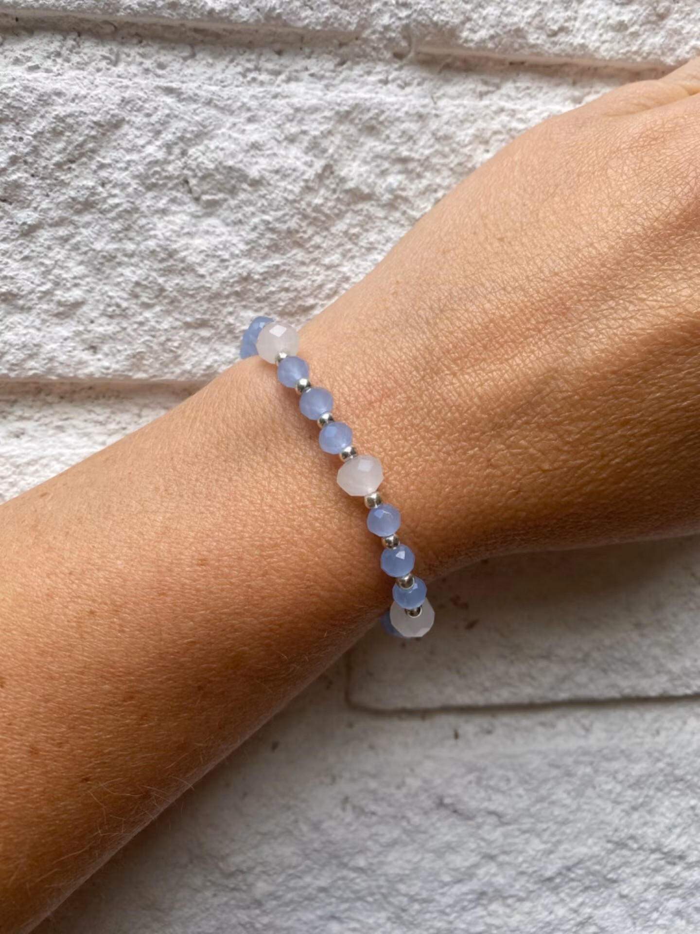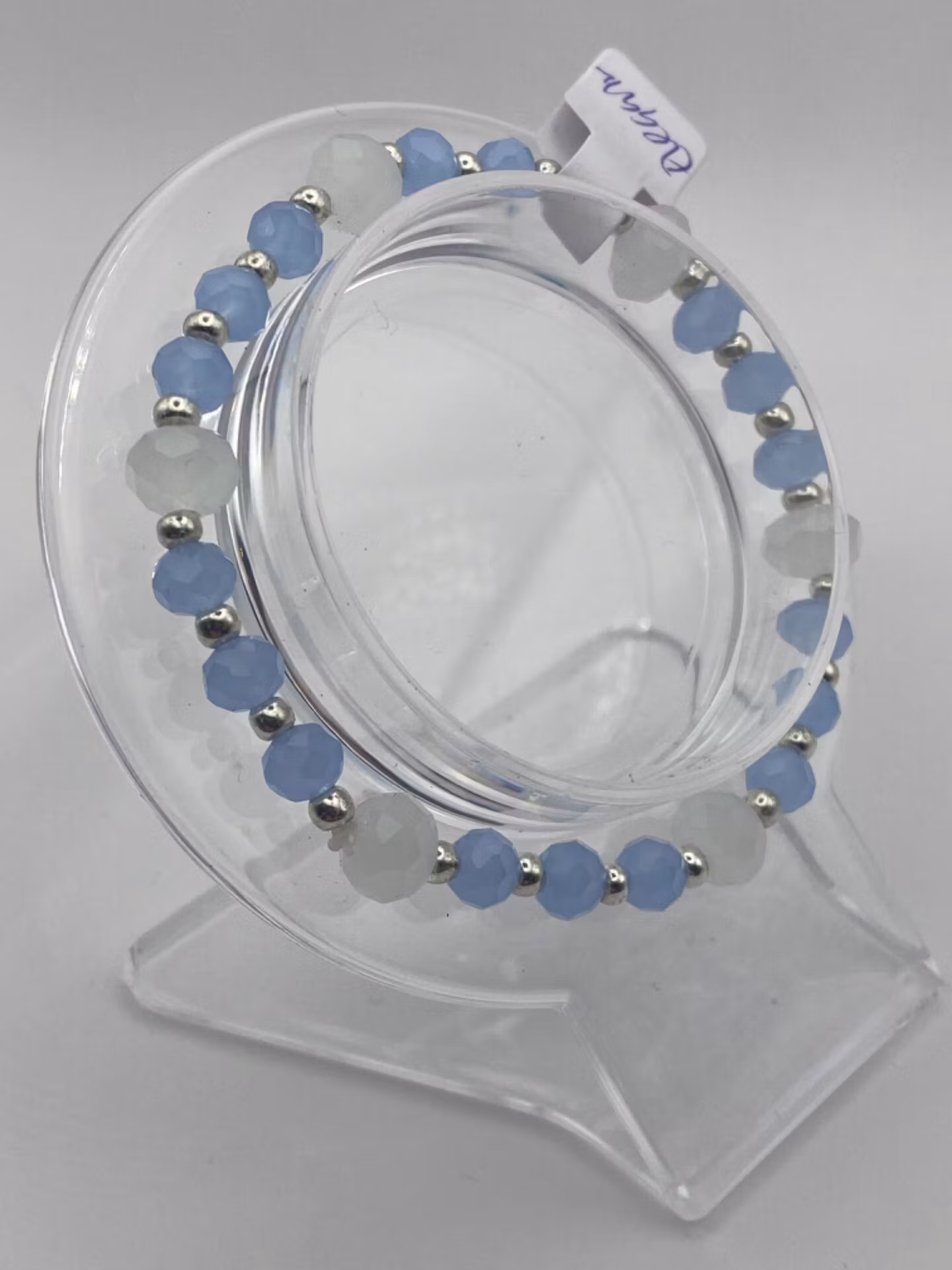 Elegant armband av ljust dimblå frostade pärlor varvat med silverfärgade pärlor och vita frostade glaspärlor