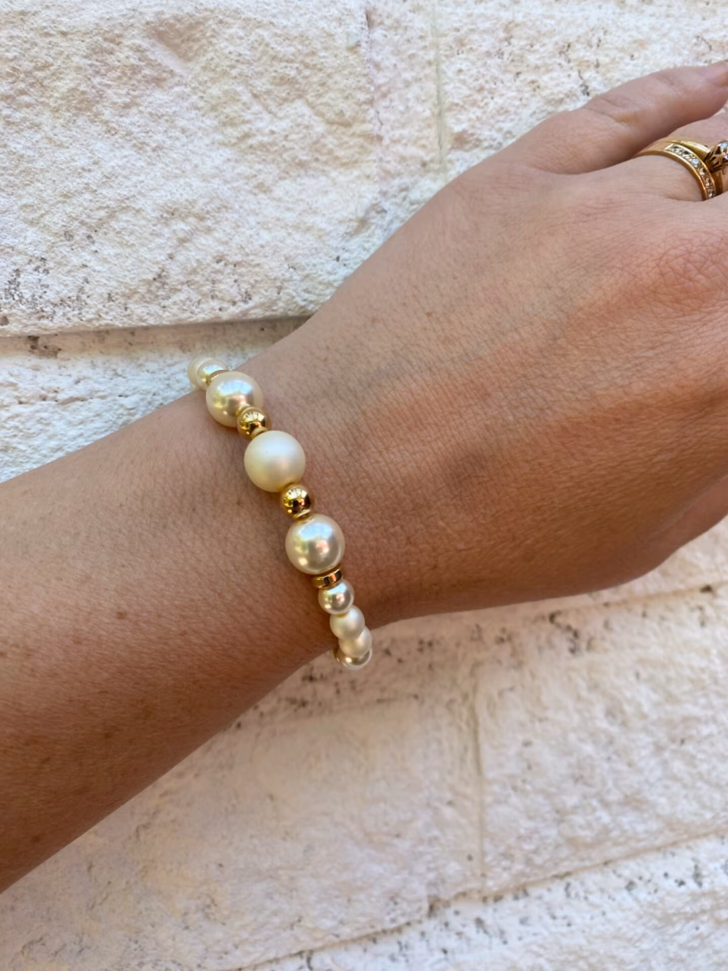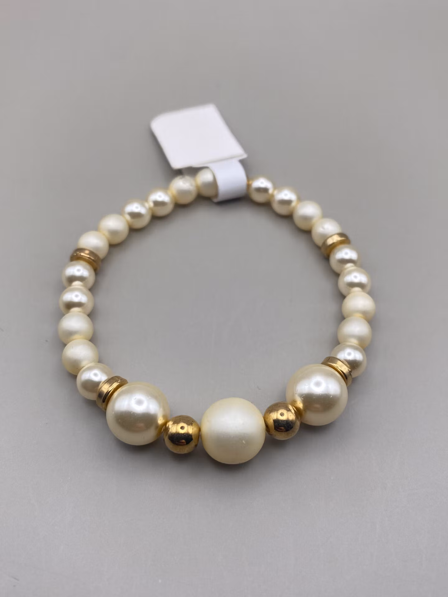 Armband i beiga blanka och matta pärlor, tre större pärlor i blickfånget, guldfärgade strassdetaljer
