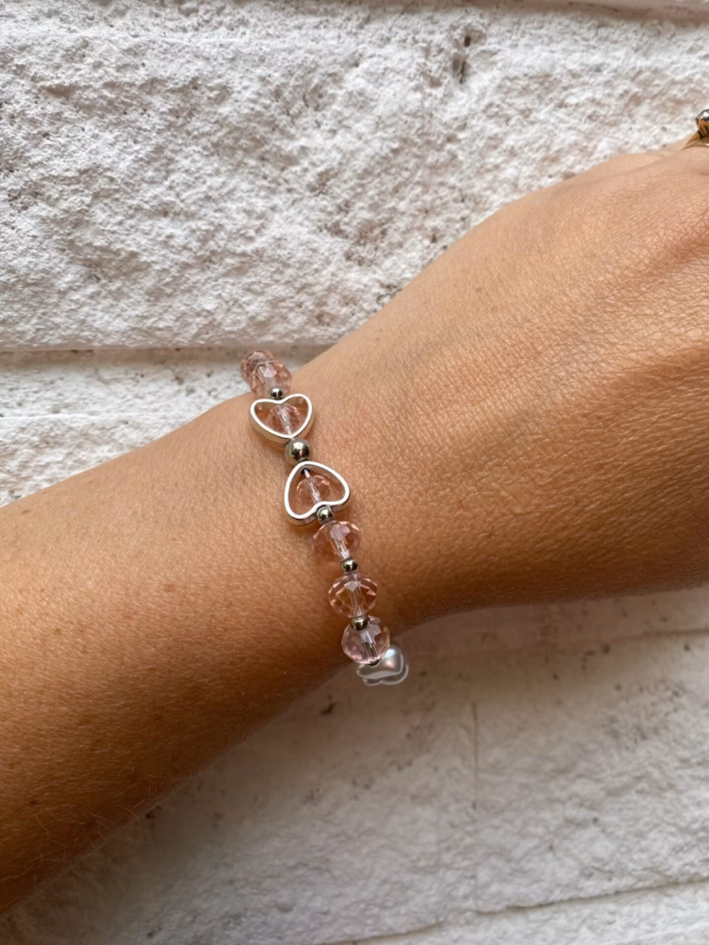 Elegant armband i kritvita oregelbundna vaxade pärlor, i blickfånget ser ni silverfärgarde hjärtan varvat med ljusgrosa glaspärlor och silverfärgade pärlorPärlo