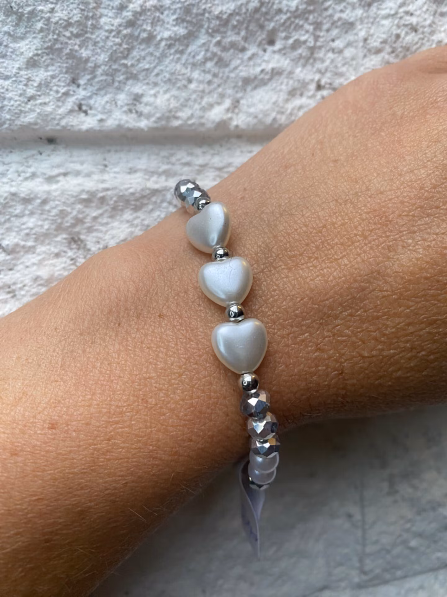 Elegant armband i varvat mönster av kritvita vaxade pärlor varvat med silverfärgade glaspärlor, tre vita vaxade hjärtan i blickfånget varvat med silverfärgade p