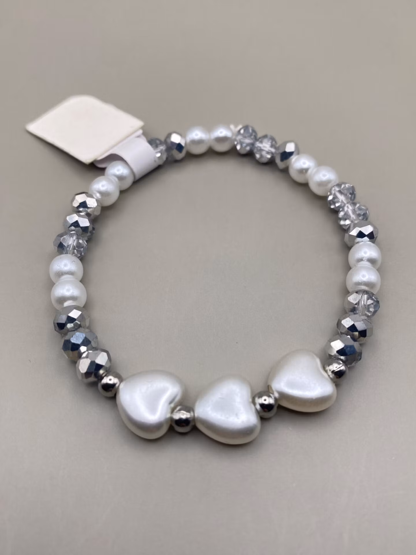 Elegant armband i varvat mönster av kritvita vaxade pärlor varvat med silverfärgade glaspärlor, tre vita vaxade hjärtan i blickfånget varvat med silverfärgade pärlor