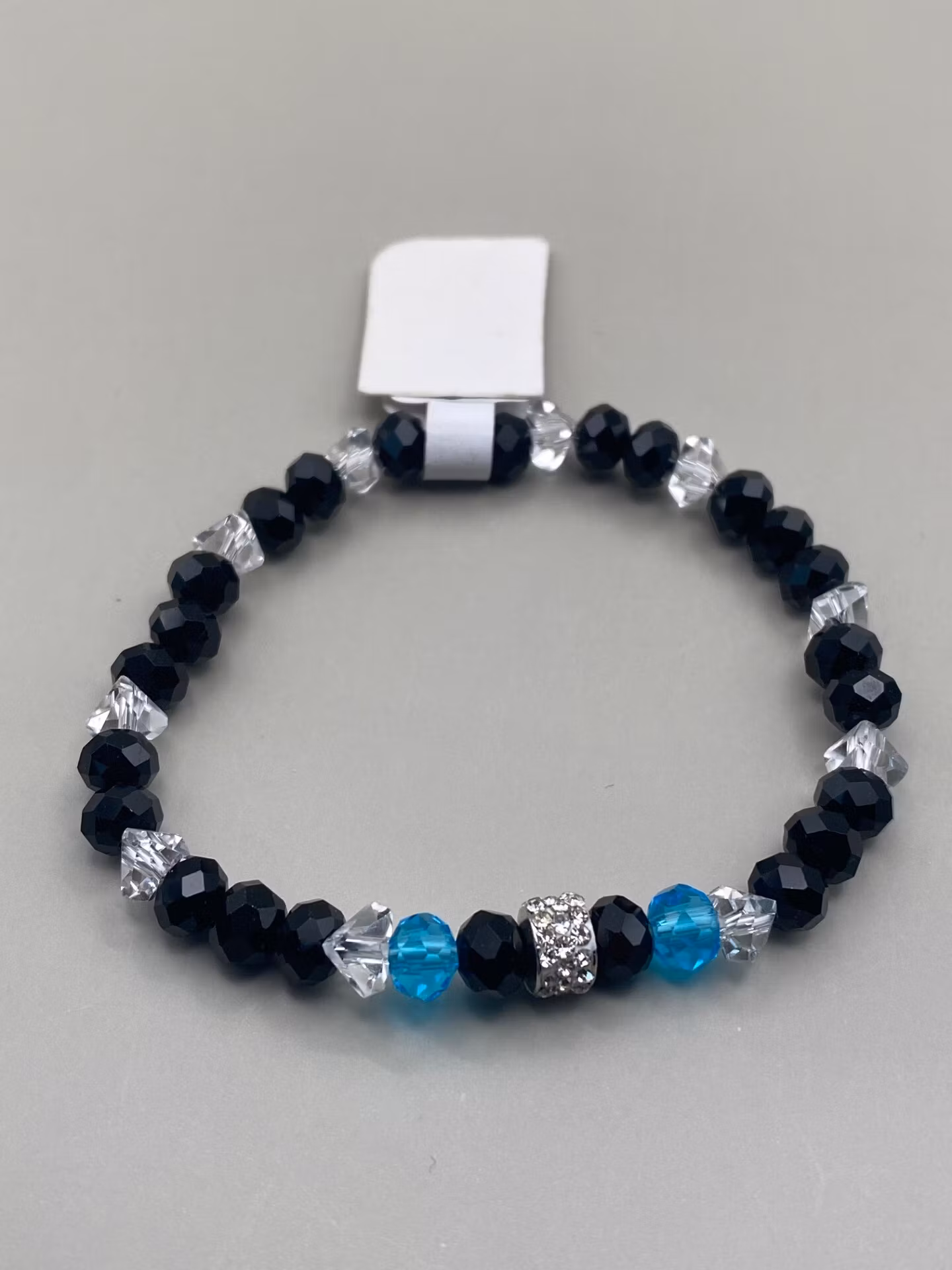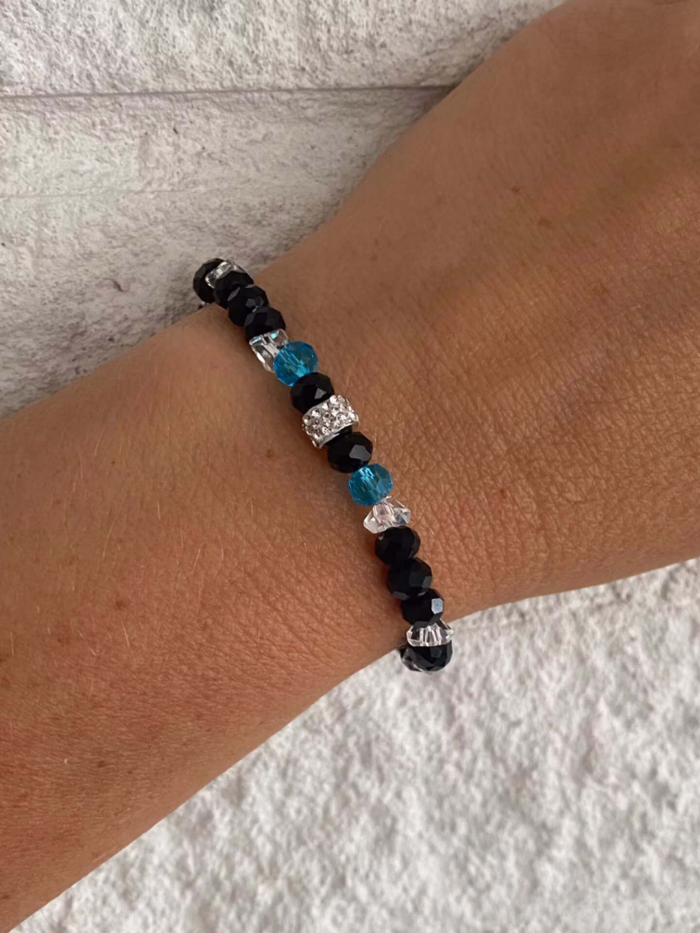 Elegant skimrande armband i varvat nattsvarta glansiga glaspärlor och genomskinliga ”glasskärvor”, turkosblå glasstenar och strass i blickfångetPärlor 6mmVisas